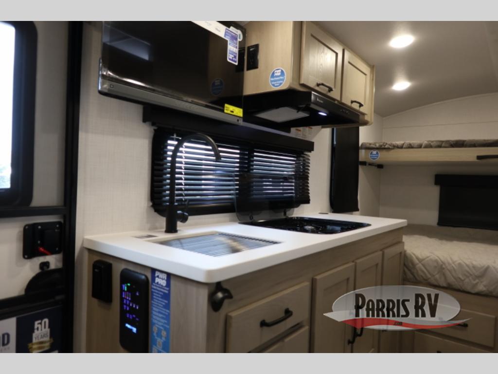 You'll love camping in this travel trailer that can sleep five each night. There is a front U-shaped dinette, a rear 54" x 74" full-size bed, plus a 26" x 80" flip-up bunk! A three burner cooktop and microwave oven let you create your best meals, and there is a 15' power awning and an exterior griddle if you want to cook outdoors. The full bath gives you privacy when freshening up after a day outdoors, and you'll find plenty of storage space in this unit, including in the overhead cabinets and the exterior pass-thru storage!