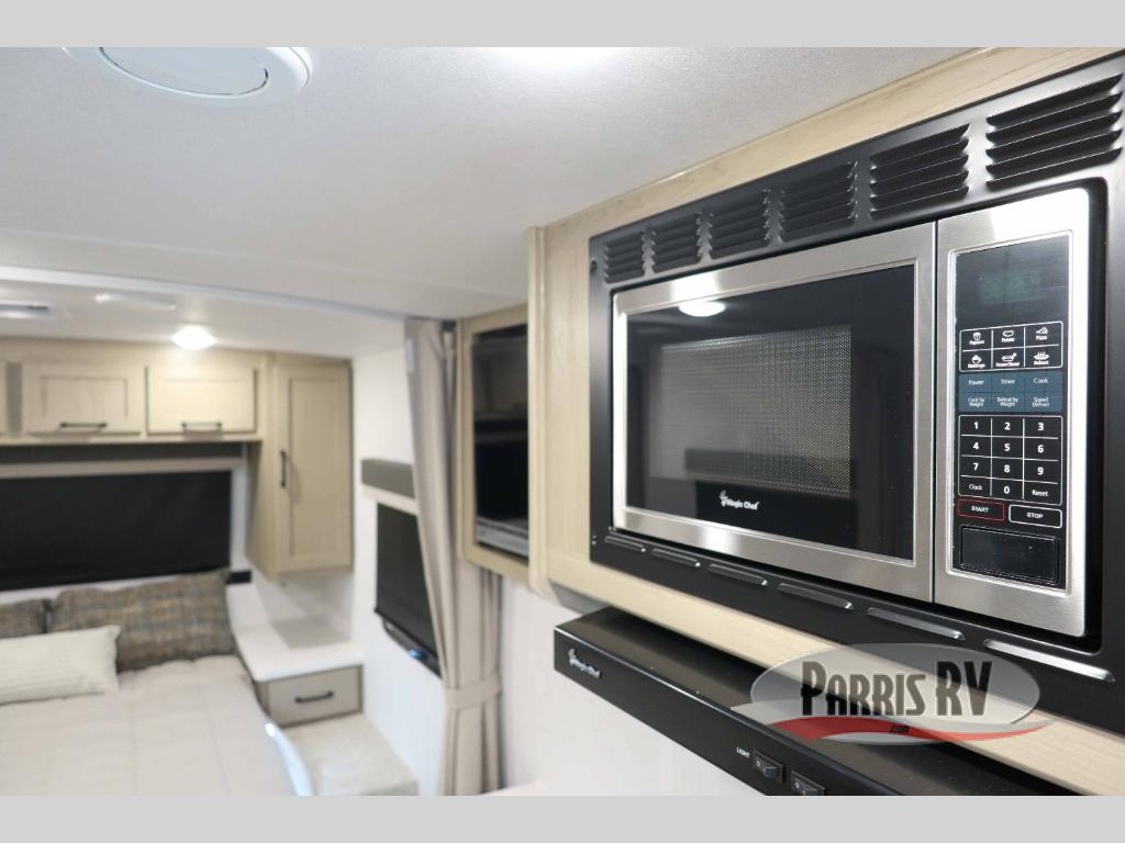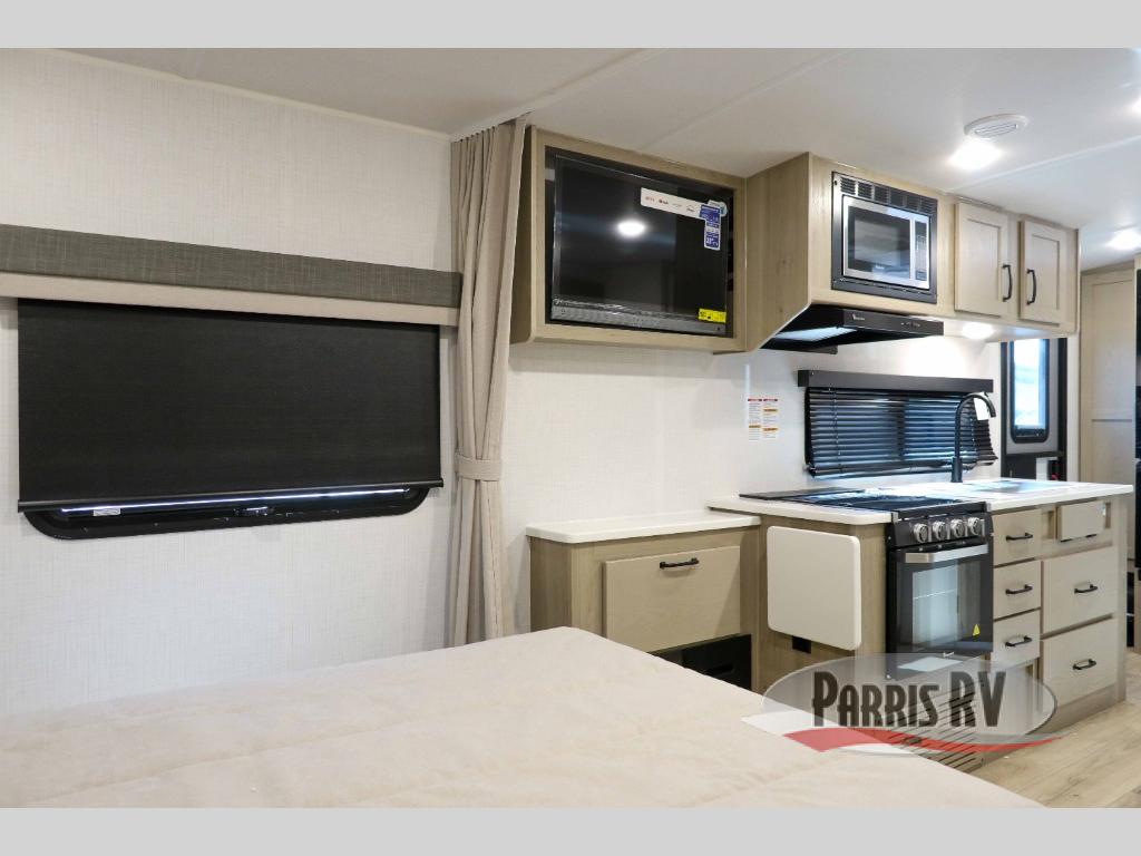 Enjoy the camping season with your spouse, friend, or significant other in this cozy travel trailer for two. Each morning, you can have your coffee on the 67" theater seats with a table within the slide out, then head outdoors to make pancakes on the outdoor griddle with an LP hookup. The interior kitchen includes a three burner cooktop, a microwave oven, plus a 12 volt refrigerator for perishables. An entertainment center with a fireplace will make your space feel more like home, and what's better than sleeping on your own queen bed with dual bedroom wardrobes for your clothes!?