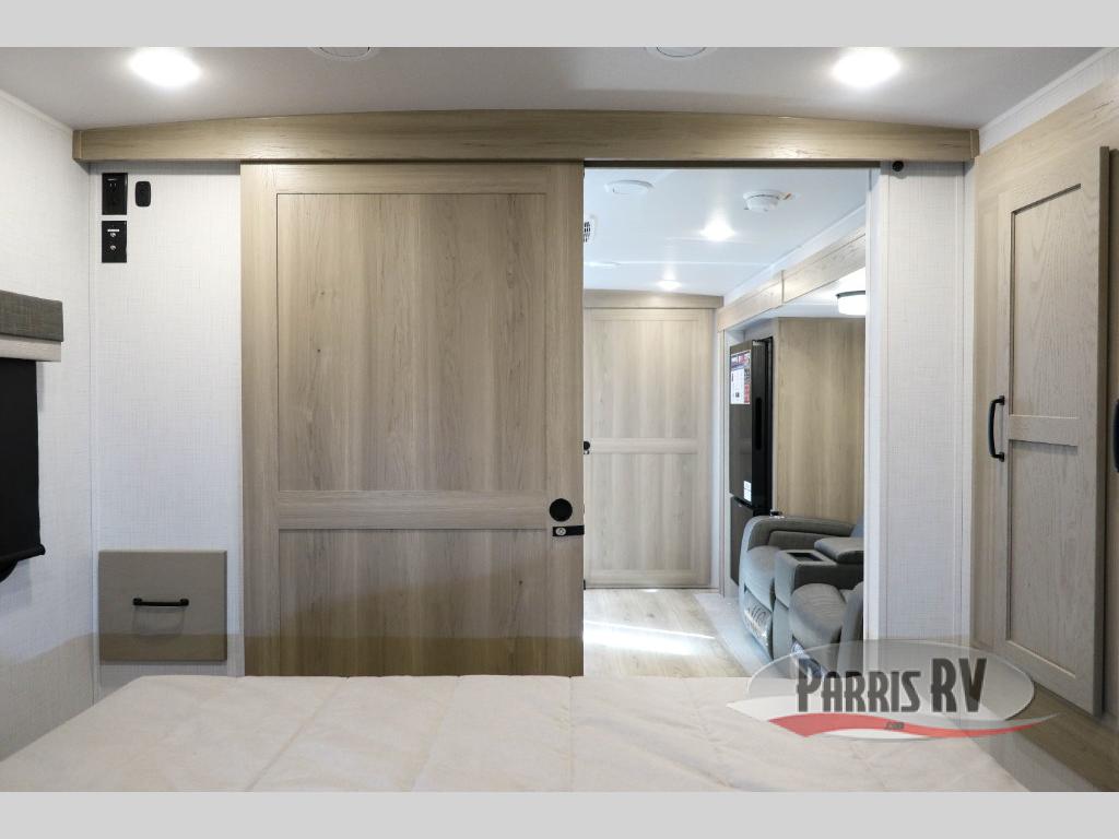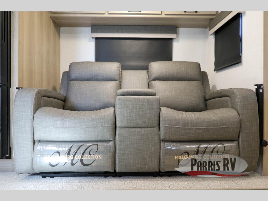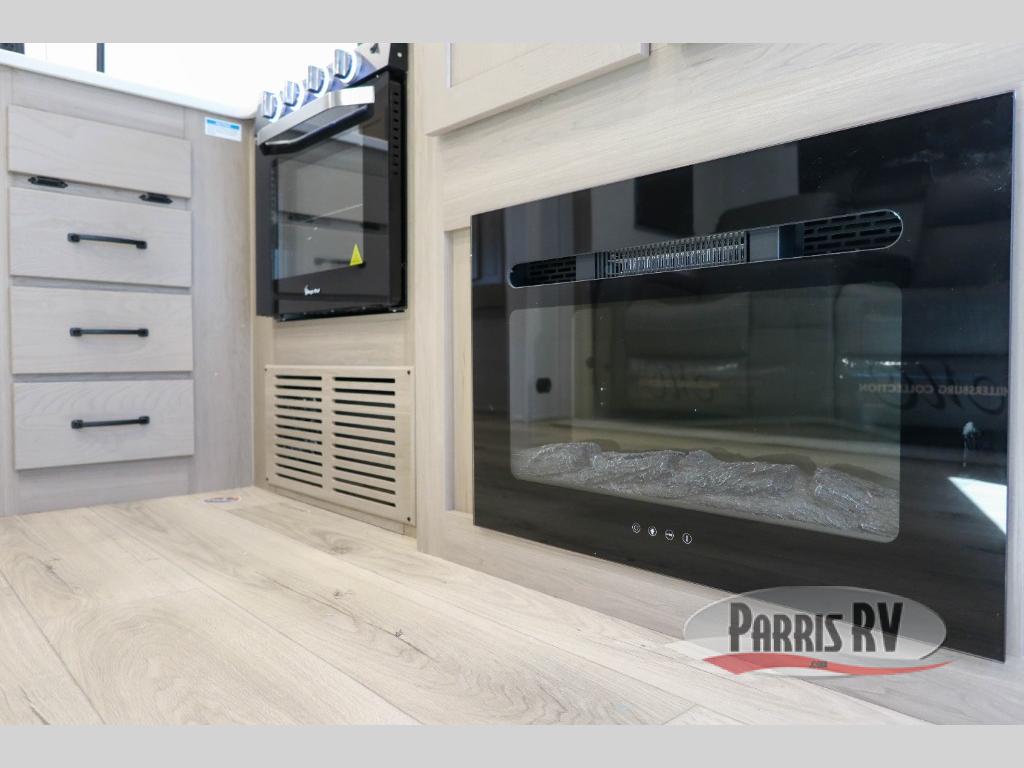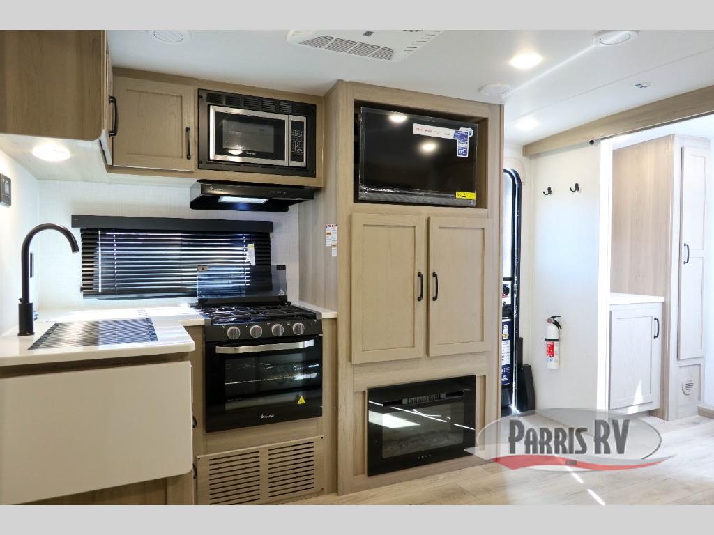 Camping trips to the lake just got sweeter with this dual slide out travel trailer in tow! Once you arrive, unload your gear from the exterior drop-frame pass-through storage, then start lunch on the exterior griddle. If you need a rest after traveling all day, the RV queen bed in the front bedroom is sure to give you comfort, or you can relax on the theater seating. The fireplace and entertainment center with a 32" TV will make this space feel just like home, and check out the spacious full rear bath for added privacy. This model also includes an entryway closet/pantry for jackets, shoes, and food!