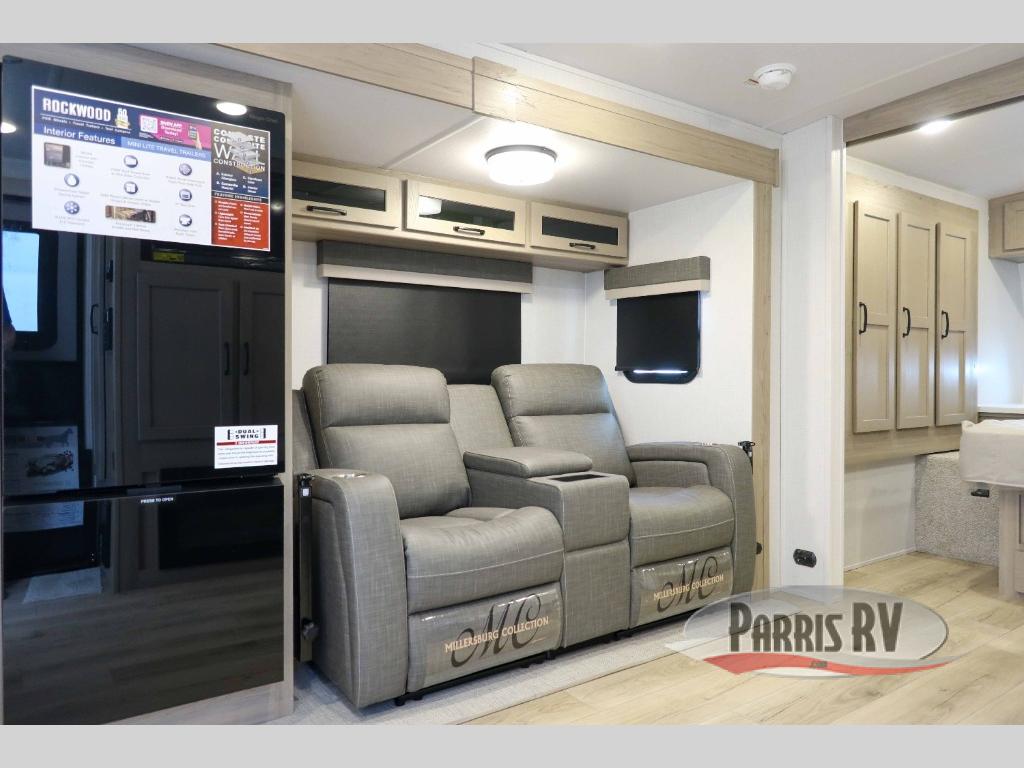 Camping trips to the lake just got sweeter with this dual slide out travel trailer in tow! Once you arrive, unload your gear from the exterior drop-frame pass-through storage, then start lunch on the exterior griddle. If you need a rest after traveling all day, the RV queen bed in the front bedroom is sure to give you comfort, or you can relax on the theater seating. The fireplace and entertainment center with a 32" TV will make this space feel just like home, and check out the spacious full rear bath for added privacy. This model also includes an entryway closet/pantry for jackets, shoes, and food!