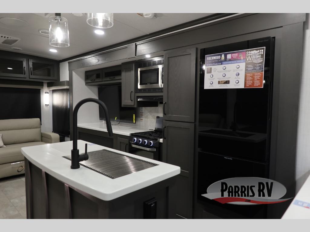 With any Rockwood Signature fifth wheel or travel trailer by Forest River RV, you will enjoy superior construction that includes laminated white fiberglass sidewalls, a radius roof with vaulted interior ceilings, plus radiant foil insulation and an enclosed underbelly for use in all types of weather. Some convenient exterior features include Keyed Alike locks, a rear ladder, a 200W solar panel, and a tire pressure monitor system with a monitor for added safety. The interior offers a One Touch OneControl panel with WeRV app control, for lights, awning, slides, water heater and more, and the Air 360+ omnidirectional antenna with WiFi prep lets you work while away from home if needed. You will also appreciate the interior vaulted ceilings, residential soft close doors and drawers, solid surface kitchen countertops, and designer kitchen backsplash!