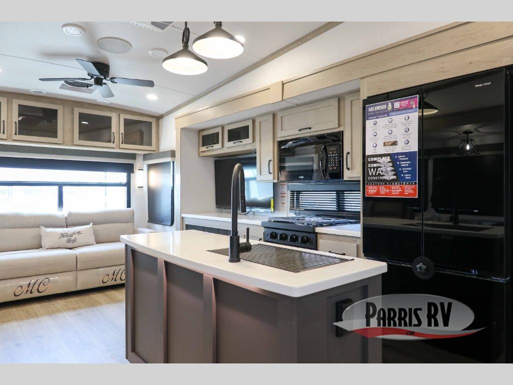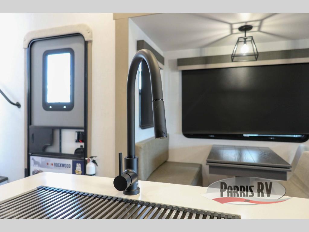 With any Rockwood Signature fifth wheel or travel trailer by Forest River RV, you will enjoy superior construction that includes laminated white fiberglass sidewalls, a radius roof with vaulted interior ceilings, plus radiant foil insulation and an enclosed underbelly for use in all types of weather. Some convenient exterior features include Keyed Alike locks, a rear ladder, a 200W solar panel, and a tire pressure monitor system with a monitor for added safety. The interior offers a One Touch OneControl panel with WeRV app control, for lights, awning, slides, water heater and more, and the Air 360+ omnidirectional antenna with WiFi prep lets you work while away from home if needed. You will also appreciate the interior vaulted ceilings, residential soft close doors and drawers, solid surface kitchen countertops, and designer kitchen backsplash!