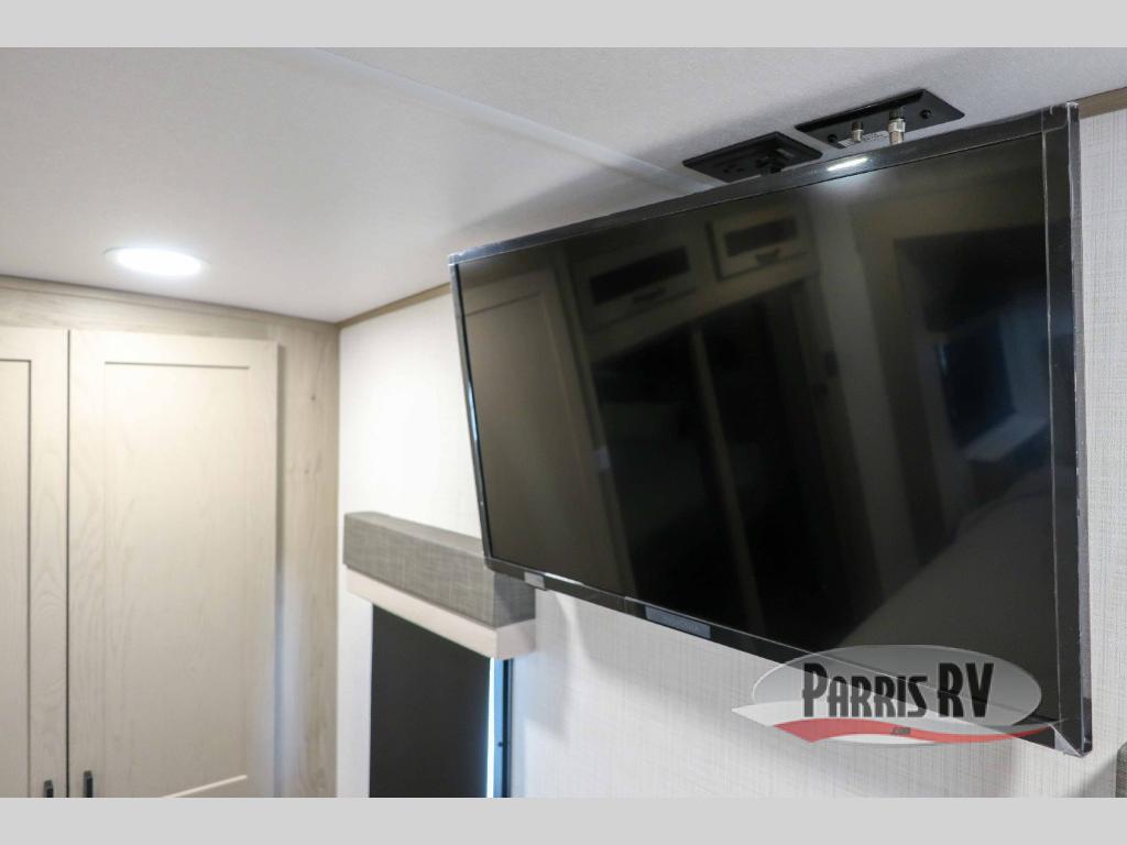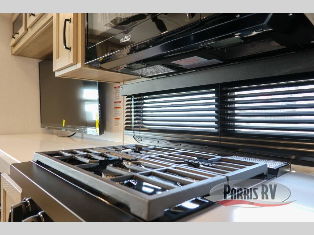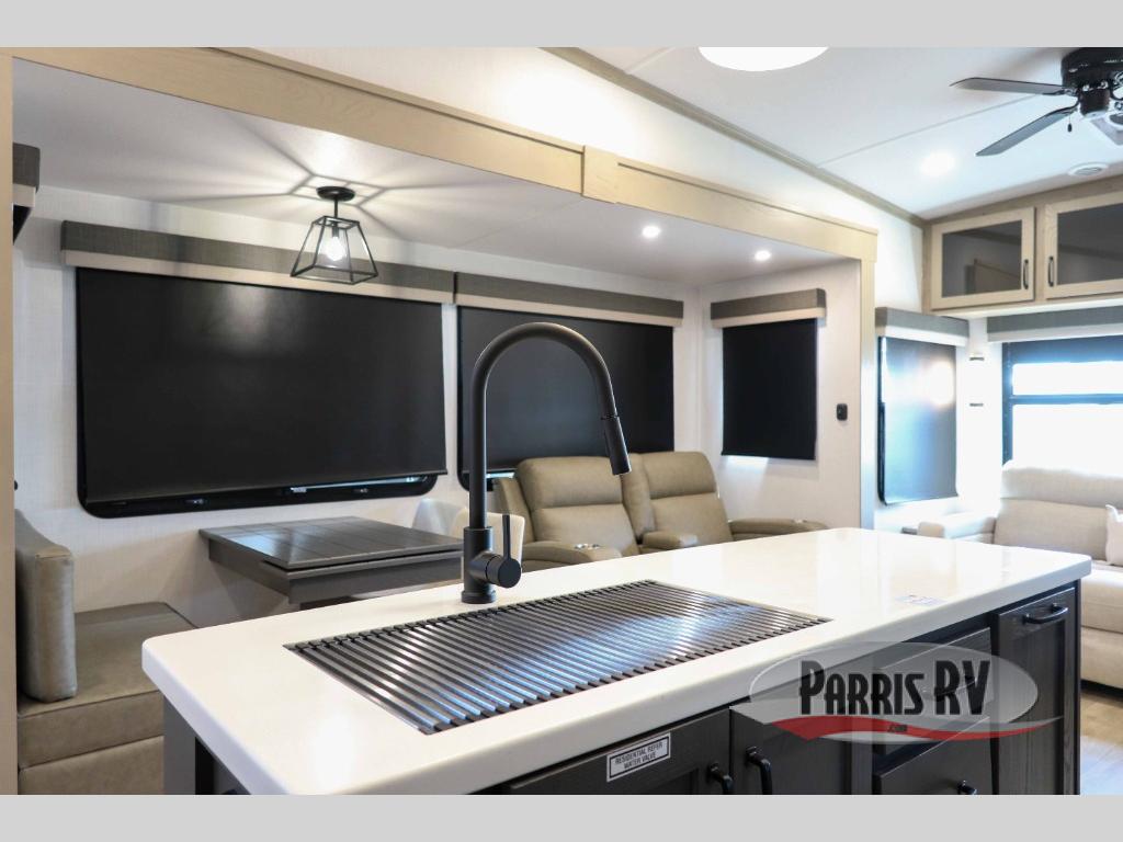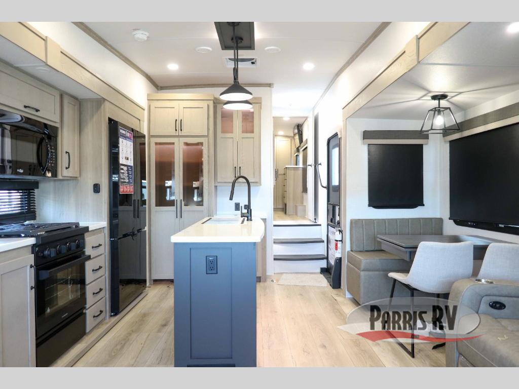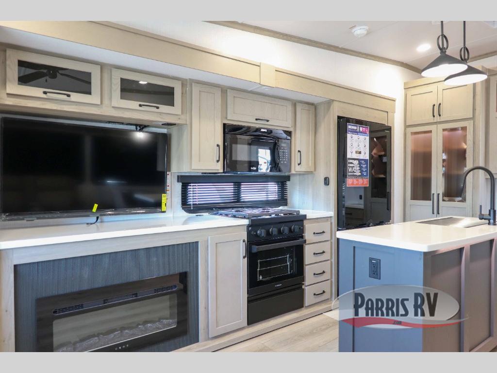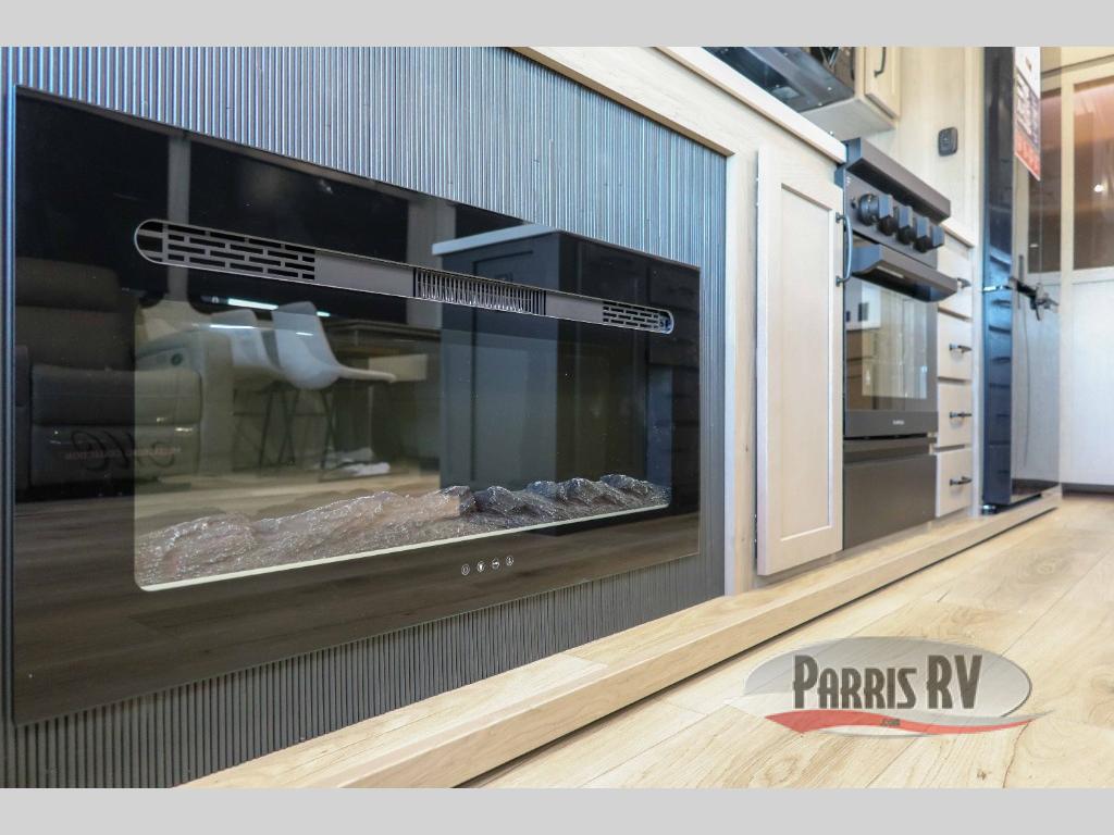 You can enjoy views from inside or outside each day once this RV is set up at the campgrounds! The large windows in the furniture slide and the windows throughout allow you to take in the scenery, and the three slide outs give you a spacious main living and kitchen area as well as front bedroom. You will find lots of seating for guests on the hide-a-bed sofa in the rear, and on the theater seats and booth dinette in the slide. The cook will love the 12V refrigerator and large pantry to store food, and everyone can enjoy the Smart TV and fireplace when visiting and relaxing. The front bedroom offers a king bed slide, a front wardrobe, plus washer and dryer prep if you choose to add those appliances.