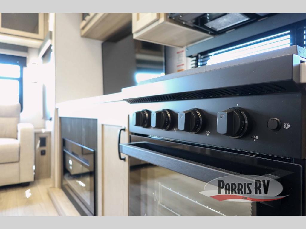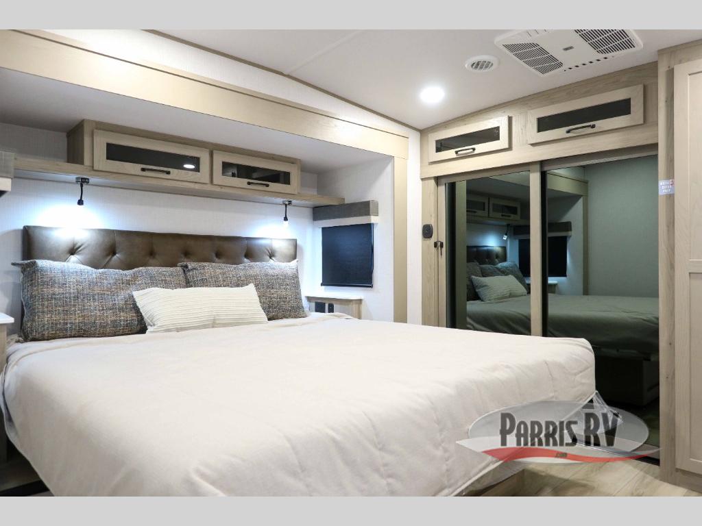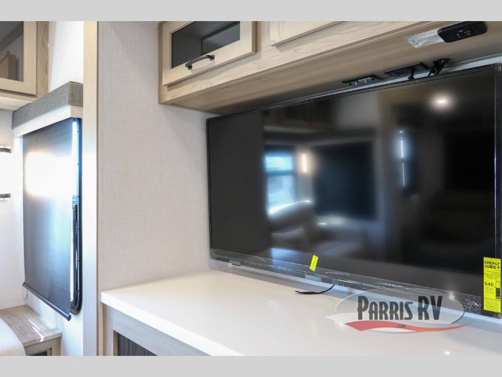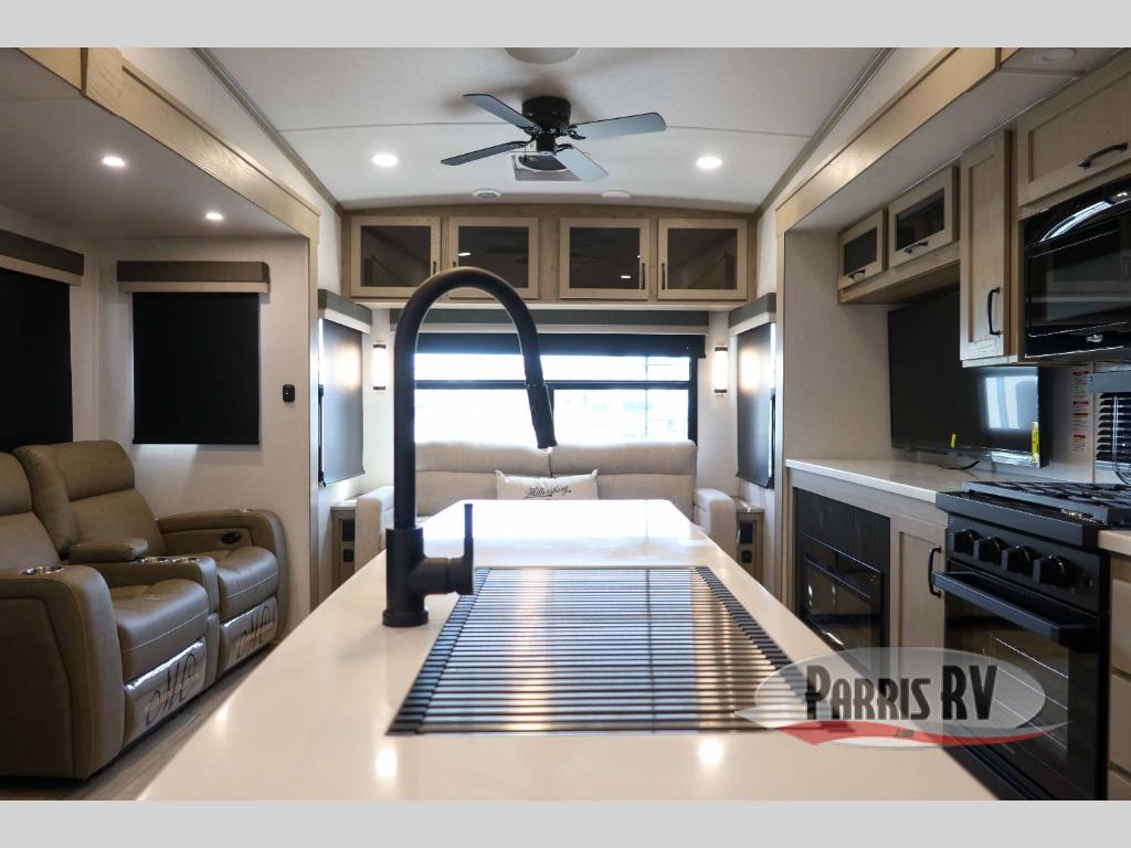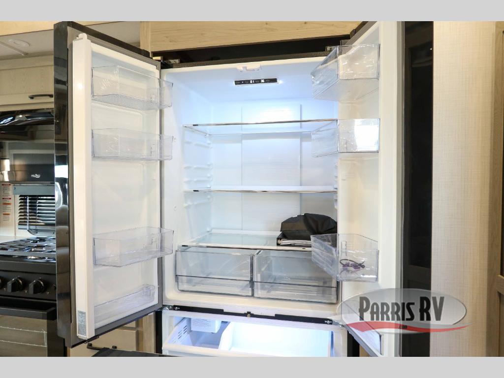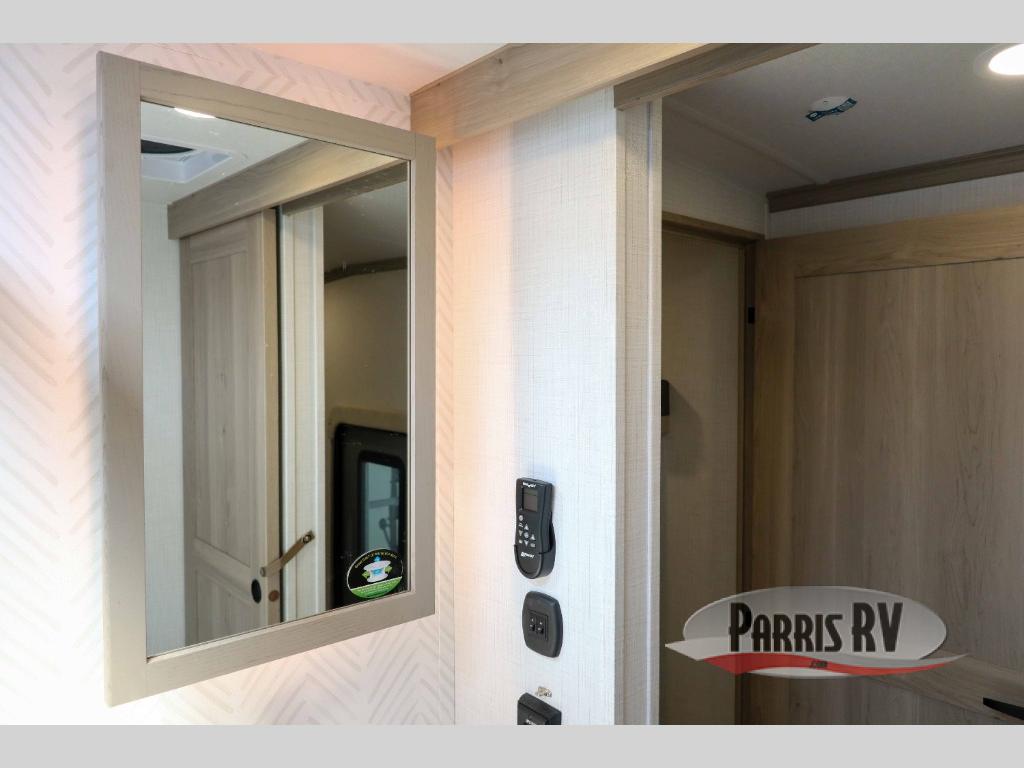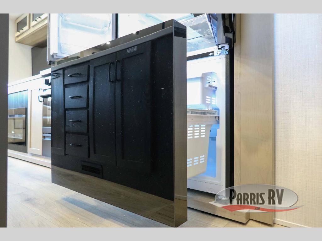 You can enjoy views from inside or outside each day once this RV is set up at the campgrounds! The large windows in the furniture slide and the windows throughout allow you to take in the scenery, and the three slide outs give you a spacious main living and kitchen area as well as front bedroom. You will find lots of seating for guests on the hide-a-bed sofa in the rear, and on the theater seats and booth dinette in the slide. The cook will love the 12V refrigerator and large pantry to store food, and everyone can enjoy the Smart TV and fireplace when visiting and relaxing. The front bedroom offers a king bed slide, a front wardrobe, plus washer and dryer prep if you choose to add those appliances.