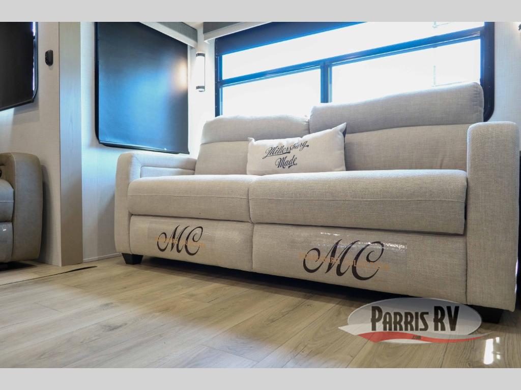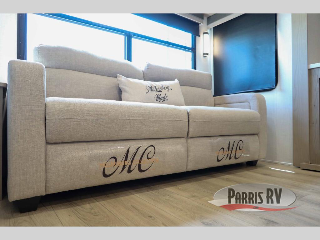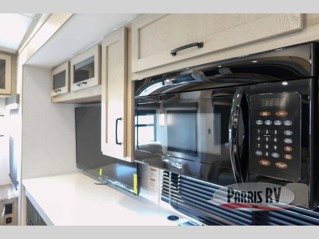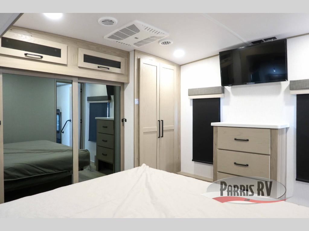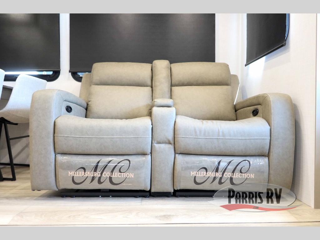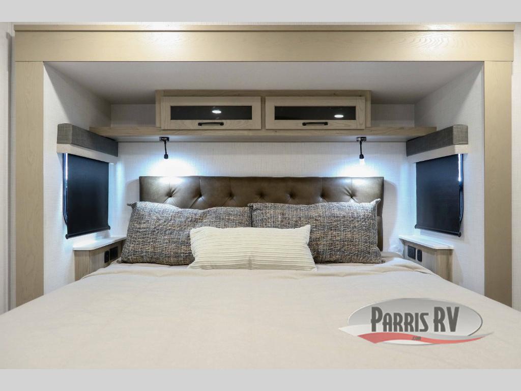You can enjoy views from inside or outside each day once this RV is set up at the campgrounds! The large windows in the furniture slide and the windows throughout allow you to take in the scenery, and the three slide outs give you a spacious main living and kitchen area as well as front bedroom. You will find lots of seating for guests on the hide-a-bed sofa in the rear, and on the theater seats and booth dinette in the slide. The cook will love the 12V refrigerator and large pantry to store food, and everyone can enjoy the Smart TV and fireplace when visiting and relaxing. The front bedroom offers a king bed slide, a front wardrobe, plus washer and dryer prep if you choose to add those appliances.