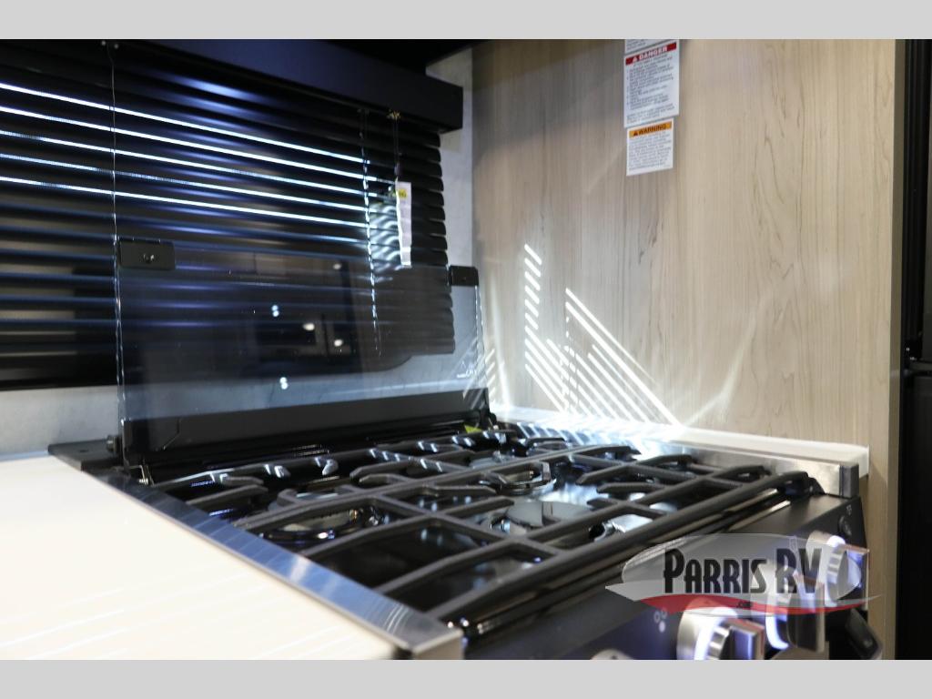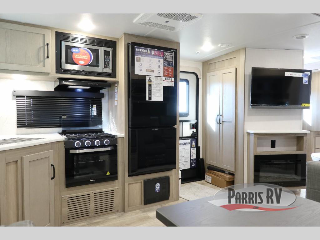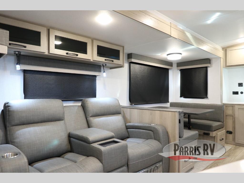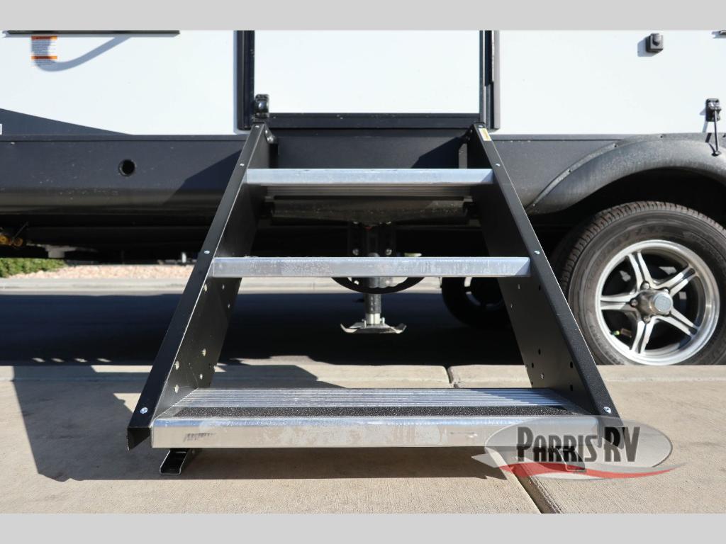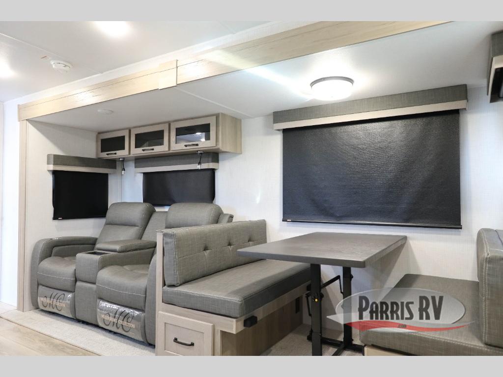 When you are outside this trailer you can enjoy the protection from the 21' power awning, and whip up a meal using the outside griddle. You will find exterior storage for your extra gear, and a ladder at the rear. You get to choose which entrance to step up into, be it the spacious rear bedroom with a queen bed slide and a wardrobe, or the main entry into the kitchen and living area. The furniture slide includes a booth dinette to eat your meals at, and theater seating to watch the Smart TV with a fireplace below. And the cook will love the front kitchen with extra counter space, a three burner range, plus a 12V refrigerator and pantry for food storage!