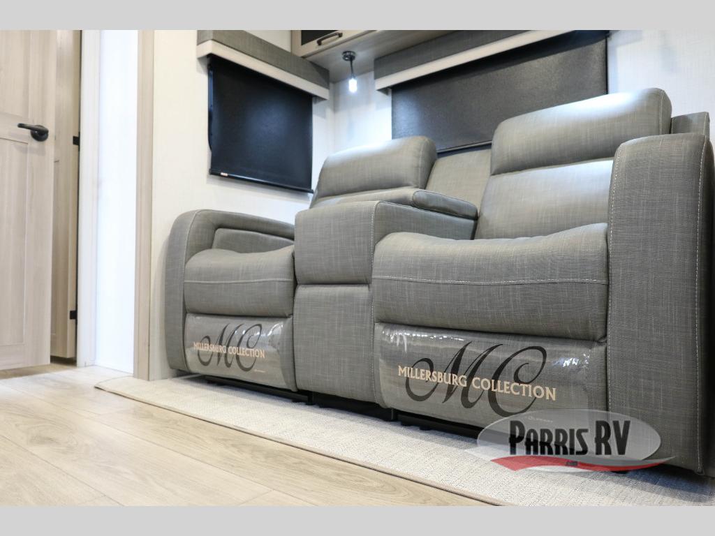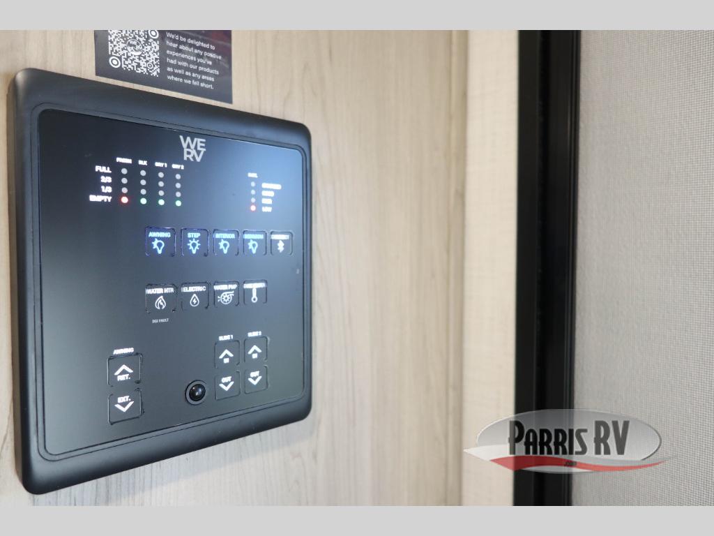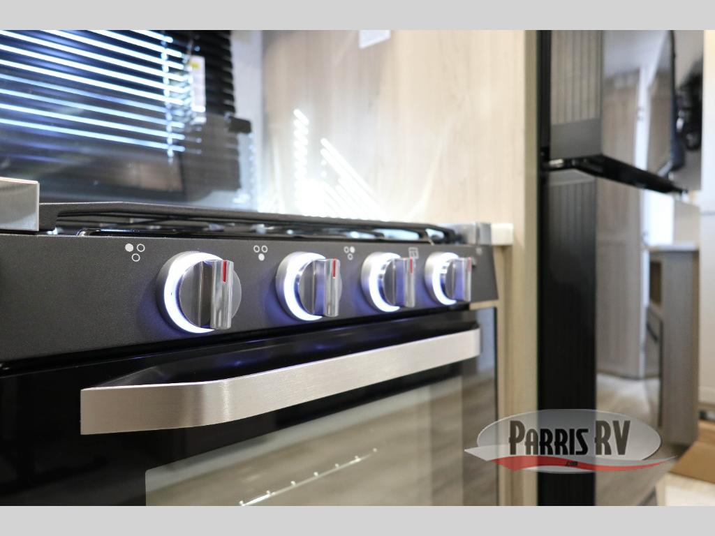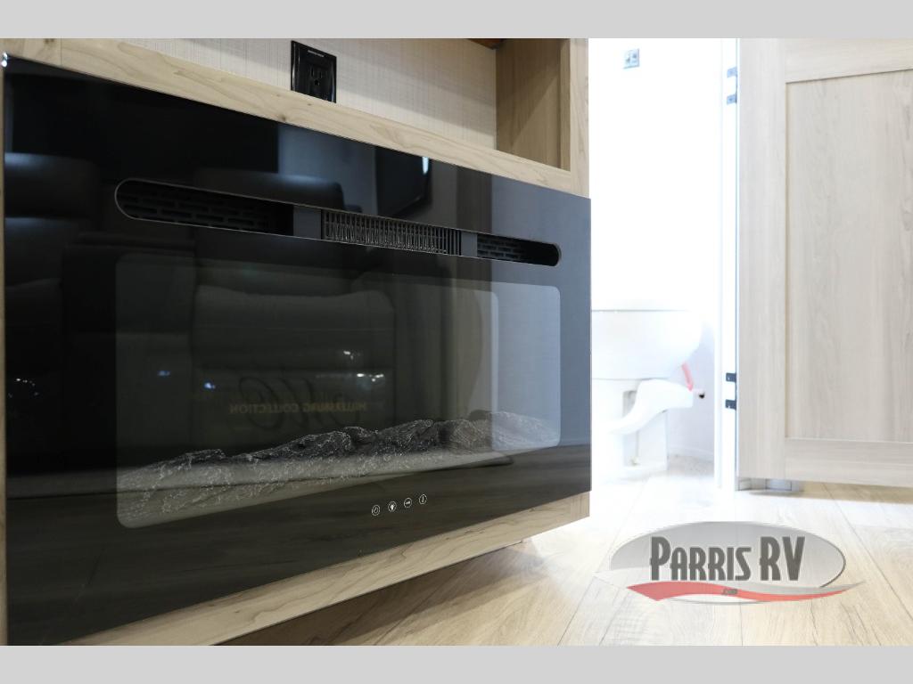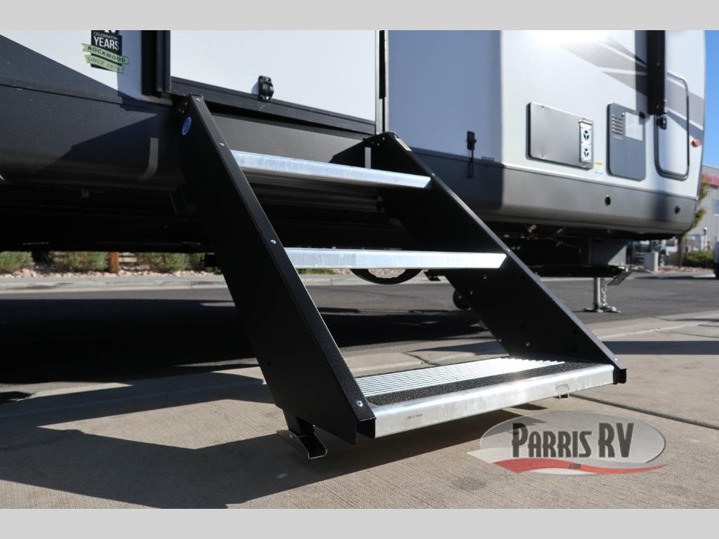 When you are outside this trailer you can enjoy the protection from the 21' power awning, and whip up a meal using the outside griddle. You will find exterior storage for your extra gear, and a ladder at the rear. You get to choose which entrance to step up into, be it the spacious rear bedroom with a queen bed slide and a wardrobe, or the main entry into the kitchen and living area. The furniture slide includes a booth dinette to eat your meals at, and theater seating to watch the Smart TV with a fireplace below. And the cook will love the front kitchen with extra counter space, a three burner range, plus a 12V refrigerator and pantry for food storage!