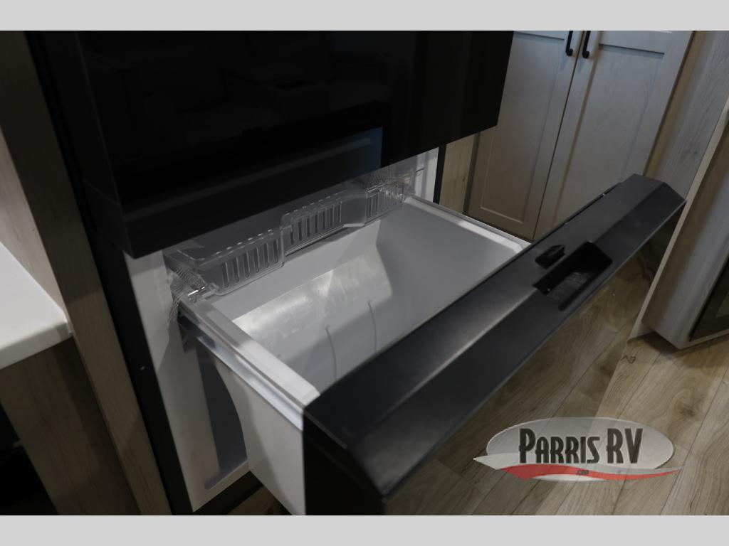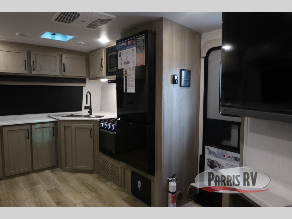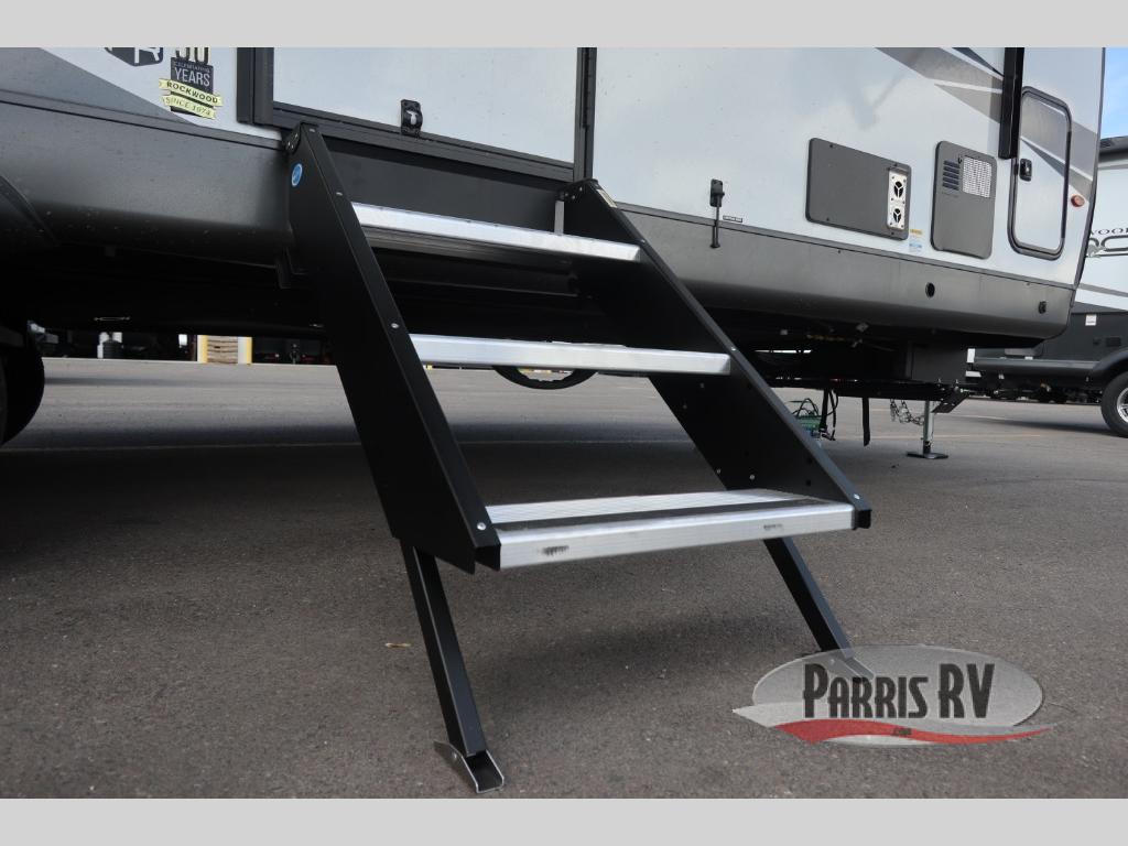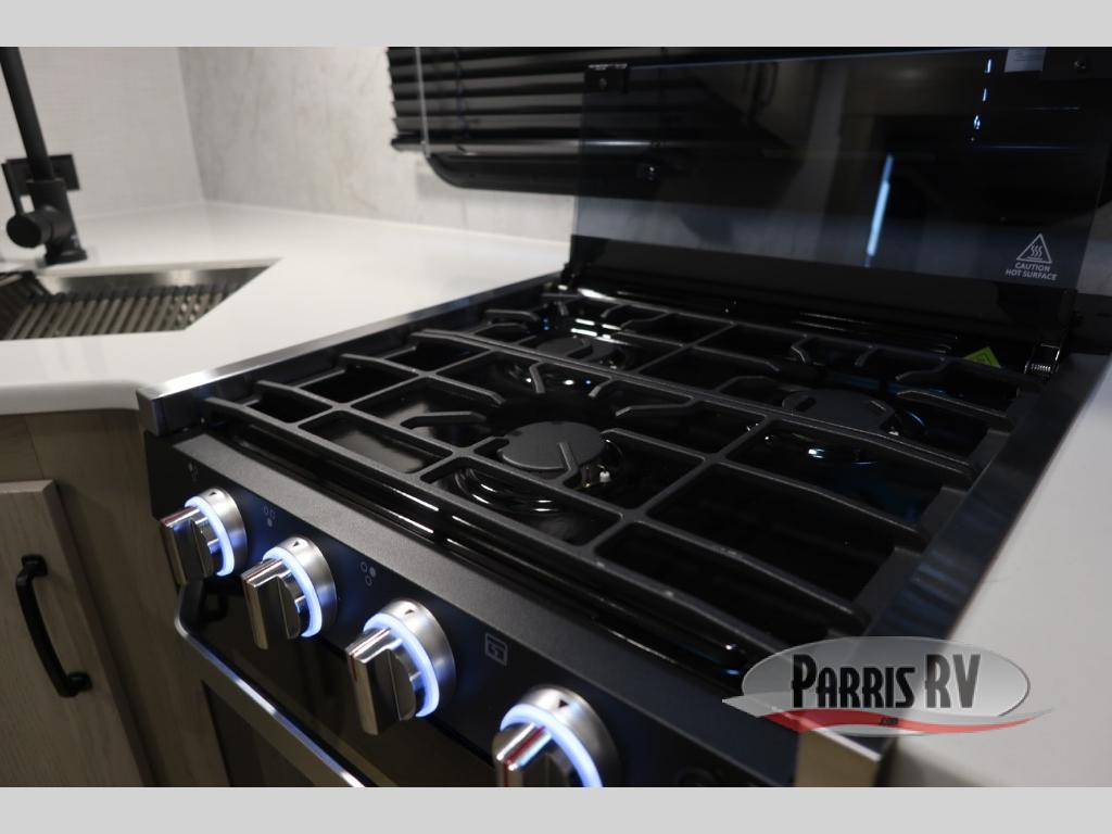 When you are outside this trailer you can enjoy the protection from the 21' power awning, and whip up a meal using the outside griddle. You will find exterior storage for your extra gear, and a ladder at the rear. You get to choose which entrance to step up into, be it the spacious rear bedroom with a queen bed slide and a wardrobe, or the main entry into the kitchen and living area. The furniture slide includes a booth dinette to eat your meals at, and theater seating to watch the Smart TV with a fireplace below. And the cook will love the front kitchen with extra counter space, a three burner range, plus a 12V refrigerator and pantry for food storage!