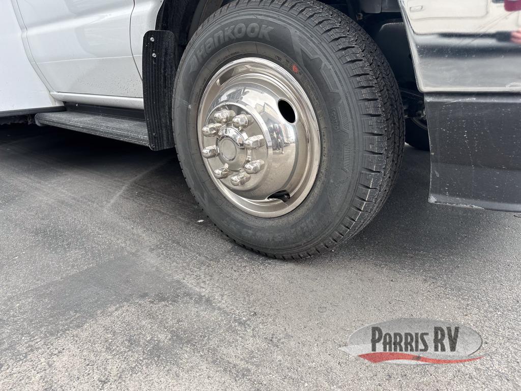 Start traveling in true luxury with this motorhome! The corner queen bed offers a comfortable night's rest, and is conveniently next to the rear corner bathroom which has a 24" x 32" shower and a vanity sink just outside it next to a wardrobe. Keep your bellies full with home cooked meals prepared with the three burner cooktop, the 10.7 cu. ft. 12V refrigerator, and use the flip-up countertop for more counter space. You can eat your meals at the U-shaped dinette and transform it into an extra sleeping space too. The 60" x 80" bunk over cab also offers a comfortable sleeping space with a 12V TV for entertainment! This model is also available with a Chevy 3500 chassis; see model 22N Chevy for more details.