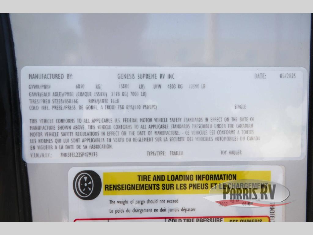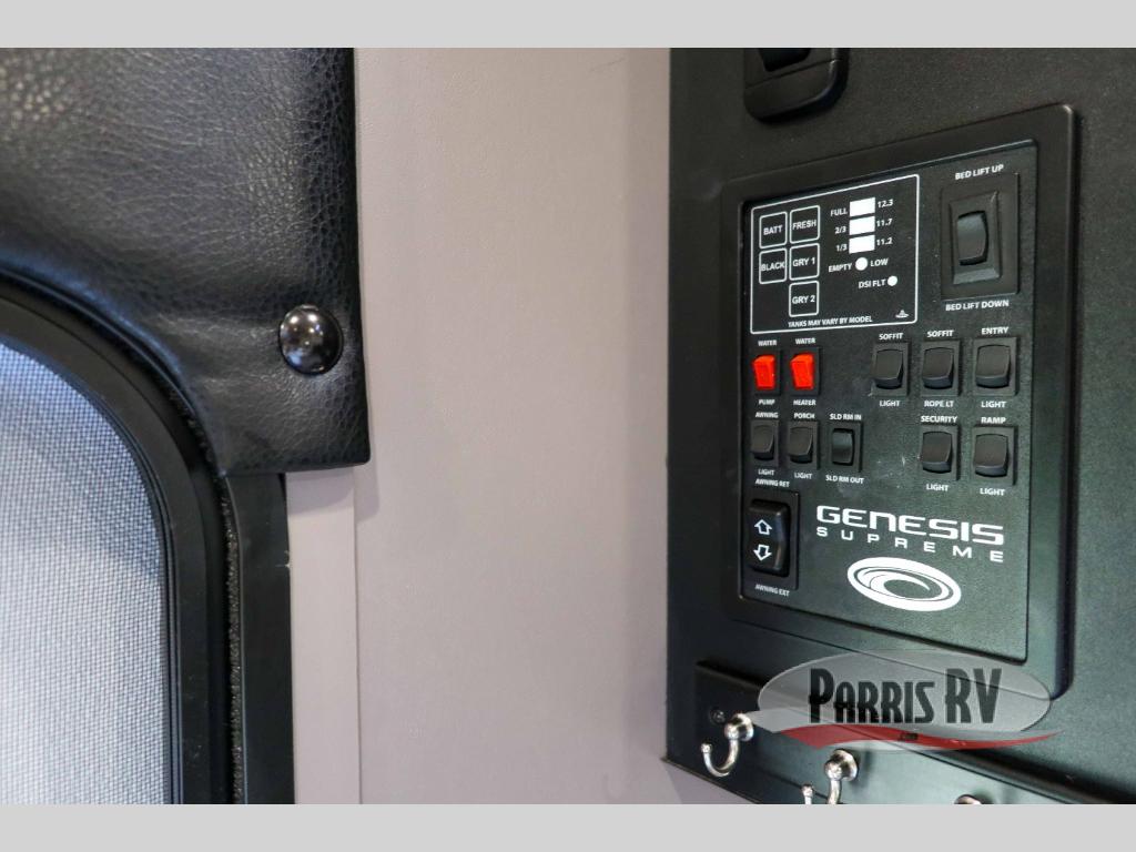 Your camping life is going to be a blast with the Genesis Supreme Vortex toy hauler! These work horses get the job done but also make it fun. You will be able to use the 40-gallon fuel station to gas up your toys when you come back from the trails, and the power awning with LED lights will give you protection as you use the exterior features. The 16" deluxe aluminum alloy wheels will get you to and from your destination with confidence, and the 30,000 or 35,000 BTU furnace will ensure that you don't freeze while you sleep on cool nights. You can keep power flowing with the 4.0kW generator with transfer switch, and you'll also enjoy the function and the style of the solid-surface countertops in the kitchen.