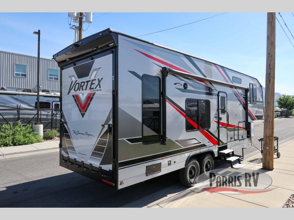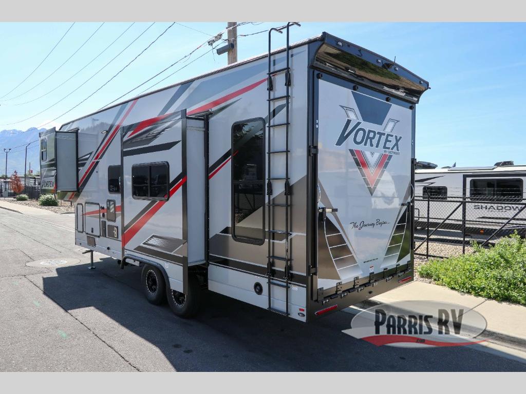 This unit is just like model 2815, except features a higher profile with plenty of room. You can store your ATVs in the 15' 11" garage on this Vortex toy hauler and use the 7' laminated ramp door with beaver tail to get them out. For other gear, there are slam-door storage compartments, and you'll also be able to put fresh products in the 6-cubic foot double-door refrigerator. When you get hungry, use the three-burner range to make a fresh batch of French toast, and when you get tired, use the RV queen bed, power queen bunk, and sofa bed to get some rest. You can also add space to the interior by adding the two optional slides.