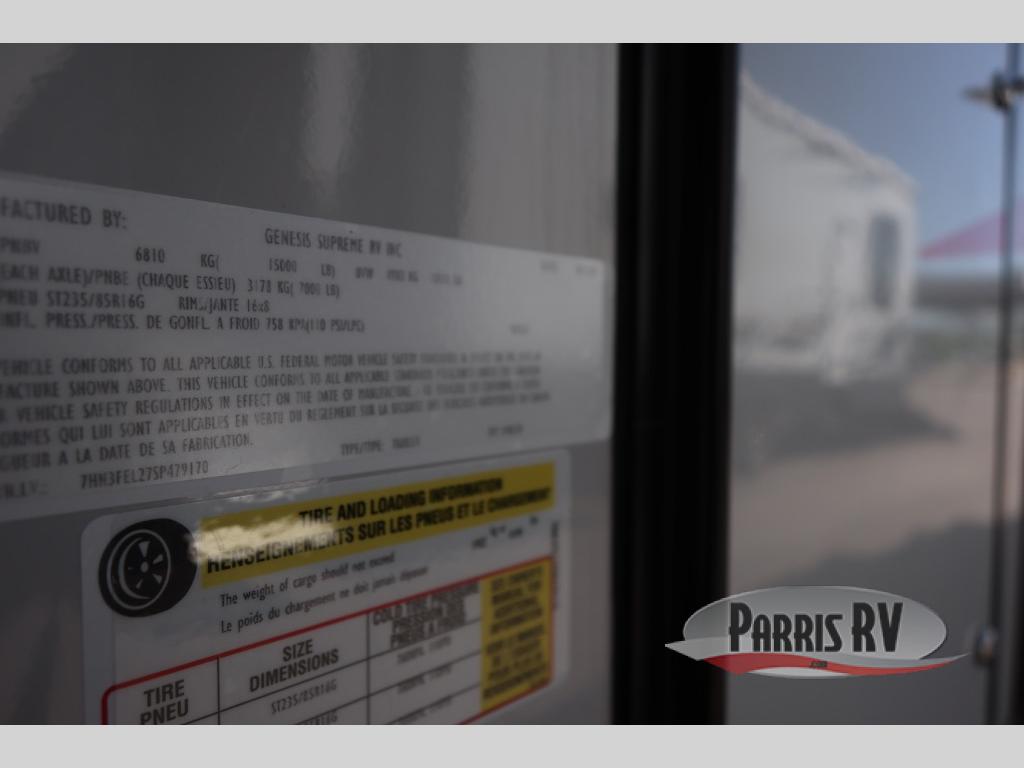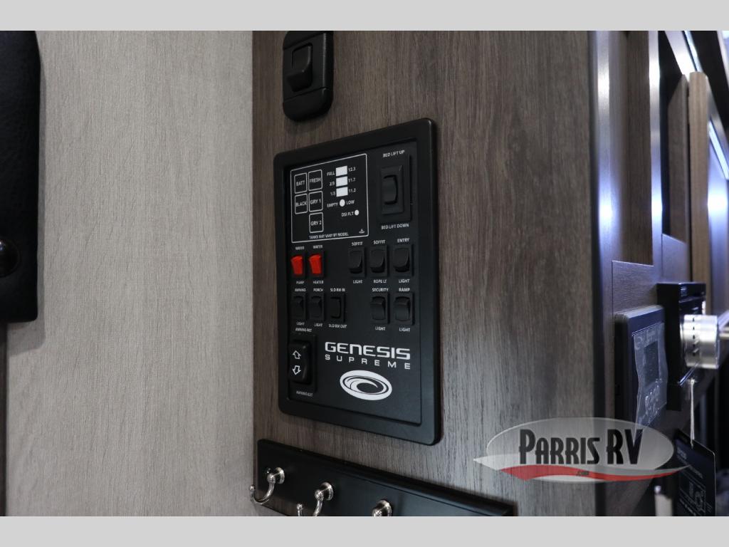 Your camping life is going to be a blast with the Genesis Supreme Vortex toy hauler! These work horses get the job done but also make it fun. You will be able to use the 40-gallon fuel station to gas up your toys when you come back from the trails, and the power awning with LED lights will give you protection as you use the exterior features. The 16" deluxe aluminum alloy wheels will get you to and from your destination with confidence, and the 30,000 or 35,000 BTU furnace will ensure that you don't freeze while you sleep on cool nights. You can keep power flowing with the 4.0kW generator with transfer switch, and you'll also enjoy the function and the style of the solid-surface countertops in the kitchen.