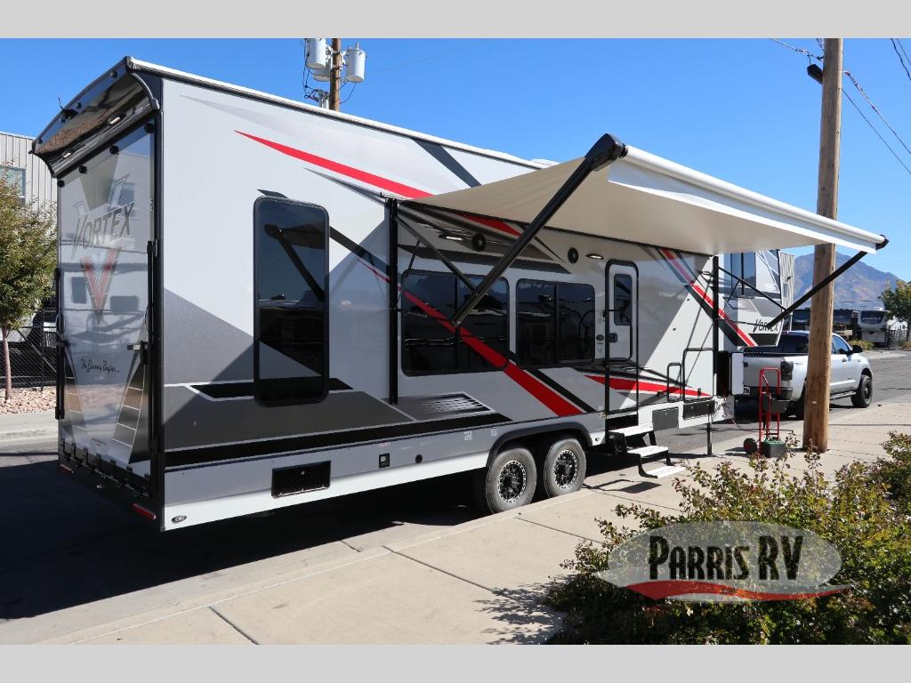 If you want to get away for the weekend with your toys, get away with this Vortex toy hauler. It has a 16' 4" garage to keep your ATVs and dirt bikes secure while you travel. You can accommodate a group of six for sleeping with the king-size bed, power queen bunk, and sofas, and everyone will benefit from a hot meal prepared on the three-burner range in the kitchen. You can even keep your cold items fresh by storing them in the refrigerator. The dual-entry bathroom has a door within the main hallway, but it also has a private entrance that leads into the bedroom.