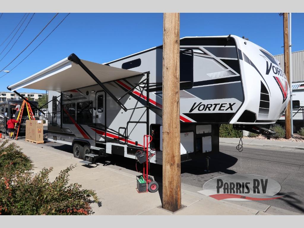 Your camping life is going to be a blast with the Genesis Supreme Vortex toy hauler! These work horses get the job done but also make it fun. You will be able to use the 40-gallon fuel station to gas up your toys when you come back from the trails, and the power awning with LED lights will give you protection as you use the exterior features. The 16" deluxe aluminum alloy wheels will get you to and from your destination with confidence, and the 30,000 or 35,000 BTU furnace will ensure that you don't freeze while you sleep on cool nights. You can keep power flowing with the 4.0kW generator with transfer switch, and you'll also enjoy the function and the style of the solid-surface countertops in the kitchen.