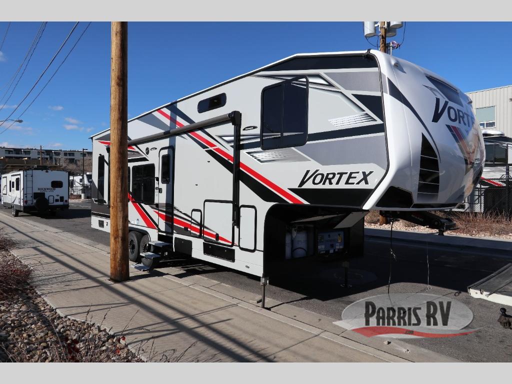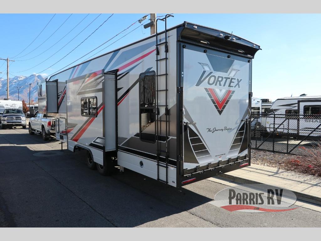 Your camping life is going to be a blast with the Genesis Supreme Vortex toy hauler! These work horses get the job done but also make it fun. You will be able to use the 40-gallon fuel station to gas up your toys when you come back from the trails, and the power awning with LED lights will give you protection as you use the exterior features. The 16" deluxe aluminum alloy wheels will get you to and from your destination with confidence, and the 30,000 or 35,000 BTU furnace will ensure that you don't freeze while you sleep on cool nights. You can keep power flowing with the 4.0kW generator with transfer switch, and you'll also enjoy the function and the style of the solid-surface countertops in the kitchen.