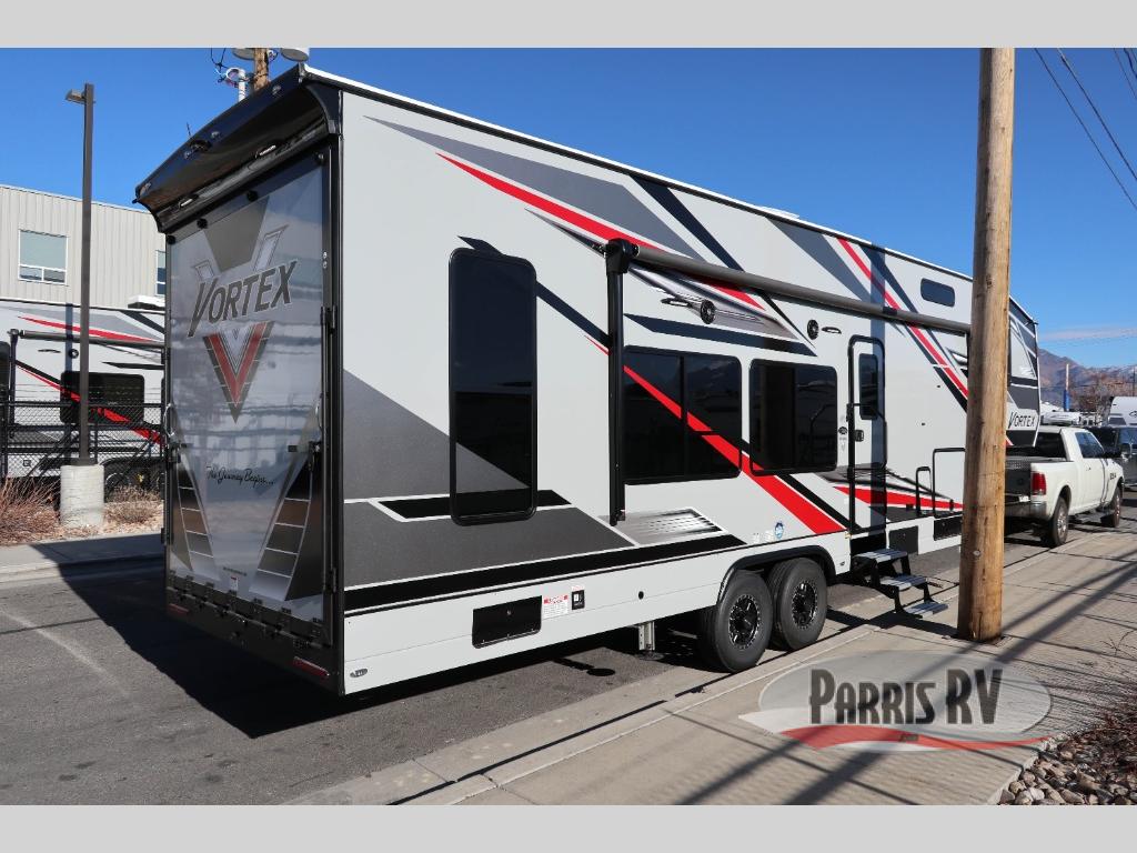 If you want to get away for the weekend with your toys, get away with this Vortex toy hauler. It has a 16' 4" garage to keep your ATVs and dirt bikes secure while you travel. You can accommodate a group of six for sleeping with the king-size bed, power queen bunk, and sofas, and everyone will benefit from a hot meal prepared on the three-burner range in the kitchen. You can even keep your cold items fresh by storing them in the refrigerator. The dual-entry bathroom has a door within the main hallway, but it also has a private entrance that leads into the bedroom.
