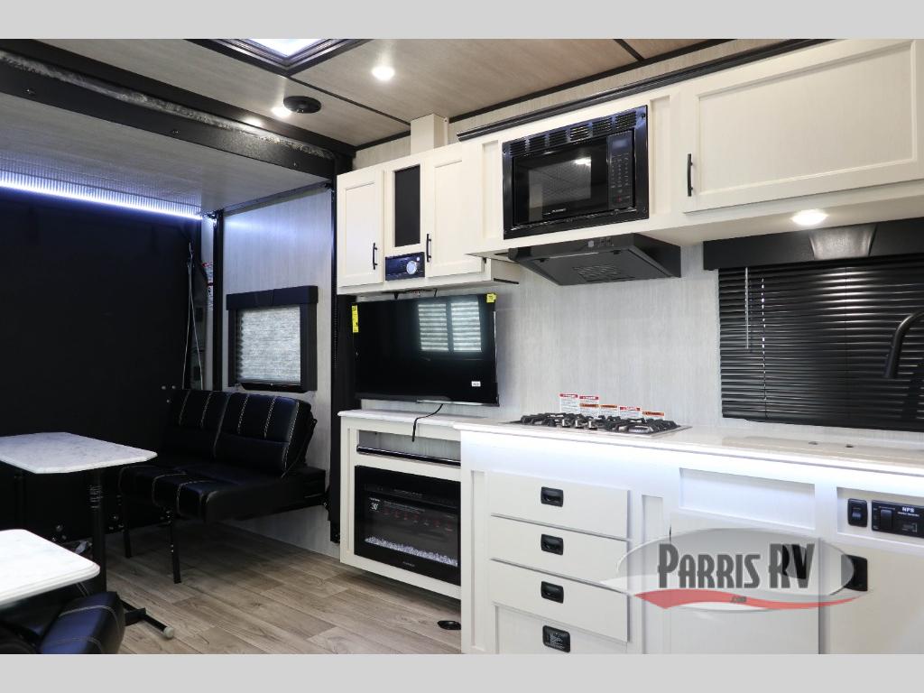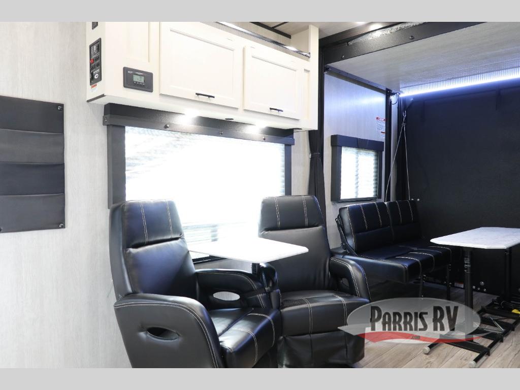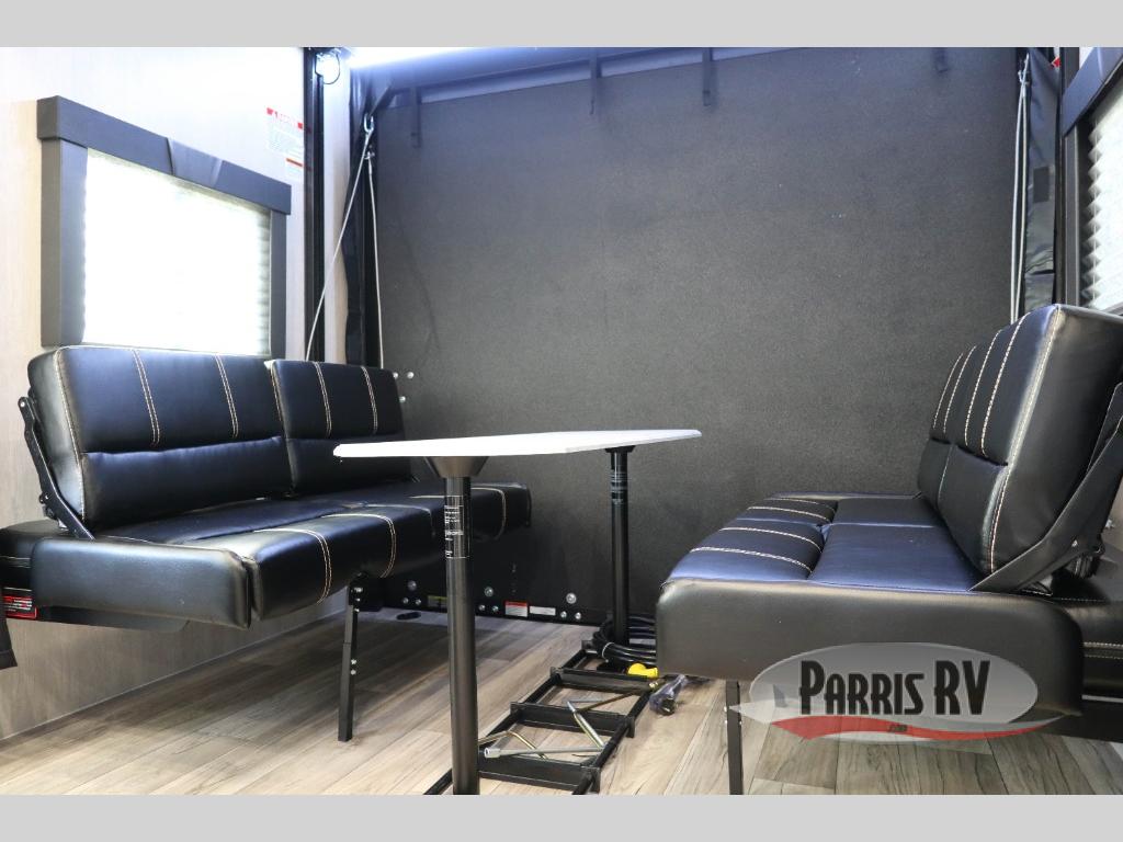 Head for the hills in this toy hauler that can sleep six each night. You'll enjoy the front master bedroom with a RV T-king bed and dual wardrobes, and your guests can sleep on the opposing rear power dinette with a single bed above. There is a full kitchen, complete with a three burner cooktop, a microwave oven, plus a 10 cu. ft. 12V refrigerator to store cold items. You'll also find a 40 gallon fuel station, new modern graphics, and a 102" wide body design to fit your favorite toys!