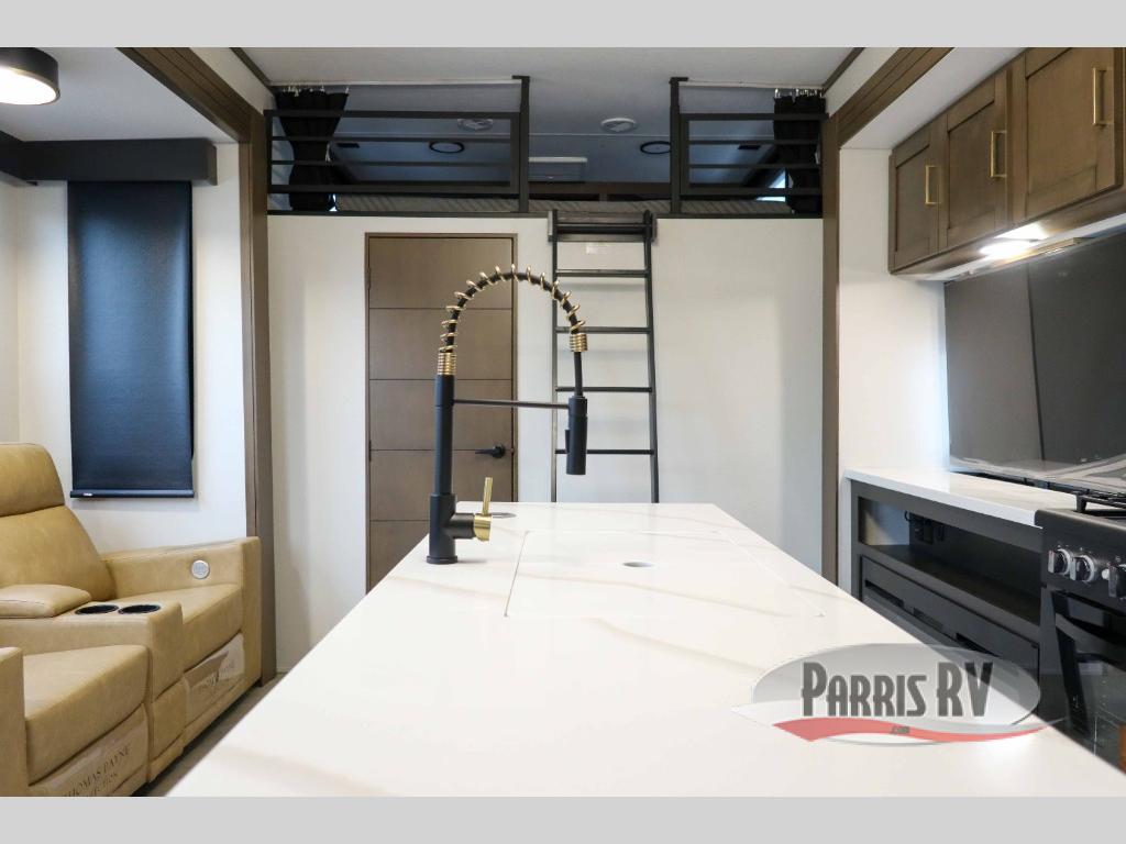 This fifth wheel is perfect for all family members! The full rear bathroom is perfect for getting ready for the day. The bedroom is ideal for two people since they would easily fit in the queen bed, also comes with a dresser, and TV for relaxing. Above the bedroom, a loft area with overhead cabinets provides additional storage and a cozy nook. The kitchen/living area is the heart of the home, equipped with a sofa, entertainment center, fireplace, microwave, kitchen island, refrigerator, and pantry. Perfect for cooking up a storm or relaxing with family and friends. A second full bathroom is a spacious oasis and provides added convenience, while the front bedroom is a luxurious retreat, featuring a king bed, ample closet, and washer and dryer prep. Finally, you and your family and friends can enjoy nature and have fun under the shade of the 16’ awning.