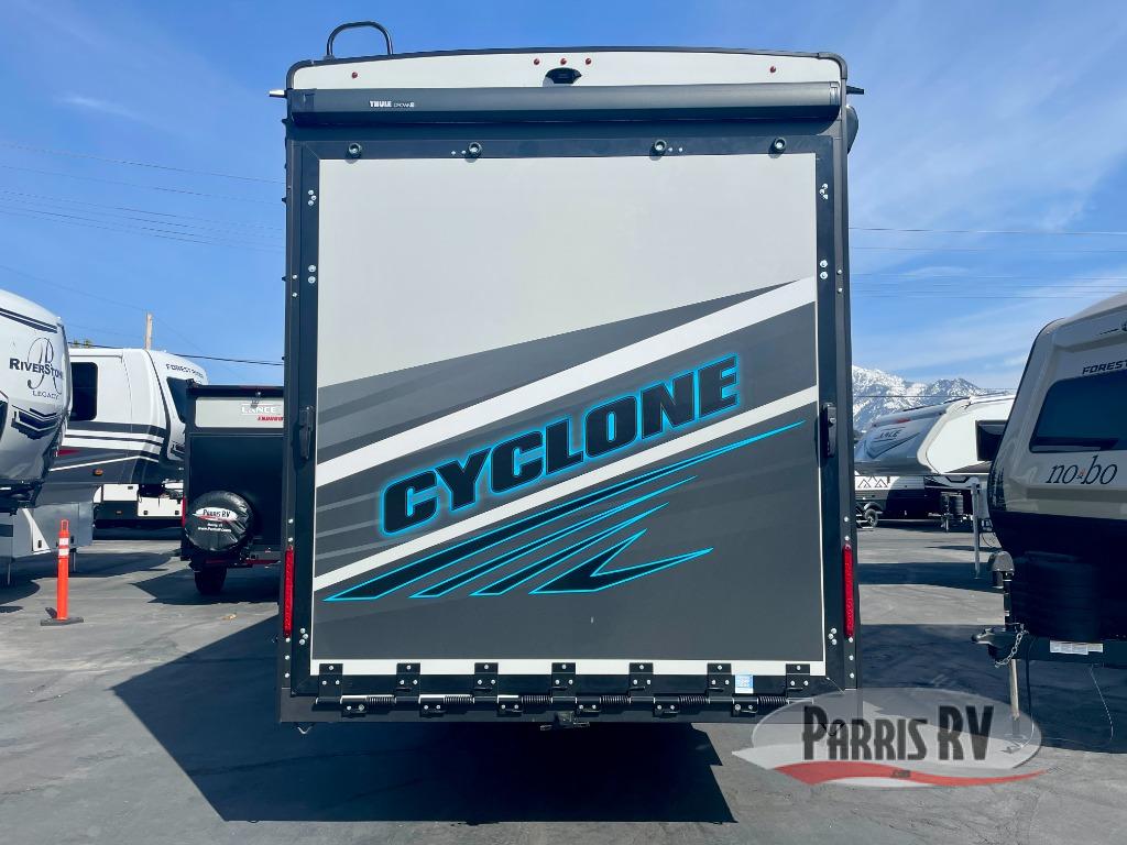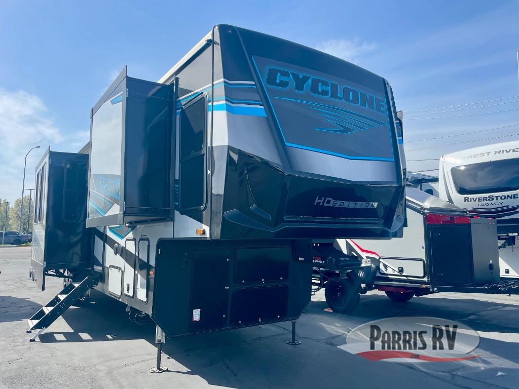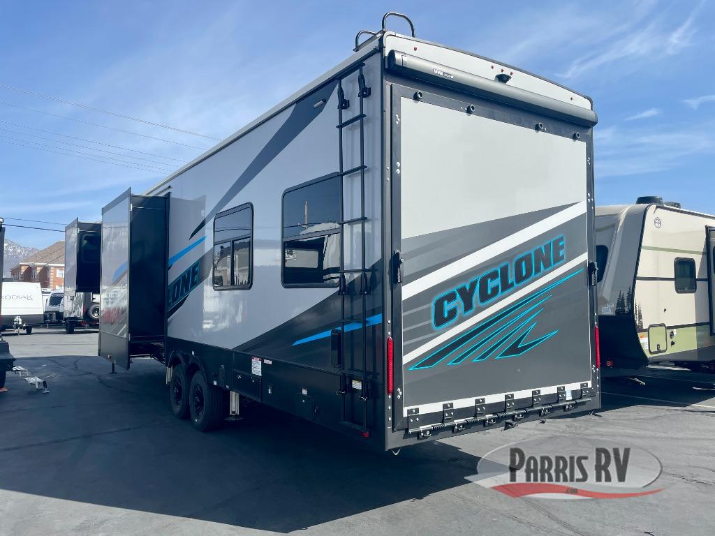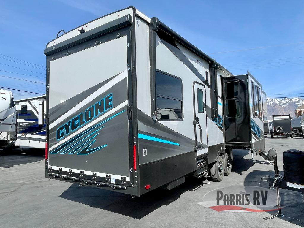 Satisfy your wanderlust with a Heartland Cyclone fifth wheel toy hauler! You won't have to sacrifice any luxury either with indulgent features like the king bedroom suite with an exclusive East to West bed tilt system with 30% more floor space, Stor-Mor three-sided access to the basement with 30% more storage capacity, and Step Caddy folding patio step for better stability as you enter or exit the patio. The industry first Grill and Go 25" residential pull out three burner griddle combo comes on models with an exterior kitchen for an easier cooking experience. Full height shaker cabinetry provides 25% more storage space so you can bring more camping necessities with you. If you like to dry camp longer then you will appreciate the industry's largest 150 gallons fresh water tanks. Come find the perfect model for you today!