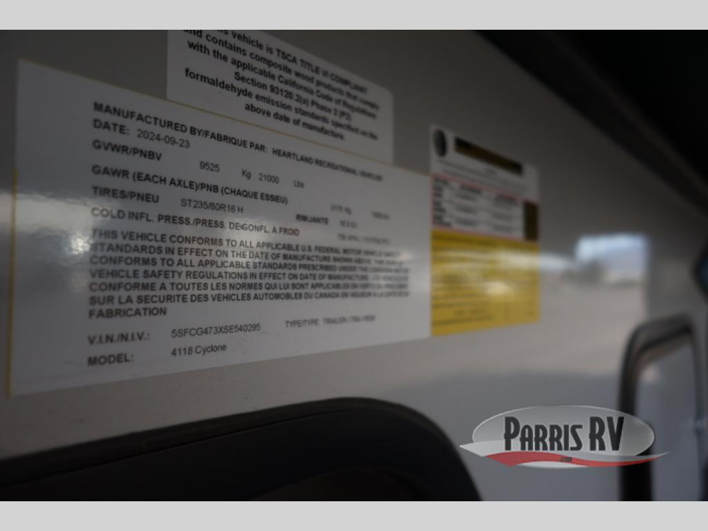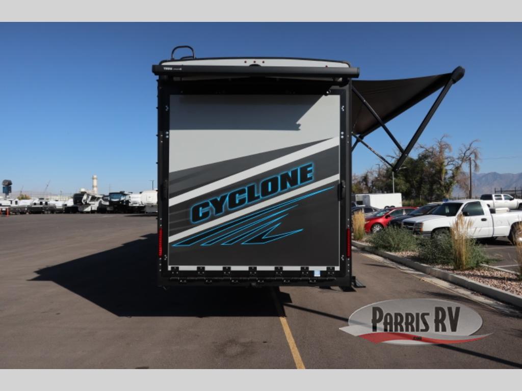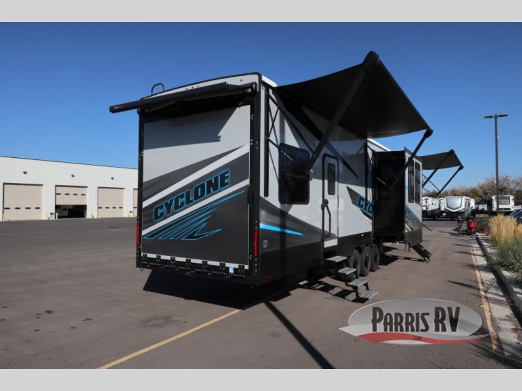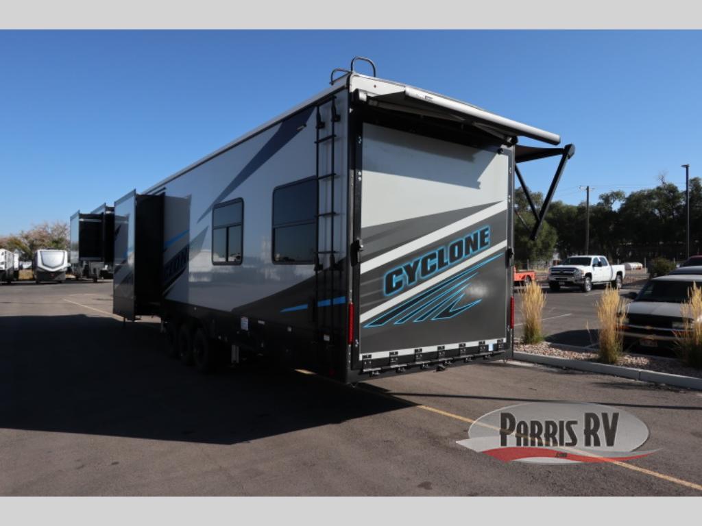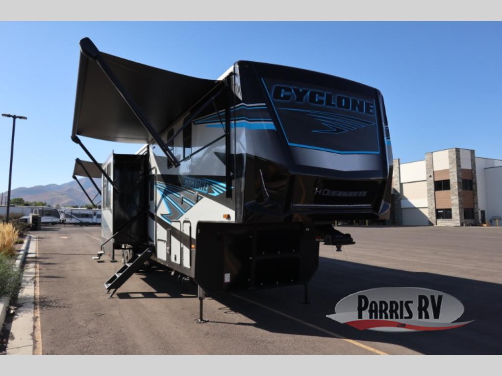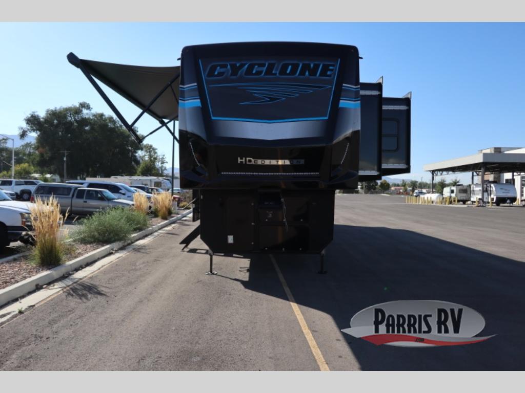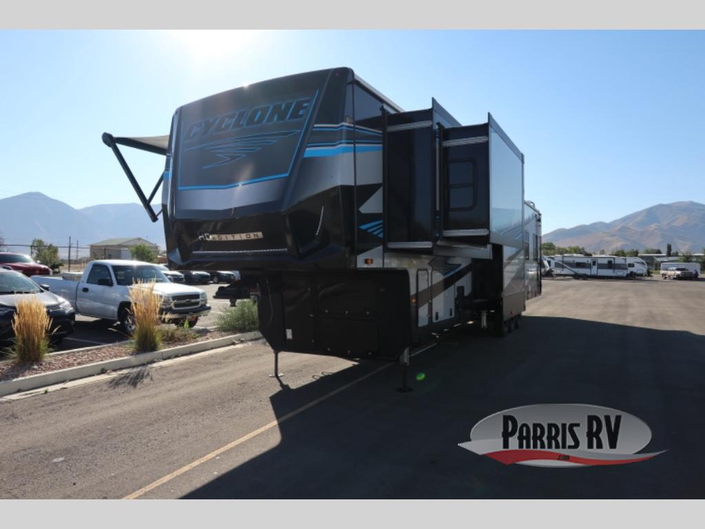 Satisfy your wanderlust with a Heartland Cyclone fifth wheel toy hauler! You won't have to sacrifice any luxury either with indulgent features like the king bedroom suite with an exclusive East to West bed tilt system with 30% more floor space, Stor-Mor three-sided access to the basement with 30% more storage capacity, and Step Caddy folding patio step for better stability as you enter or exit the patio. The industry first Grill and Go 25" residential pull out 3 burner griddle combo comes on models with an exterior kitchen for an easier cooking experience. Full height shaker cabinetry provides 25% more storage space so you can bring more camping necessities with you. If you like to dry camp longer then you will appreciate the industry's largest 150 gallons fresh water tanks. Come find the perfect model for you today!