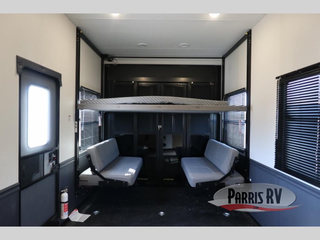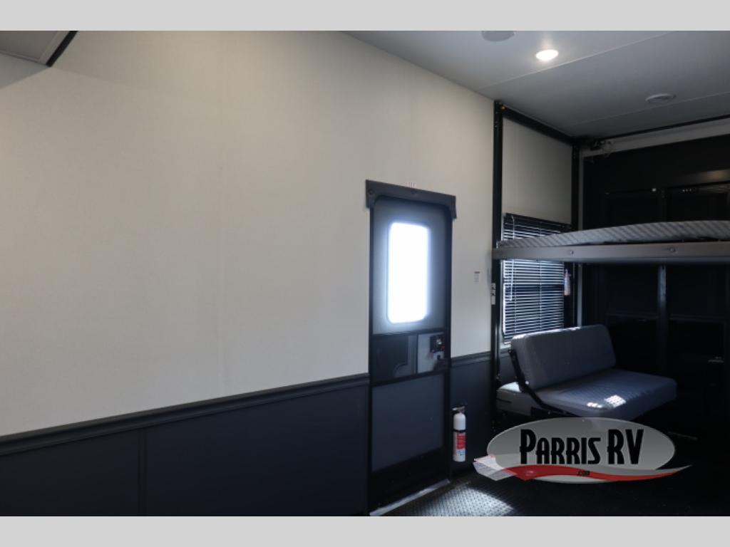 You're going to love every minute spent in this spacious toy hauler. The 17' 9" garage includes a its own exterior entry door, a half bath, and sleeping space for five to six with the included loft. There is even washer and dryer prep here that will come in handy after trail riding. Everyone can meet in the main living/kitchen area that includes a kitchen island, a large sofa, and a 50" LCD HDTV for movie night. The front of this model is shared with the unique master bedroom and bathroom that includes a tilting king bed slide out, a spacious full bath with dual bath sinks, and tons of storage space for all your belongings!