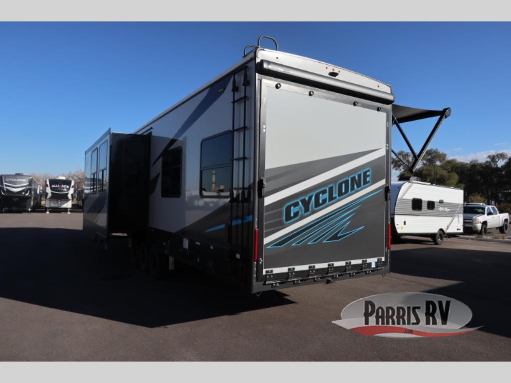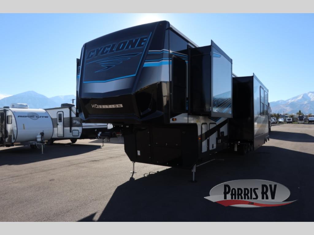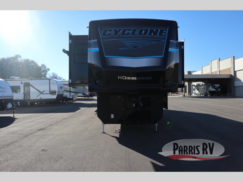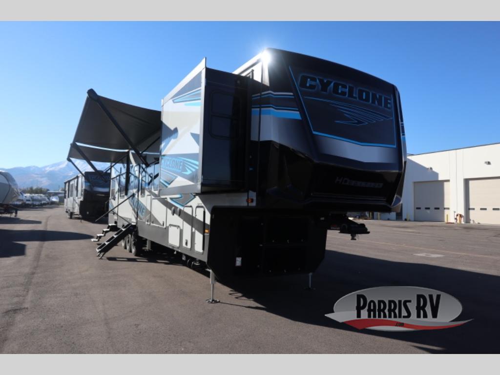 Satisfy your wanderlust with a Heartland Cyclone fifth wheel toy hauler! You won't have to sacrifice any luxury either with indulgent features like the king bedroom suite with an exclusive East to West bed tilt system with 30% more floor space, Stor-Mor three-sided access to the basement with 30% more storage capacity, and Step Caddy folding patio step for better stability as you enter or exit the patio. The industry first Grill and Go 25" residential pull out three burner griddle combo comes on models with an exterior kitchen for an easier cooking experience. Full height shaker cabinetry provides 25% more storage space so you can bring more camping necessities with you. If you like to dry camp longer then you will appreciate the industry's largest 150 gallons fresh water tanks. Come find the perfect model for you today!