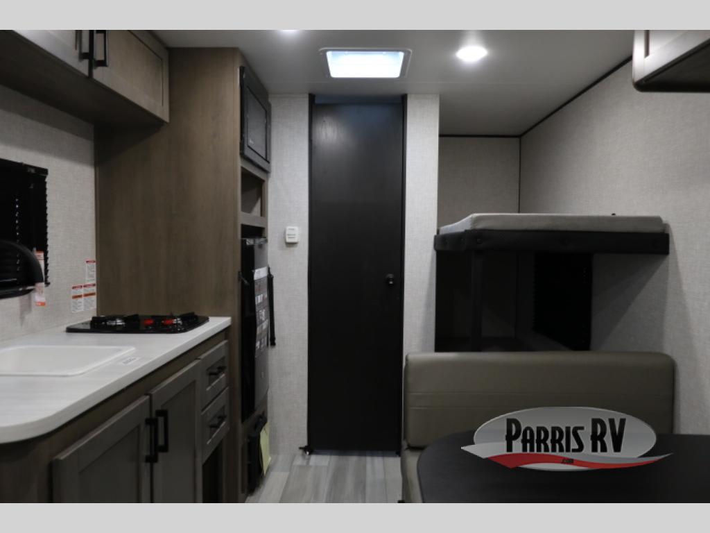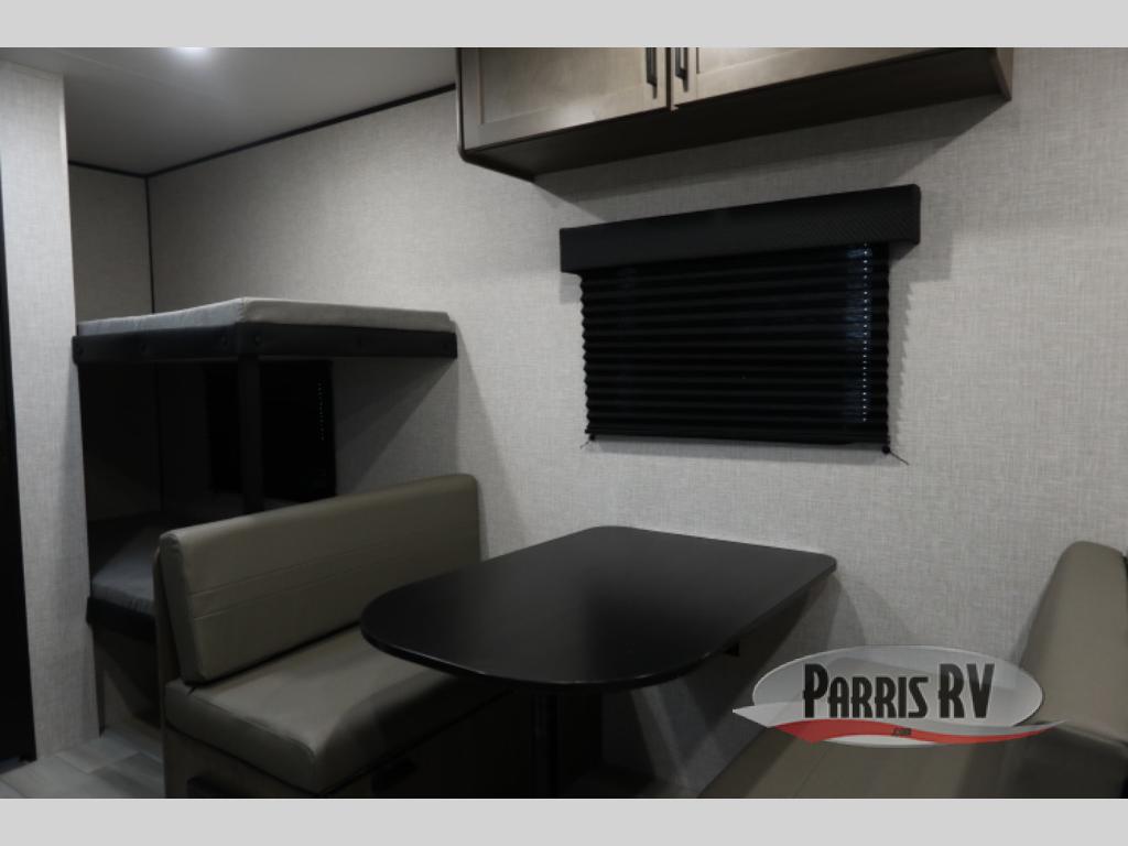This Open Range Conventional COLT travel trailer is perfect for all your camping needs. There is a front queen bed and bunks beds for sleeping space, plus a booth dinette that will double as both dining and sleeping space for a guest or two little ones. A full kitchen includes a two burner cooktop and microwave to make meals each day, and the private bath with a tub/shower will make it easier than ever to wash up after a day outdoors.