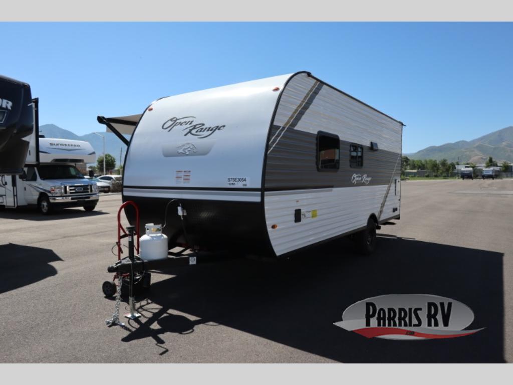 The affordable Open Range Conventional travel trailers by Highland Ridge are ready to meet your camping needs! You will appreciate the durable Magnum Roof system, plus each model is constructed with black front diamond plate protection, 5/8" main floor decking, and self-adjusting electric brakes with E-Z Lube axles for smooth towing. The 81" interior height means you won't feel cramped when relaxing with friends and family, and the residential vinyl flooring throughout is easy to clean, which will be perfect if you're camping with little ones or pets. These models also include an AM/FM/Bluetooth radio with indoor/outdoor speakers, a digital TV antenna that will go perfectly with the optional Smart TV, plus a 13,500 BTU roof mounted A/C to keep you cool on those hot summer months.