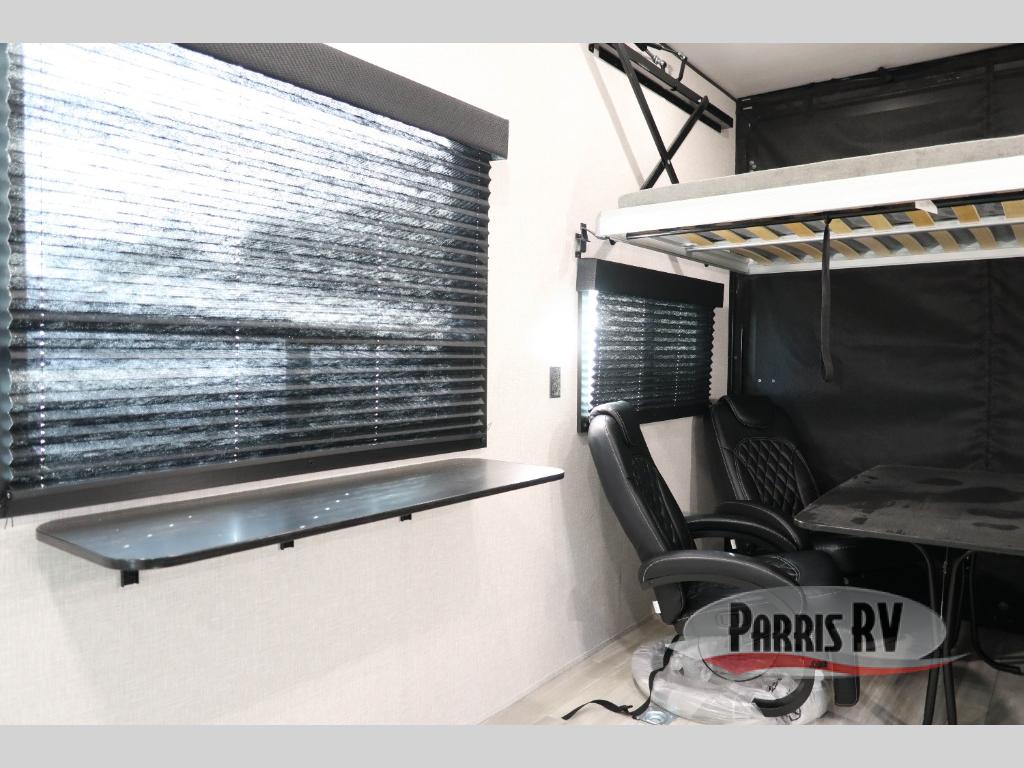 You will have everything you need for a comfortable camping trip in this toy hauler! Unload your off-road toy easily from the cargo area featuring up to 14' of space using the spring assist 8' ramp door for a fun day out on the trails. The fully equipped kitchen has a three burner cooktop to fry up some eggs in the morning, and you can enjoy them at either the flip-up bar top with two stools or at the rear convertible sofa and two chairs in the other side if the removable table. The dual entry bathroom is easy to access from the front private bedroom and it has a radius shower to wash the mud out of your hair.