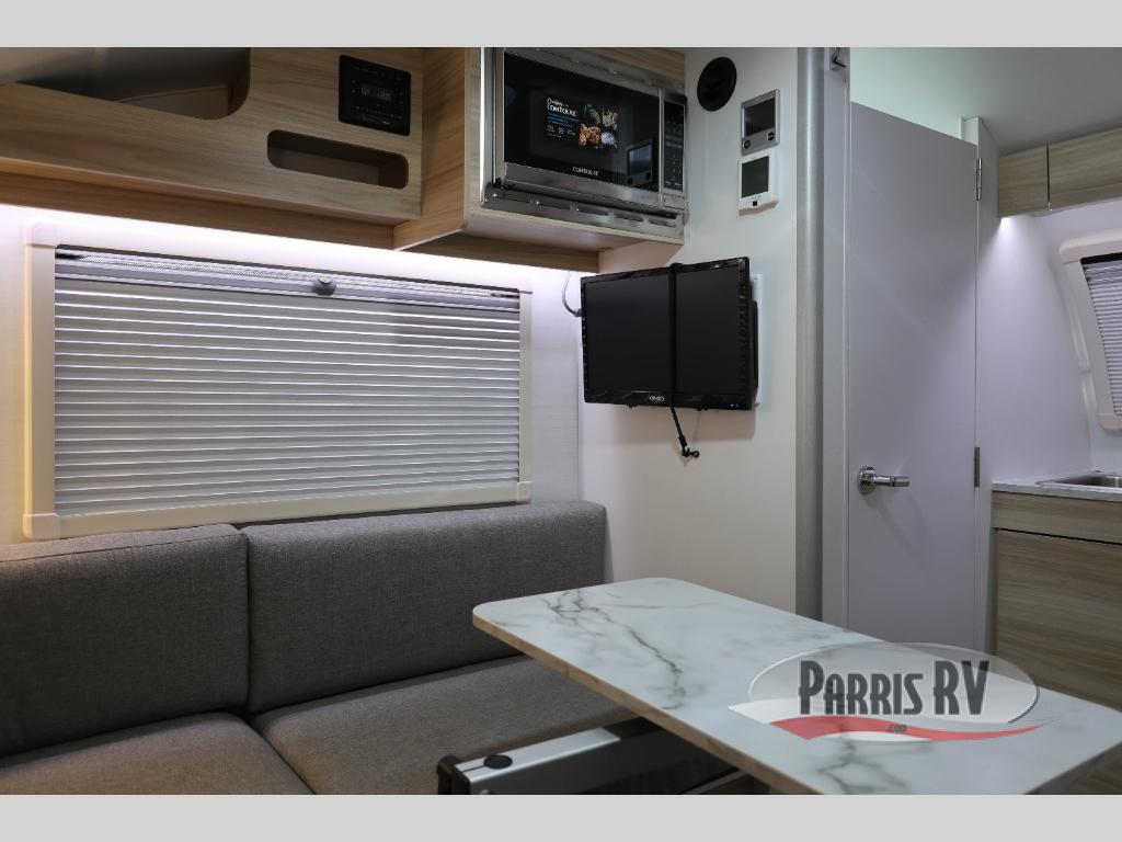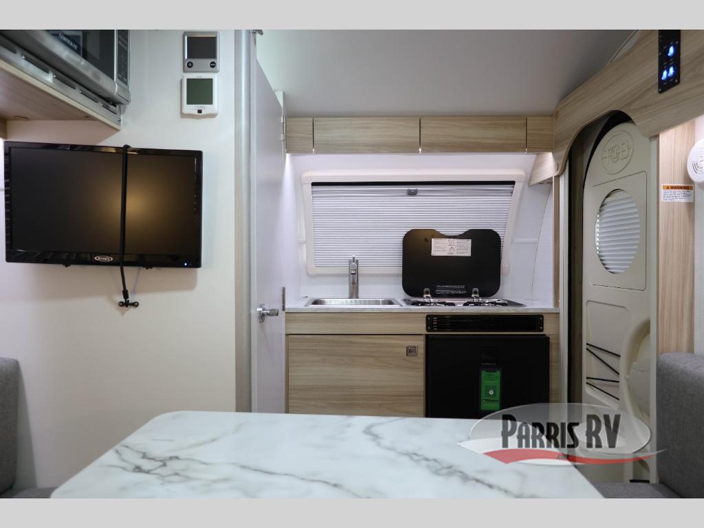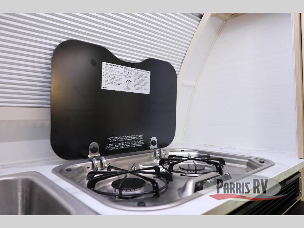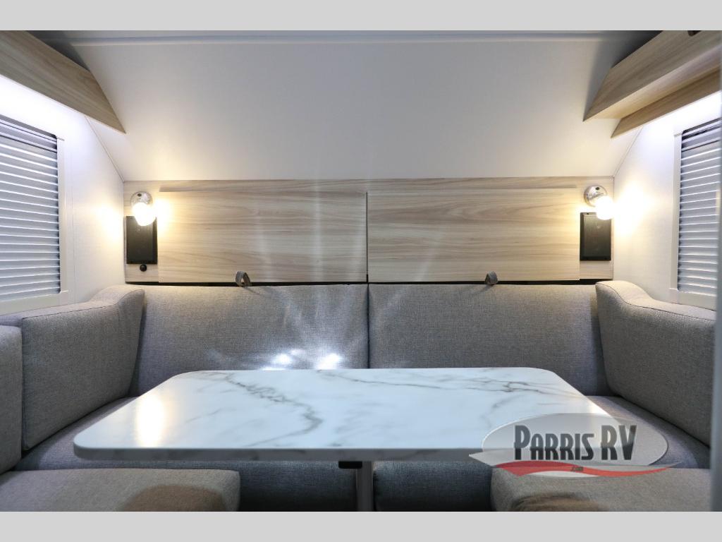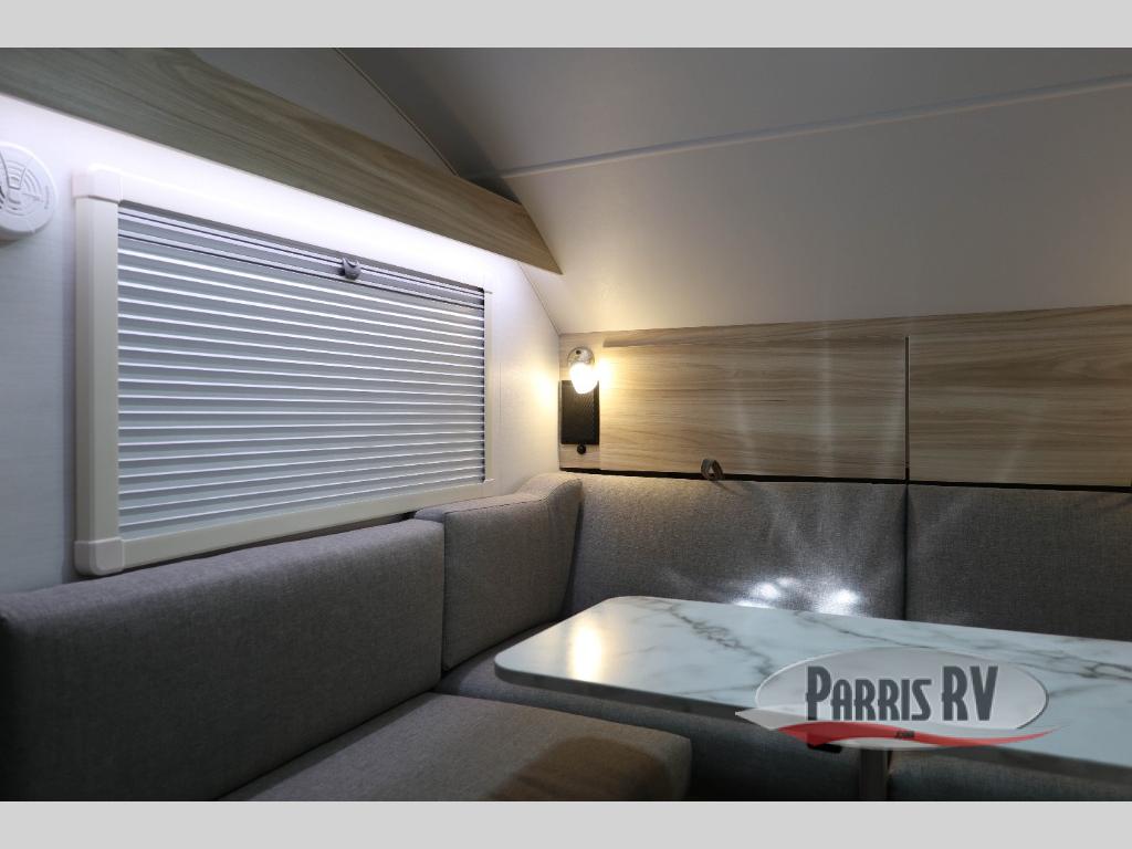With any TAB 320 teardrop trailer by nüCamp RV, the interior offers premium soft-close cabinetry, a front window, plus a wet bath with a cassette toilet and a molded sink. The iconic teardrop design offers an easy-to-tow unit with amenities found in much bigger trailers. Some other highlights include the Alde heating/hot water system, the central air conditioner, 180 watt solar panel, and the Nautilus water system with an external shower. The optional Boondock and Black Canyon packages include an additional 310 watt solar panel, holding tank heaters, and under-glow lights. With these upgrades your tow length increases by 3" and hitch and gross weight will be higher as well!