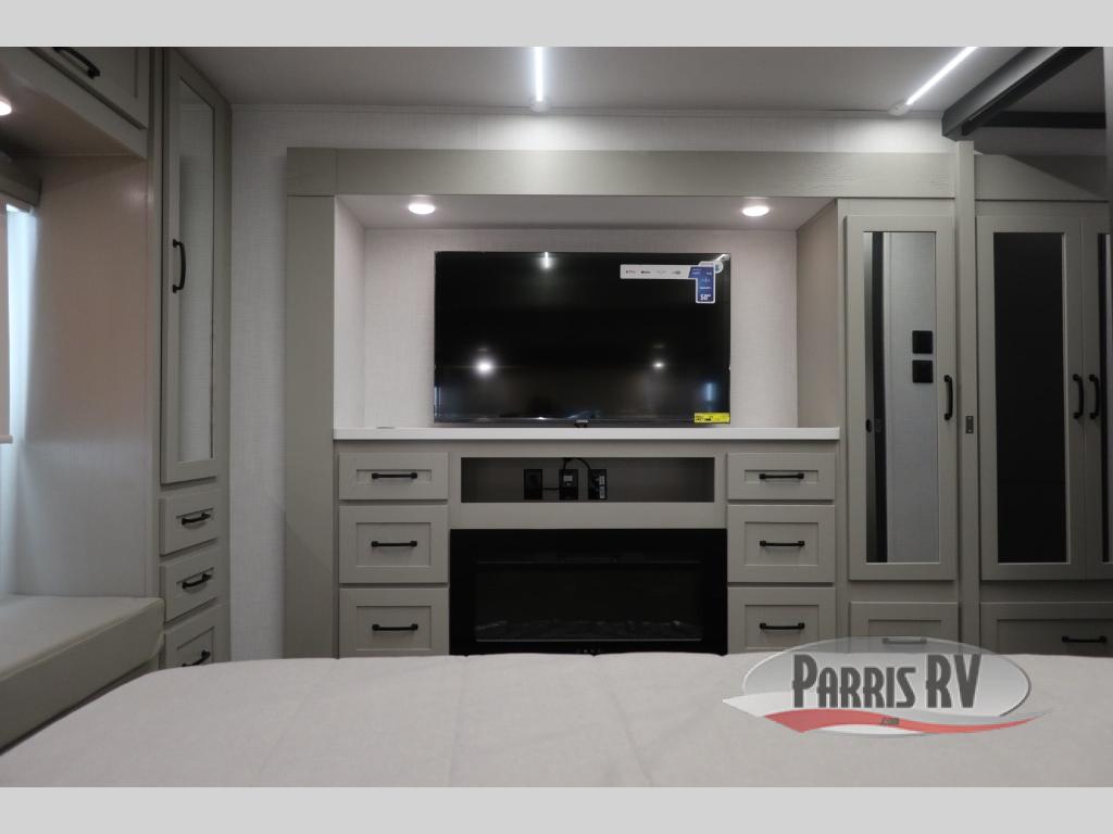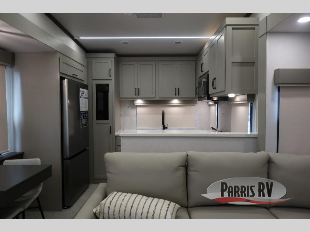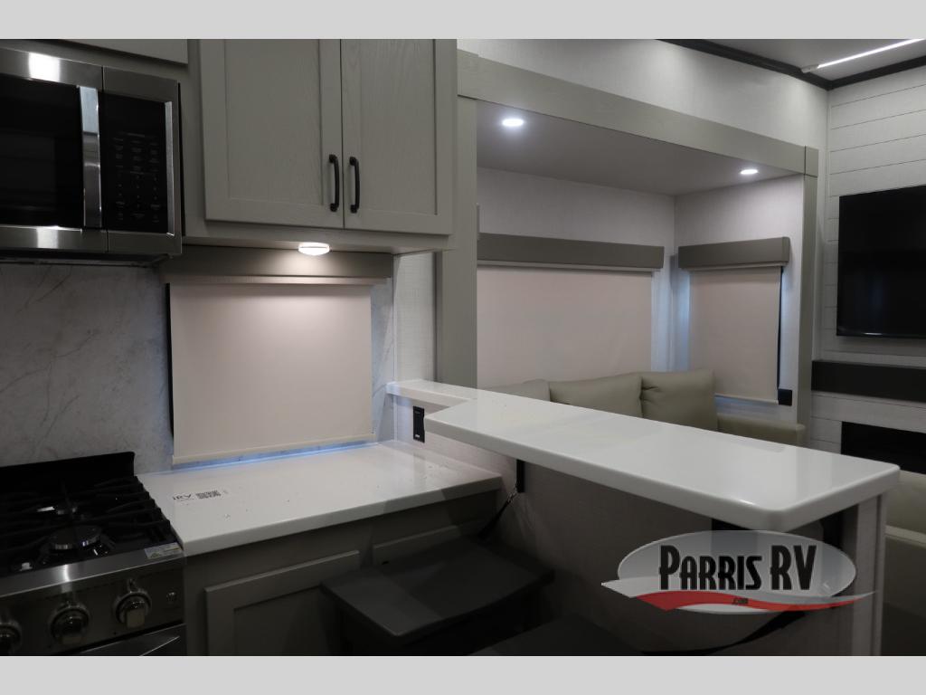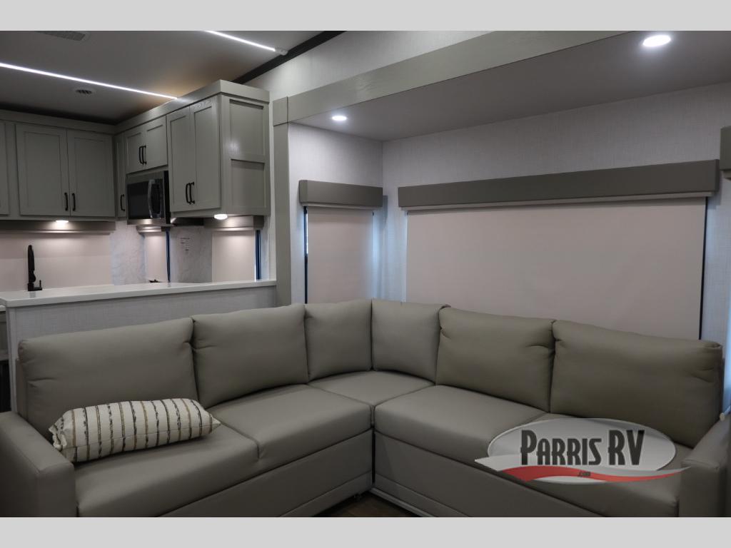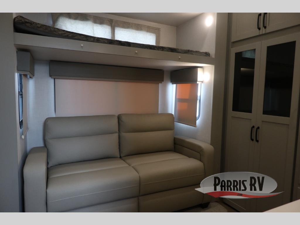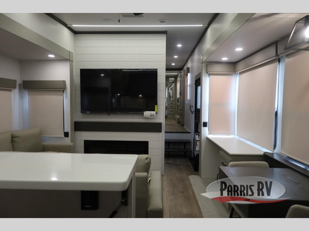If you enjoy camping with a large group of family or friends, this fifth wheel will be perfect for you! There are five slides, giving your crew plenty of space to relax, plus there is a mid-bunk room with a tri-fold sofa, a 30" x 68" bunk, and a desk. And above this room is a 30" x 68" loft for even more sleeping or storage space. You can claim the front private bedroom all to yourselves which includes a king bed, front bench with dual wardrobes, plus a bedroom fireplace and Smart TV. Everyone can enjoy visiting together in the middle living room on the L-lounge by the entertainment center with a second fireplace. There is a table and chairs for dining space, plus a desk with a chair if you need to get some work done. And don't overlook the rear kitchen with a large refrigerator and pantry, all the appliances to make meals, plus ample counter space, including a bar top that overlooks the main living area!