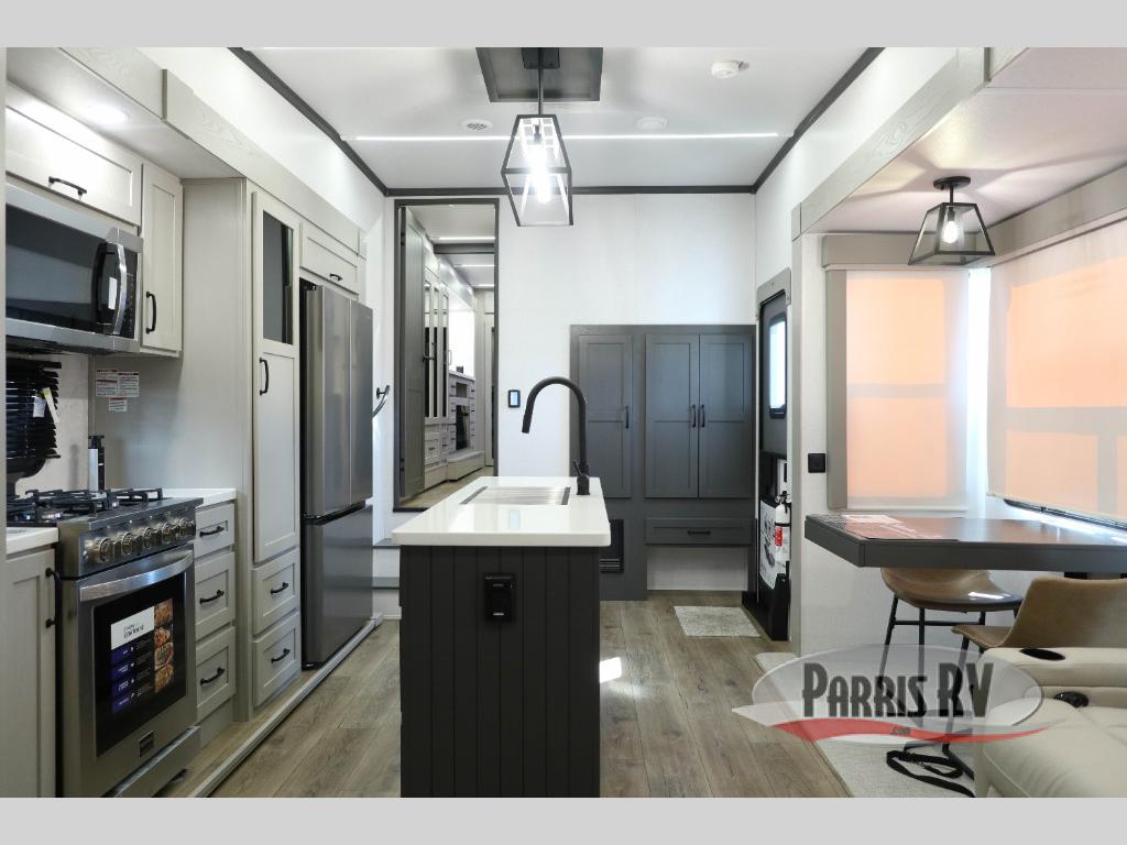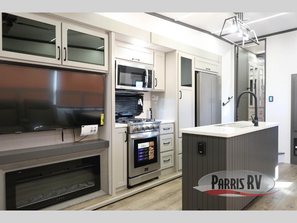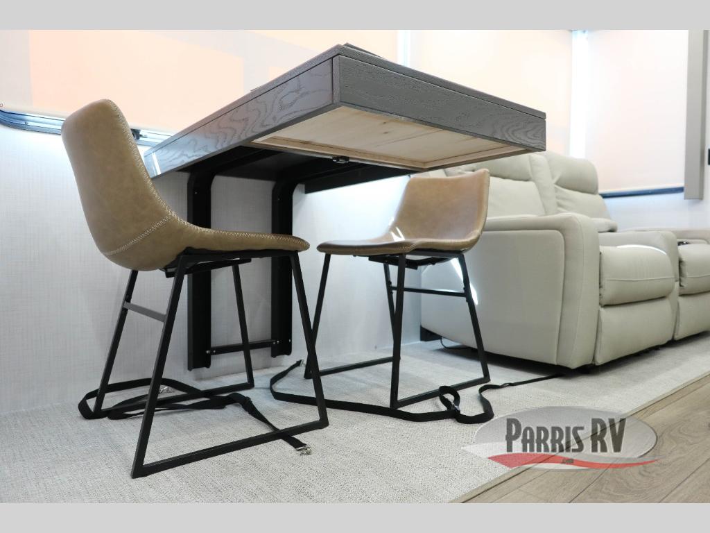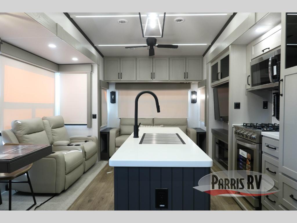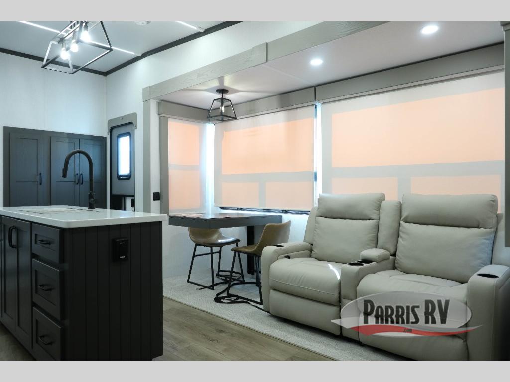 It won't be hard to fall in love with this fifth wheel that can sleep four each night! There are dual opposing slides in the bedroom and in the combined kitchen and living area for maximum space to relax! You will love evenings spent in the rear living area on the theater seat across from the 50" Smart TV, and there is an 88" spit tri-fold sofa to let guests stay over. A four burner Insignia gas cooktop and residential style stainless steel microwave will let you cook meals each day, and the table with chairs will be the perfect place to dine together. Head to the full bath that includes a shower with a seat to easily clean up, then head off to bed in the front private bedroom. Here, you'll find a king bed slide out, a bedroom Smart TV, plus a spacious wardrobe with a shelf. There is even washer and dryer prep if you want the option to make full-time RVing easier!