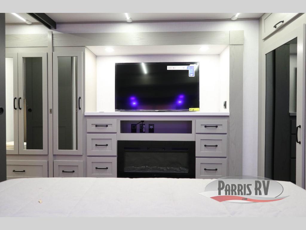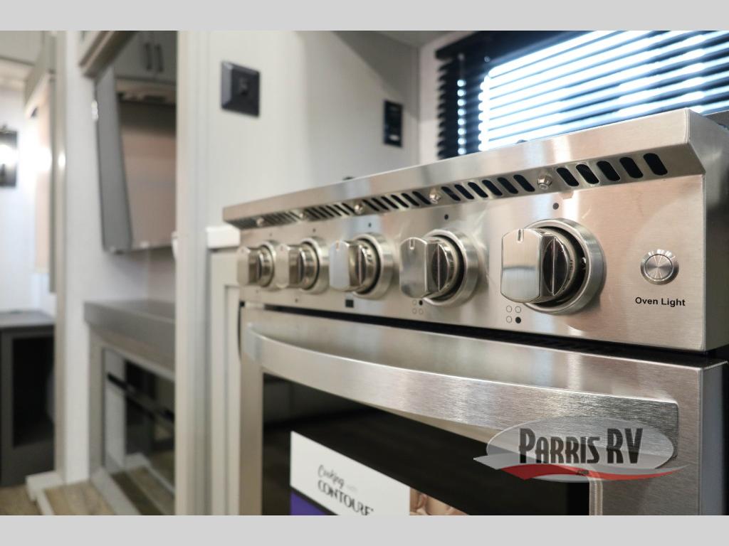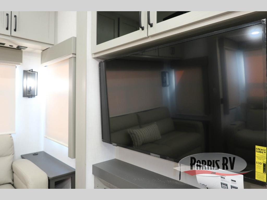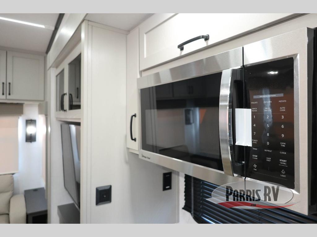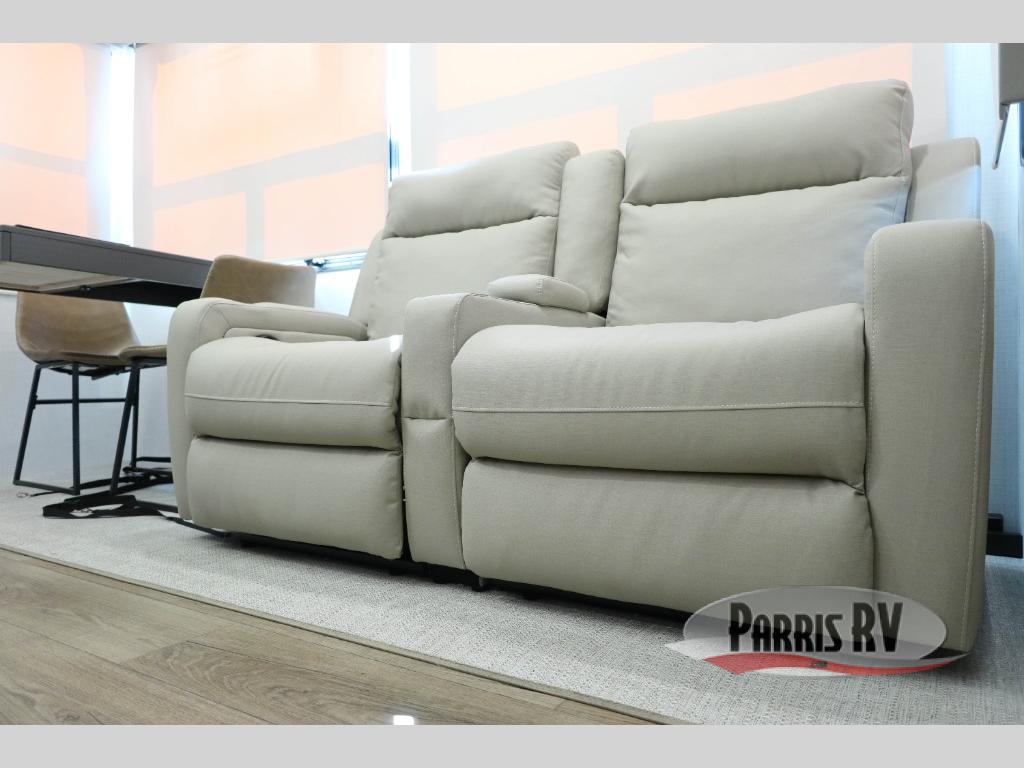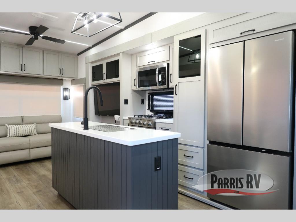 It won't be hard to fall in love with this fifth wheel that can sleep four each night! There are dual opposing slides in the bedroom and in the combined kitchen and living area for maximum space to relax! You will love evenings spent in the rear living area on the theater seat across from the 50" Smart TV, and there is an 88" spit tri-fold sofa to let guests stay over. A four burner Insignia gas cooktop and residential style stainless steel microwave will let you cook meals each day, and the table with chairs will be the perfect place to dine together. Head to the full bath that includes a shower with a seat to easily clean up, then head off to bed in the front private bedroom. Here, you'll find a king bed slide out, a bedroom Smart TV, plus a spacious wardrobe with a shelf. There is even washer and dryer prep if you want the option to make full-time RVing easier!
