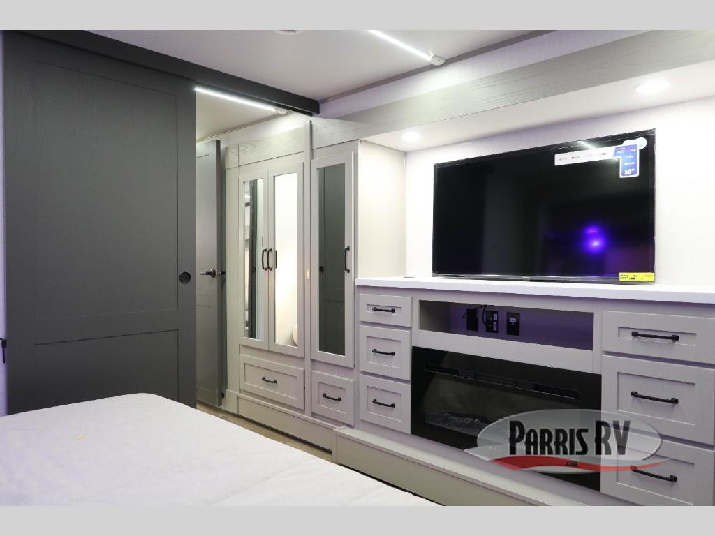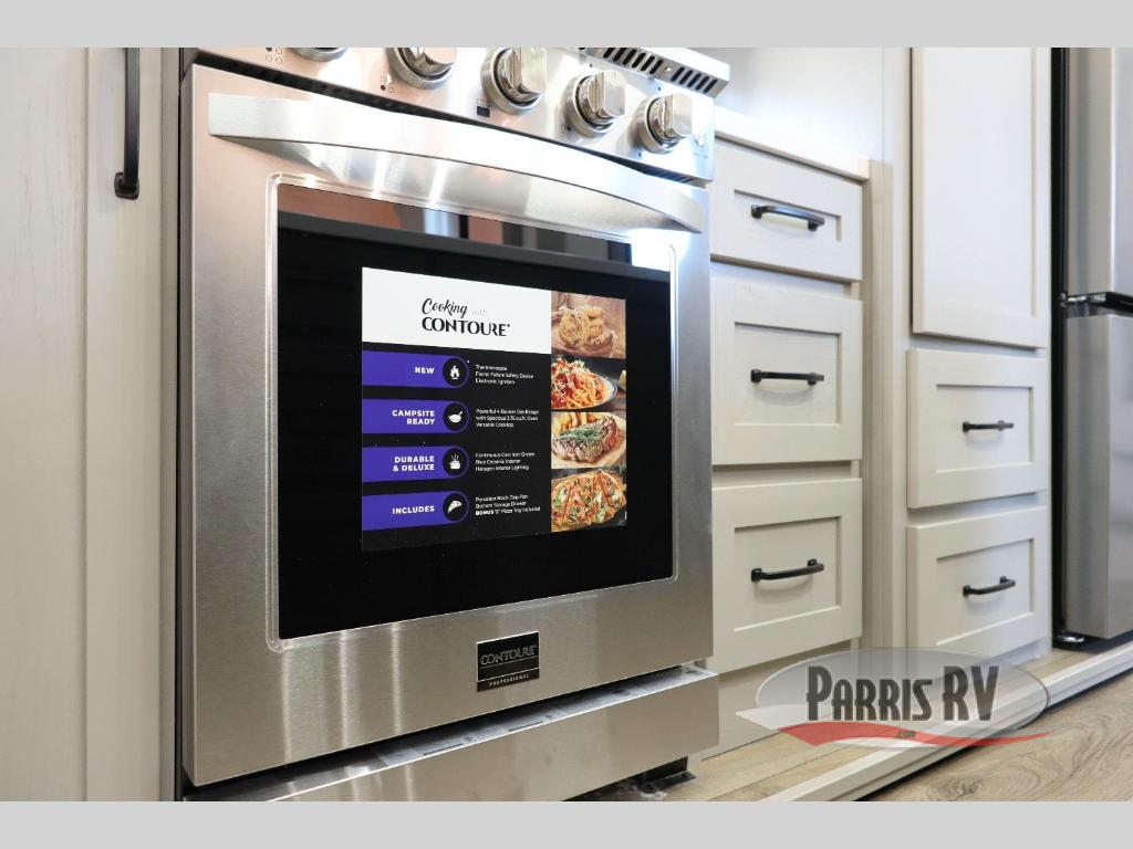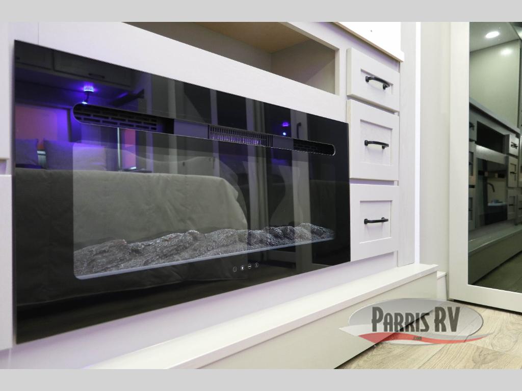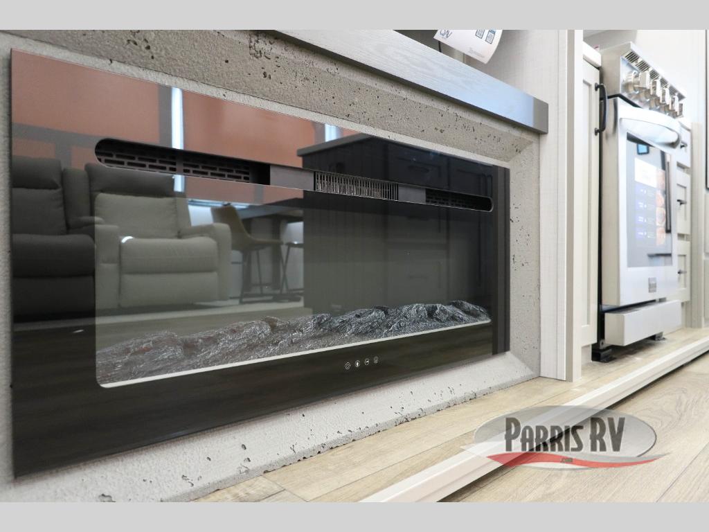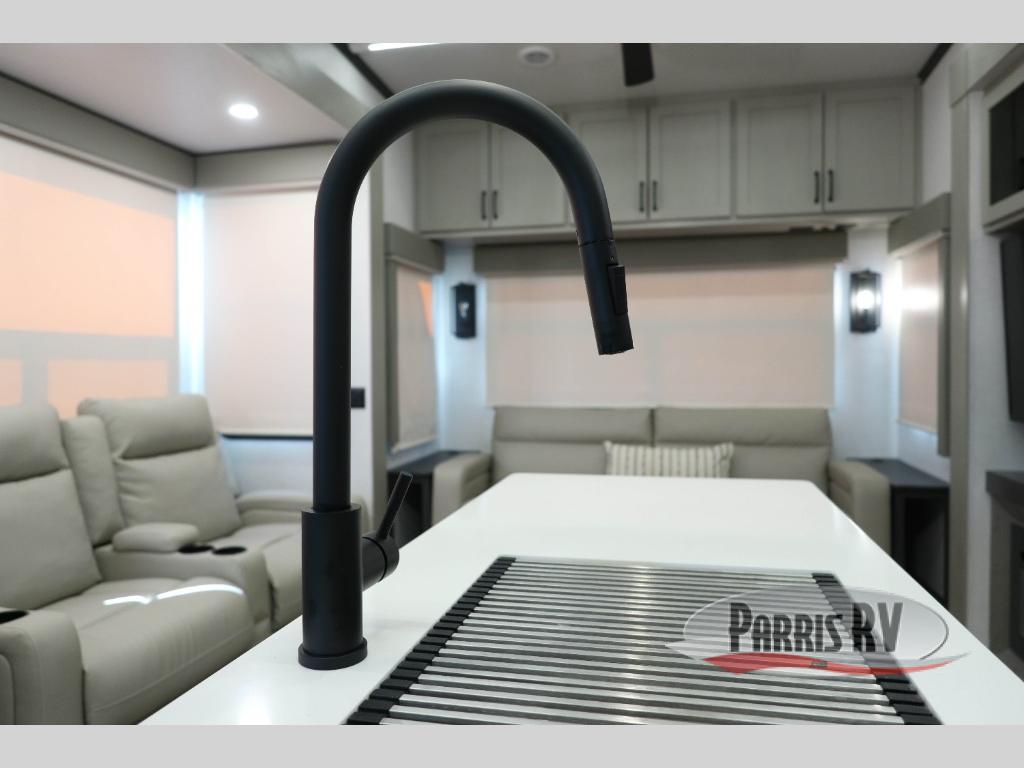 It won't be hard to fall in love with this fifth wheel that can sleep four each night! There are dual opposing slides in the bedroom and in the combined kitchen and living area for maximum space to relax! You will love evenings spent in the rear living area on the theater seat across from the 50" Smart TV, and there is an 88" spit tri-fold sofa to let guests stay over. A four burner Insignia gas cooktop and residential style stainless steel microwave will let you cook meals each day, and the table with chairs will be the perfect place to dine together. Head to the full bath that includes a shower with a seat to easily clean up, then head off to bed in the front private bedroom. Here, you'll find a king bed slide out, a bedroom Smart TV, plus a spacious wardrobe with a shelf. There is even washer and dryer prep if you want the option to make full-time RVing easier!