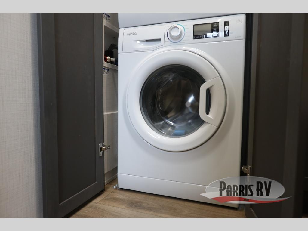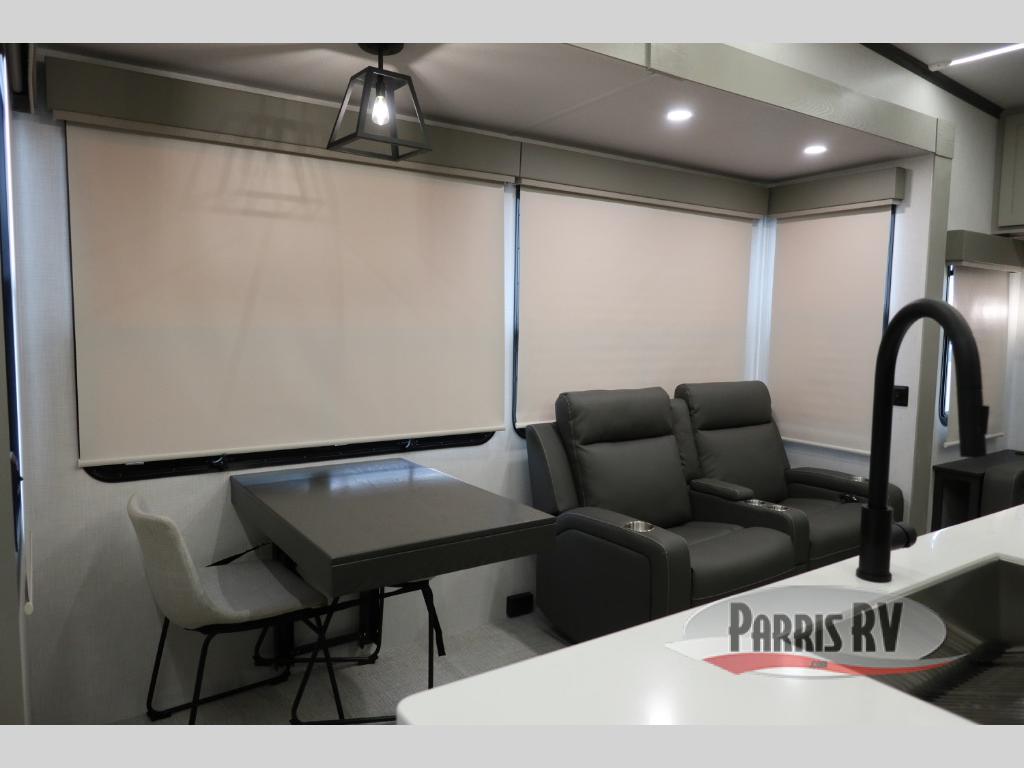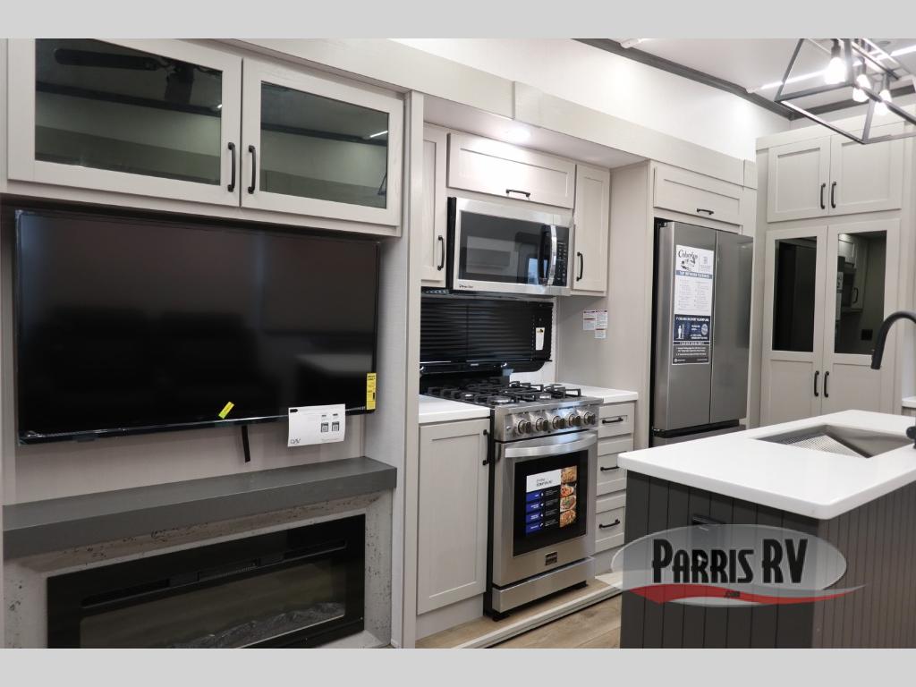 Everyone will stay clean with a bath and a half in this fifth wheel! The kitchen has a pantry big enough for everyone's favorite snacks, a four burner gas cooktop, and a kitchen island to prepare your best meals. You can have game night indoors at the table and chairs or set up a table and chairs underneath the two power awnings. The rear living area offers a comfortable place to watch the big game too with an sofa/sleeper and theater seating directly across from the entertainment center with a 50" Smart TV and fireplace. Two can get ready at once in the front bathroom featuring a vanity with dual sinks, and since there is washer and dryer prep, you have the option to make wash day easier!
