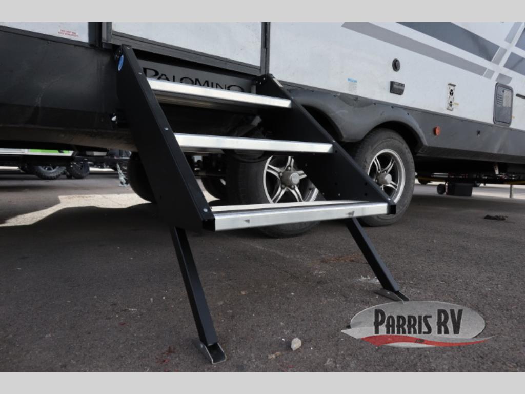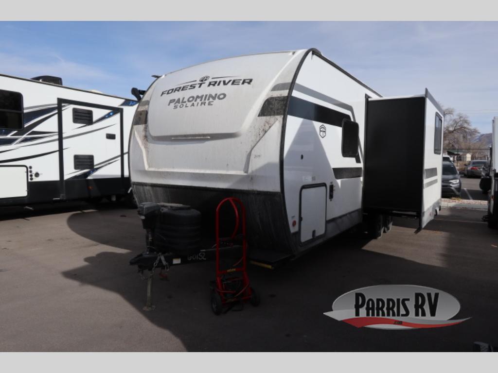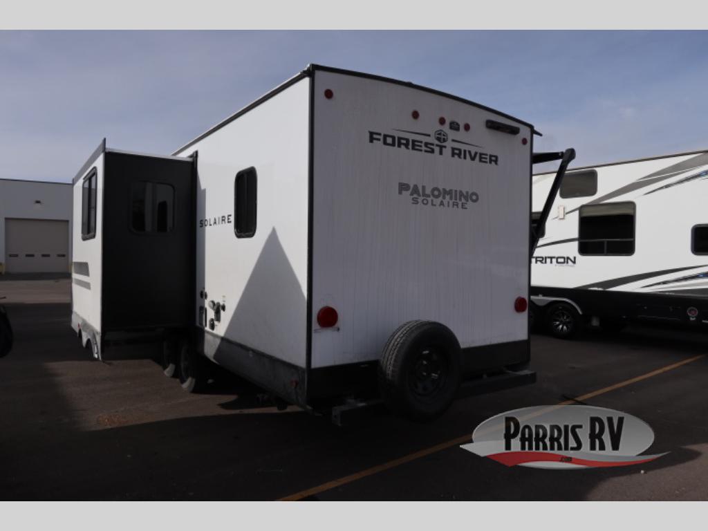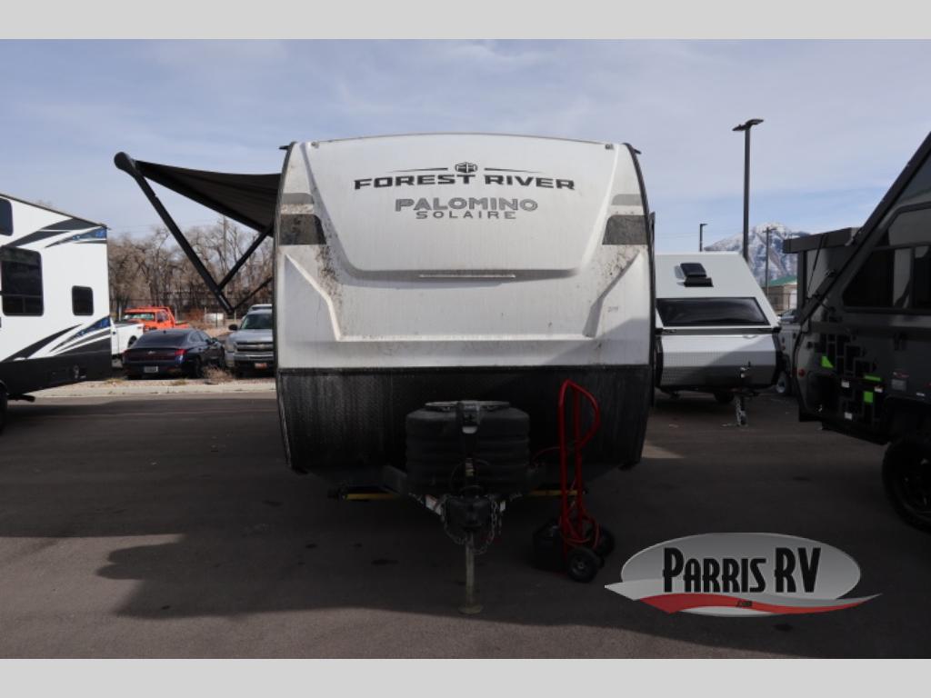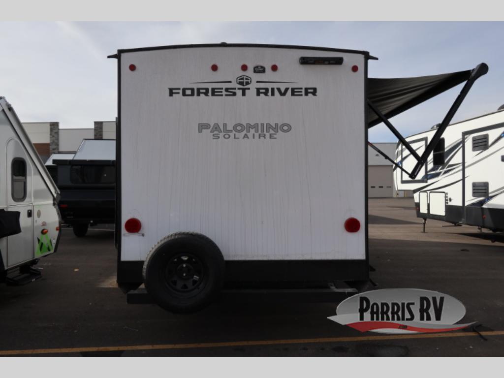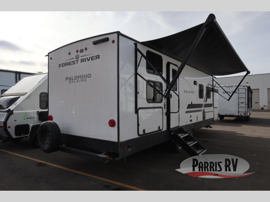 Each SolAire travel trailer by Palomino features a white gel coat exterior and an aluminum superstructure frame for lightweight towing. You will love having a power tongue jack for easy set up, plus slam latch baggage doors with magnets to make unloading easier than ever. There is also a power awning with LED lights and aluminum wheels included on the exterior. Each SolAire is constructed to last with Azdel composite, a fully laminated rear wall and roof, plus a fully enclosed and heated underbelly. The interior includes roller shades and kitchen backsplash, USB ports to keep your electronics charged, a Bluetooth stereo with speakers, and many more stand-out features!