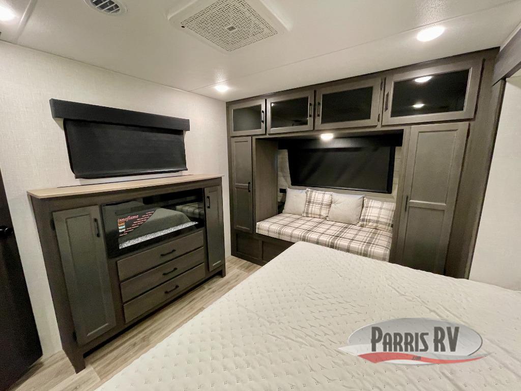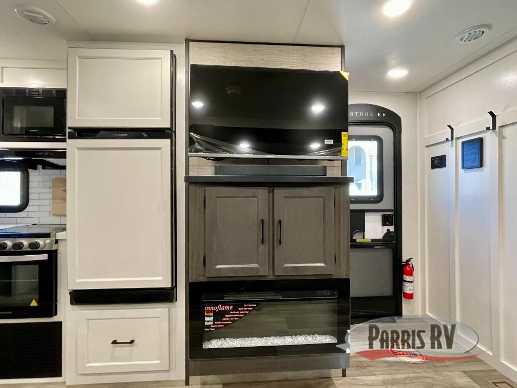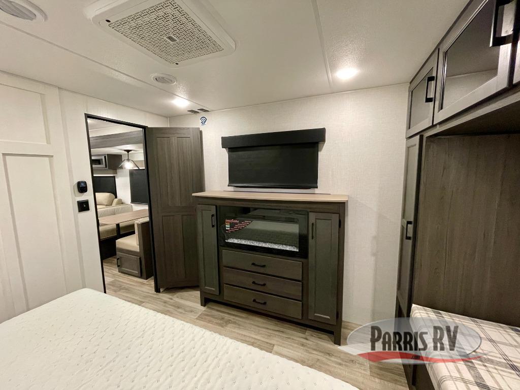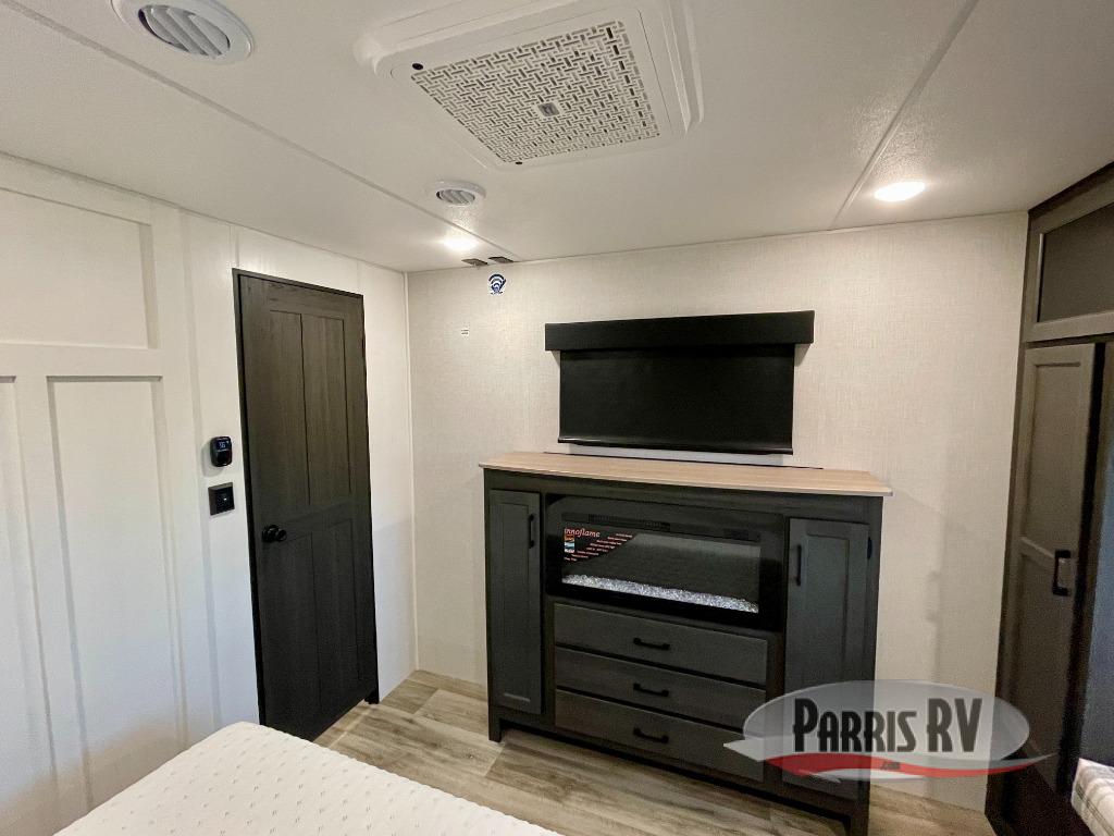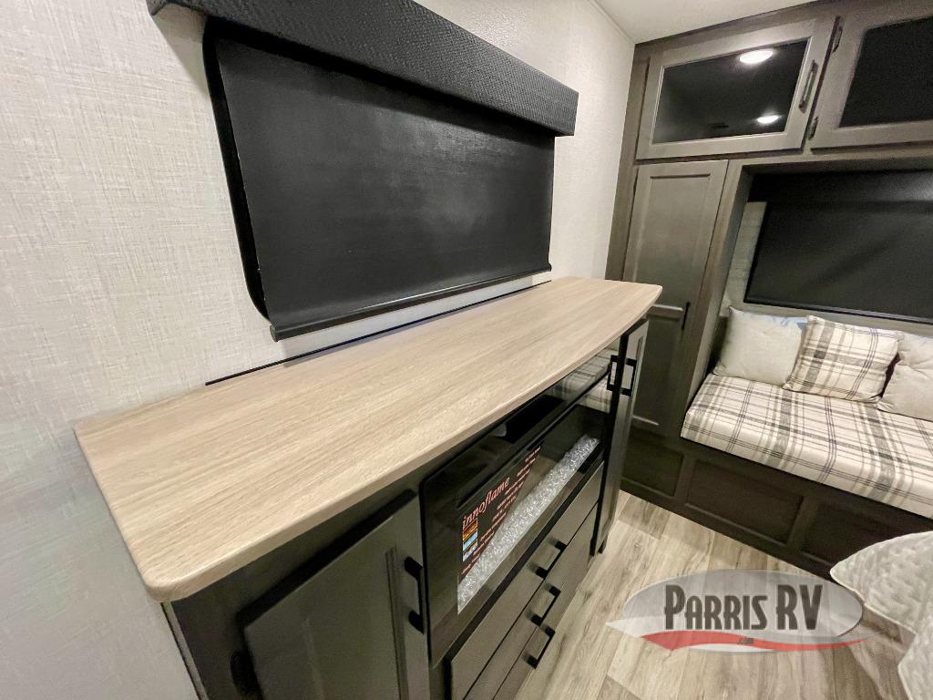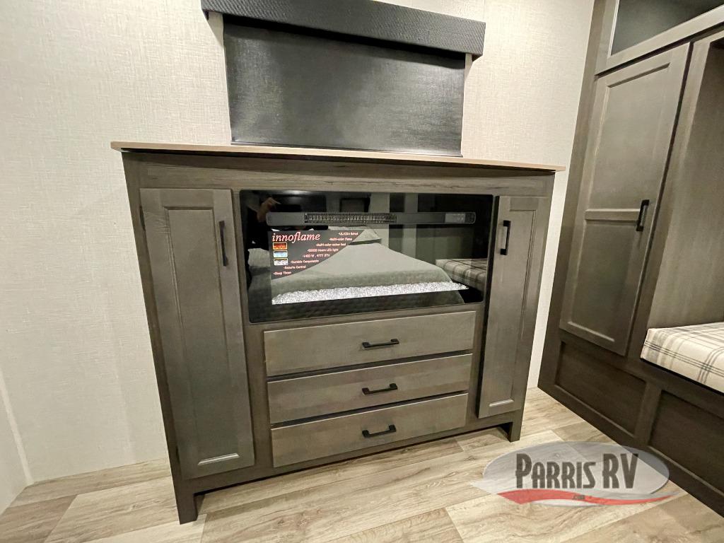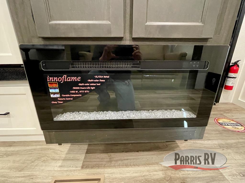 Pack your bags for an adventure of a lifetime with your spouse in this travel trailer! The front private bedroom has a 70" x 80" Sleep Tight king bed slide for more interior space, a dresser with a 30" frameless fireplace and TV, and a window seat to read a book with a view. Freshen up each morning in the rear full bathroom with the 30" x 36" shower, and store your linens in the three door linen closet, then head to the fully equipped kitchen to fry up some eggs on the three burner cooktop. The Sit N' Slide table offers a comfortable place to enjoy your meals, play card games, and even transform into an extra sleeping space. Grab a snack from the walk-in pantry with coat hooks and relax on the 70" tri-fold sofa bed across from the entertainment center with a 30" frameless fireplace!