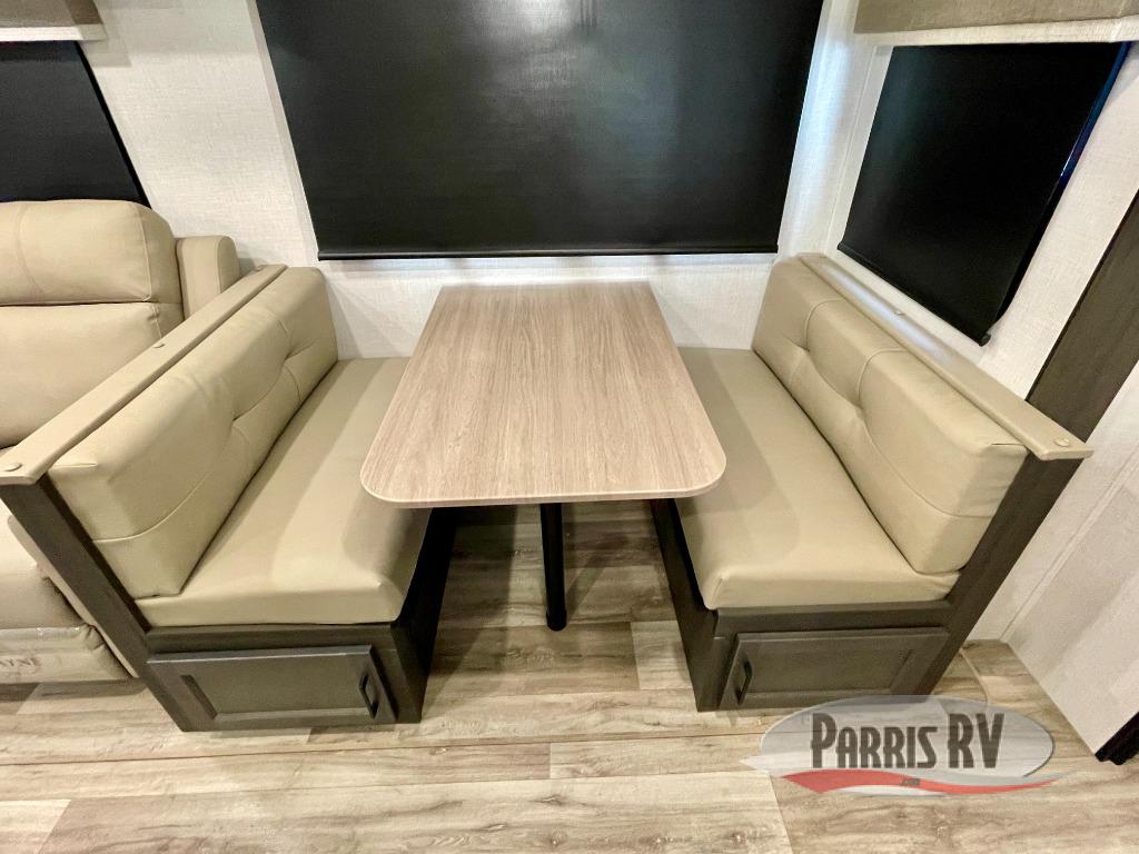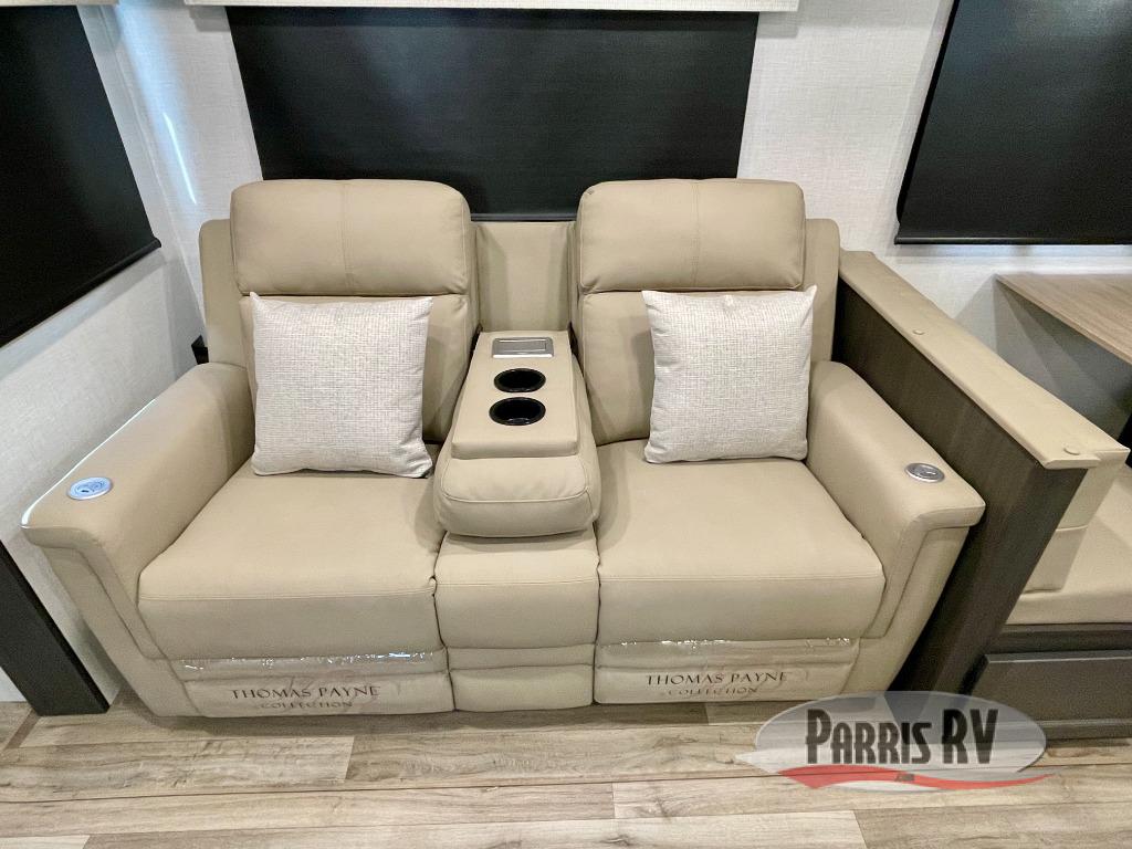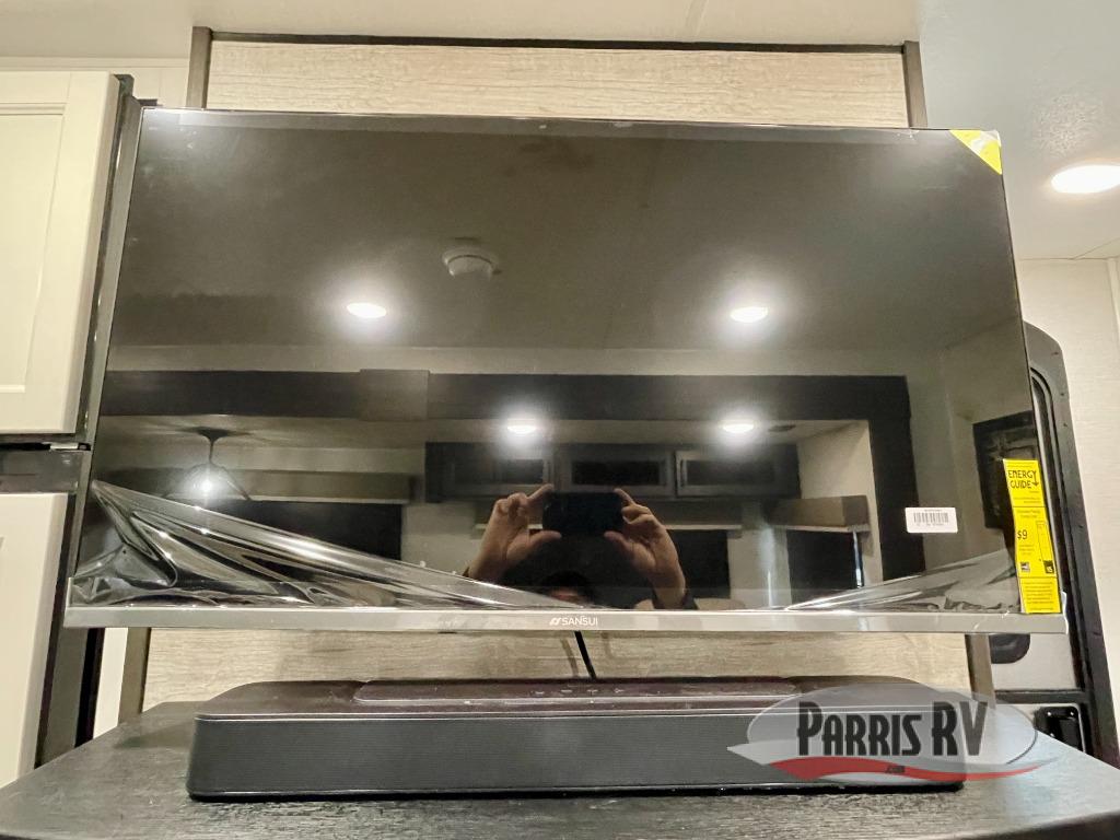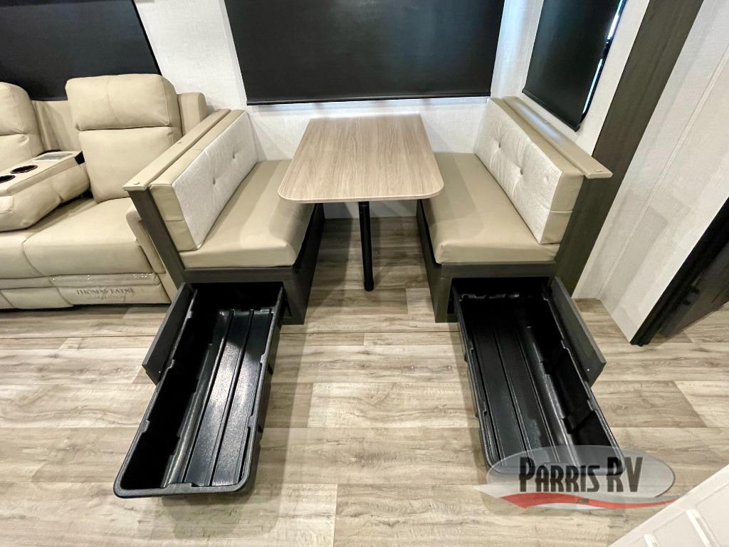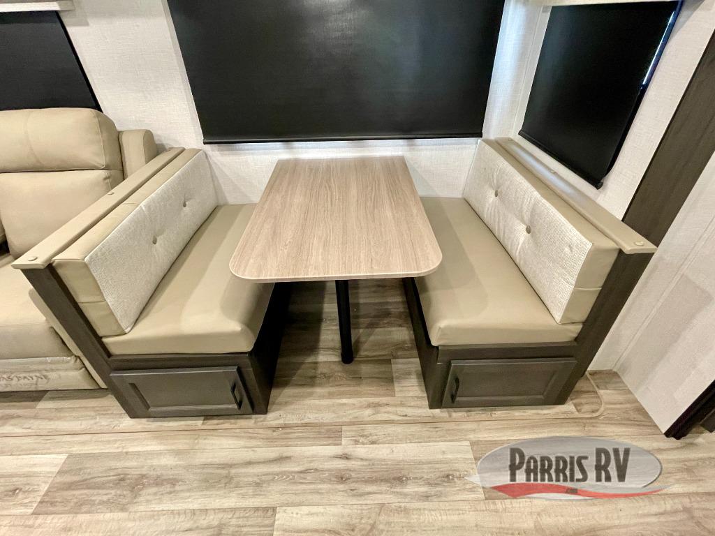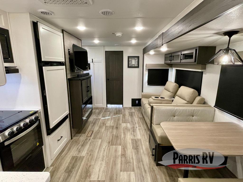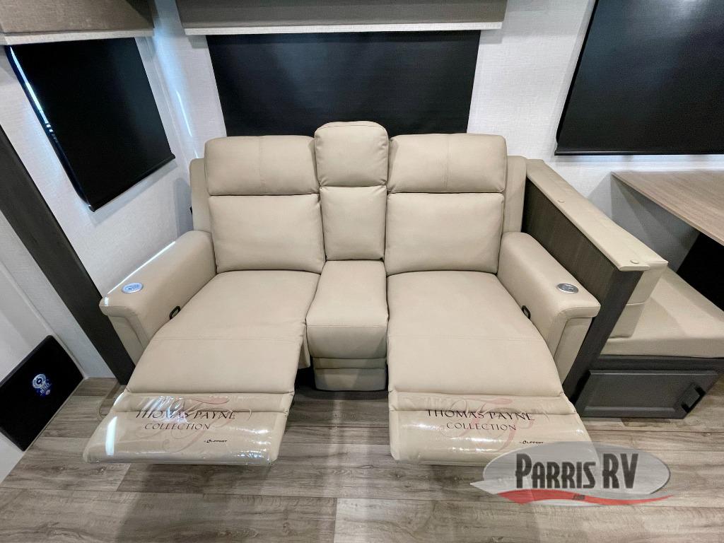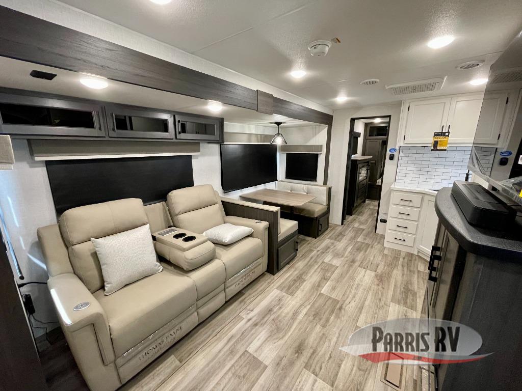Pack your bags for an adventure of a lifetime with your spouse in this travel trailer! The front private bedroom has a 70" x 80" Sleep Tight king bed slide for more interior space, a dresser with a 30" frameless fireplace and TV, and a window seat to read a book with a view. Freshen up each morning in the rear full bathroom with the 30" x 36" shower, and store your linens in the three door linen closet, then head to the fully equipped kitchen to fry up some eggs on the three burner cooktop. The Sit N' Slide table offers a comfortable place to enjoy your meals, play card games, and even transform into an extra sleeping space. Grab a snack from the walk-in pantry with coat hooks and relax on the 70" tri-fold sofa bed across from the entertainment center with a 30" frameless fireplace!