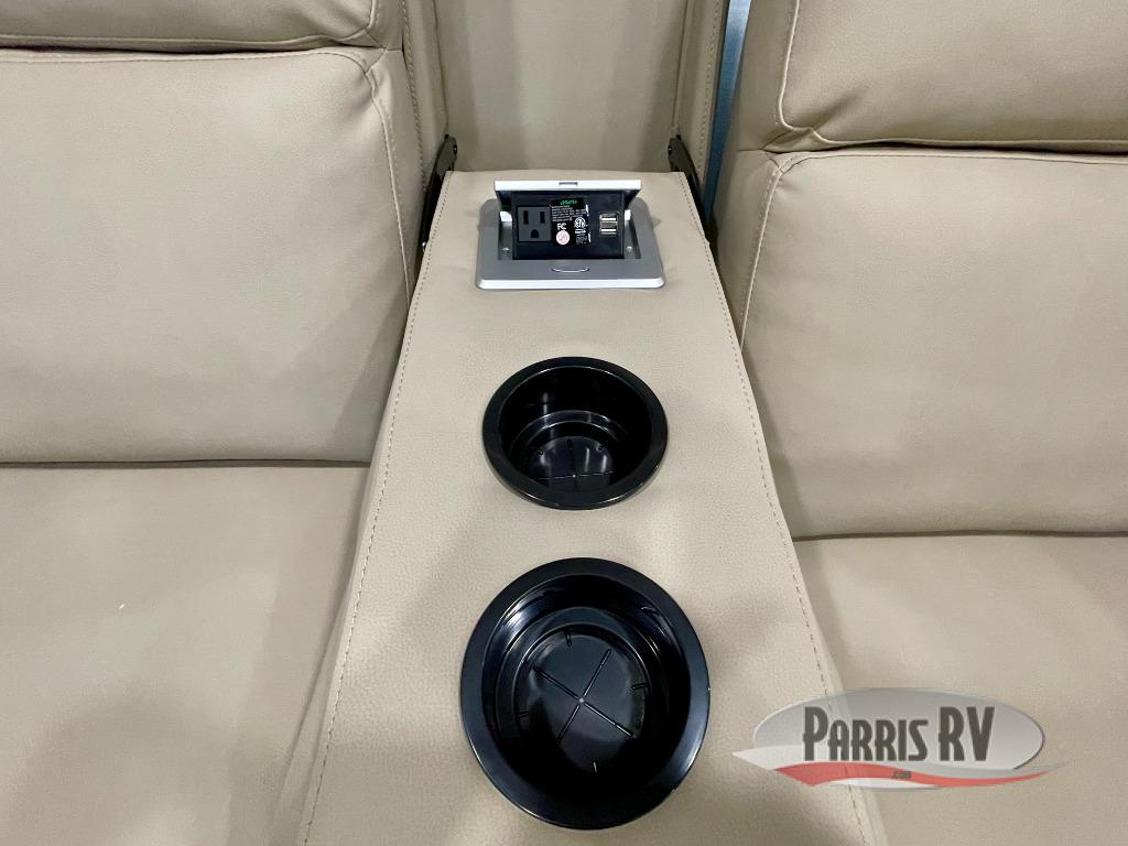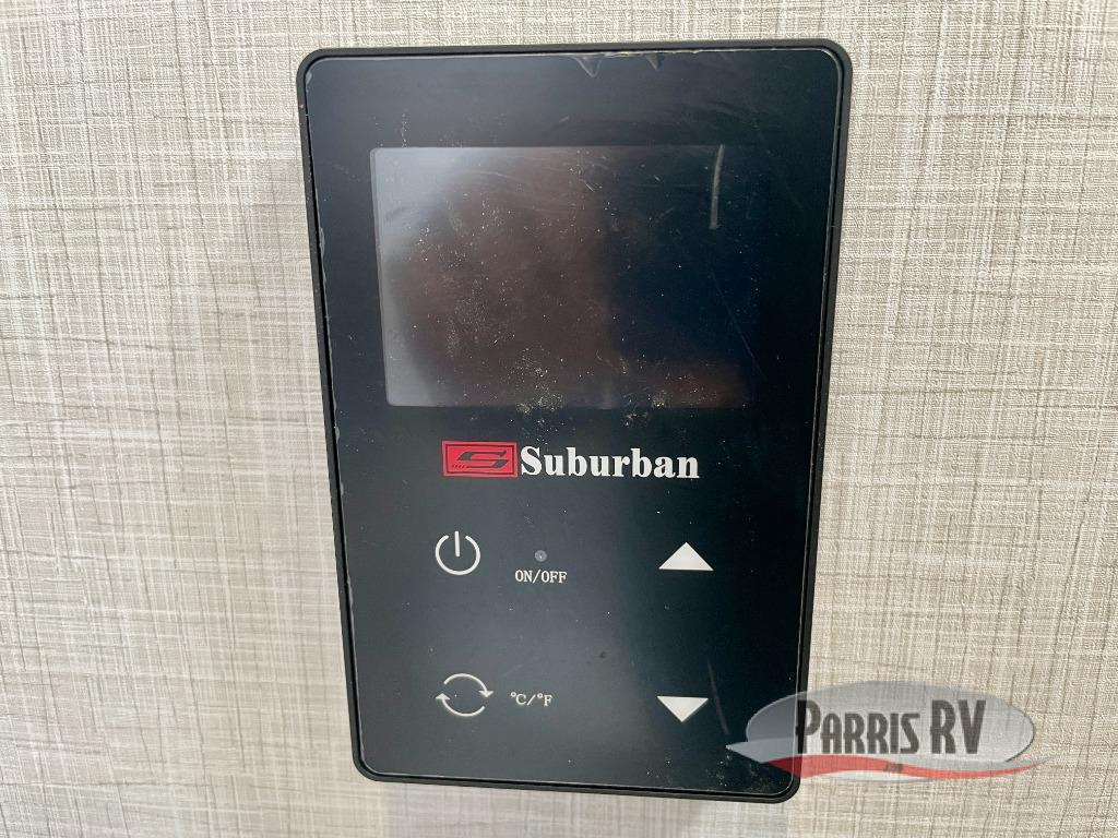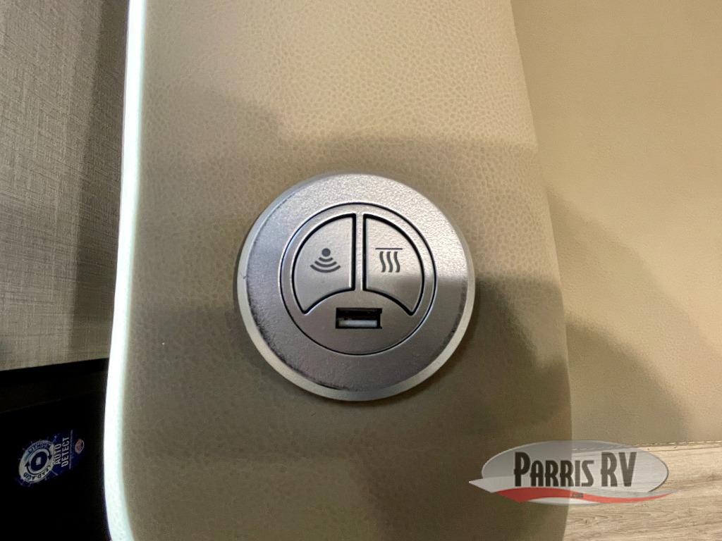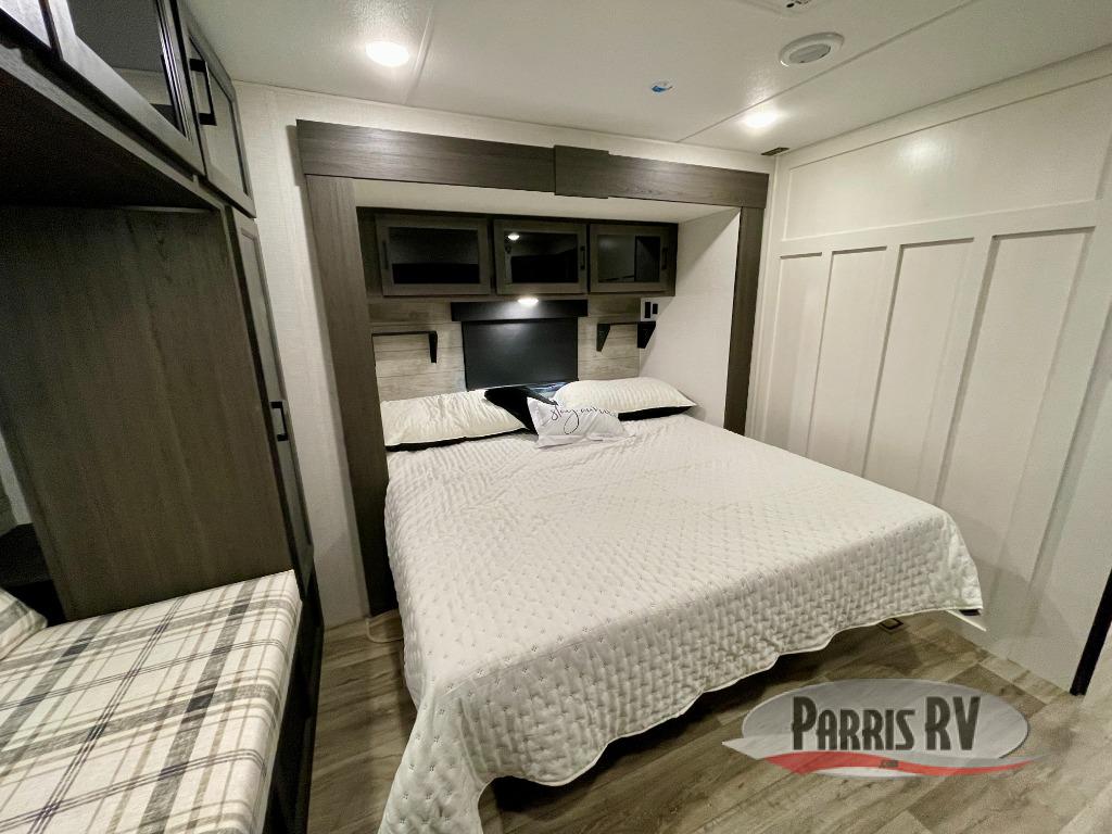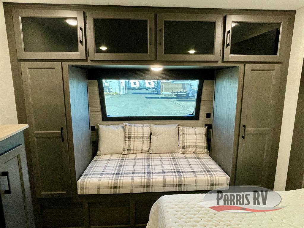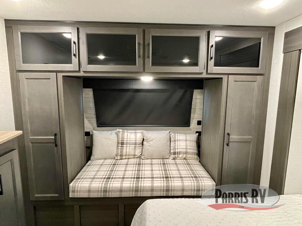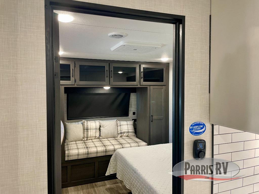 Pack your bags for an adventure of a lifetime with your spouse in this travel trailer! The front private bedroom has a 70" x 80" Sleep Tight king bed slide for more interior space, a dresser with a 30" frameless fireplace and TV, and a window seat to read a book with a view. Freshen up each morning in the rear full bathroom with the 30" x 36" shower, and store your linens in the three door linen closet, then head to the fully equipped kitchen to fry up some eggs on the three burner cooktop. The Sit N' Slide table offers a comfortable place to enjoy your meals, play card games, and even transform into an extra sleeping space. Grab a snack from the walk-in pantry with coat hooks and relax on the 70" tri-fold sofa bed across from the entertainment center with a 30" frameless fireplace!