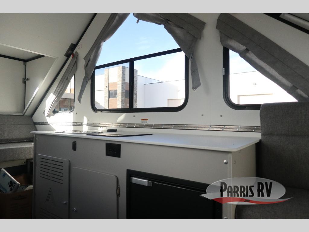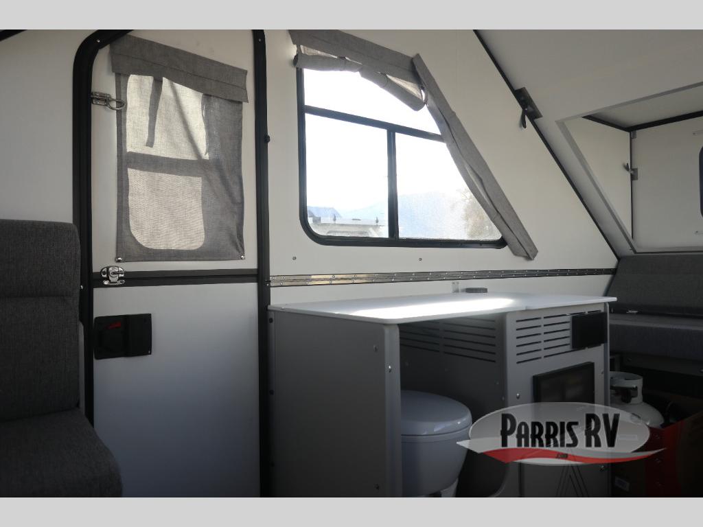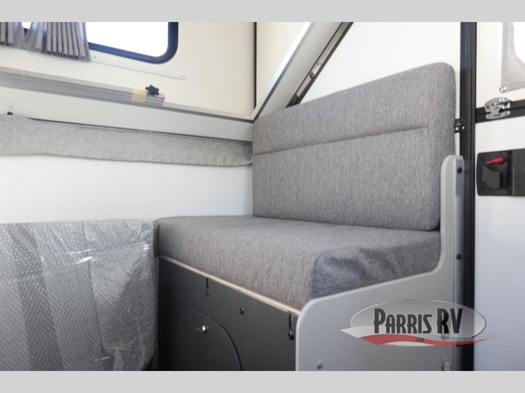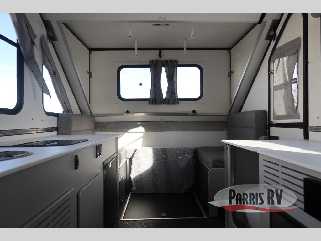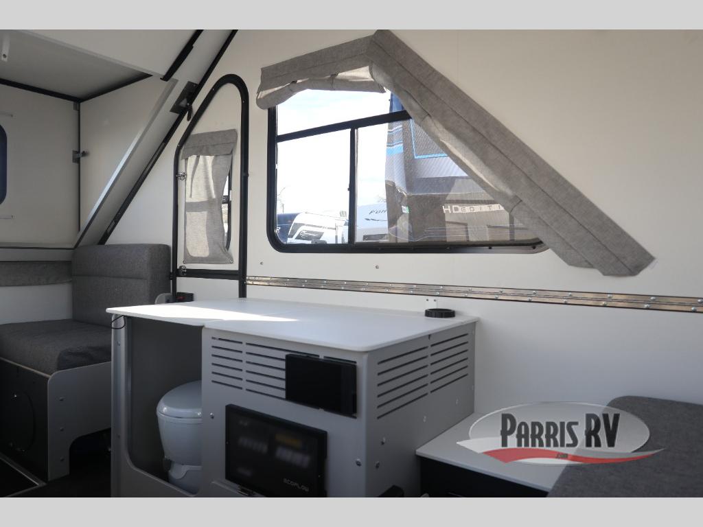 This A-frame camper is ready for off-grid fun when you are! There is a front and rear hard dormer, a high wind lift assist, plus exterior baggage doors. The front dinette converts to a 40" x 80" bed, and the rear sofa bed converts to a 60" x 80" queen-size bed so you can sleep four each night. You'll appreciate storage under the dinette seats for board games and extra knickknacks. An induction cooktop will let you make meals each day and a 3.2 cu. ft. 12V refrigerator will keep your food fresh. Another convenience is the swivel cassette toilet and interior hidden shower under the dinette so you can freshen up each day!