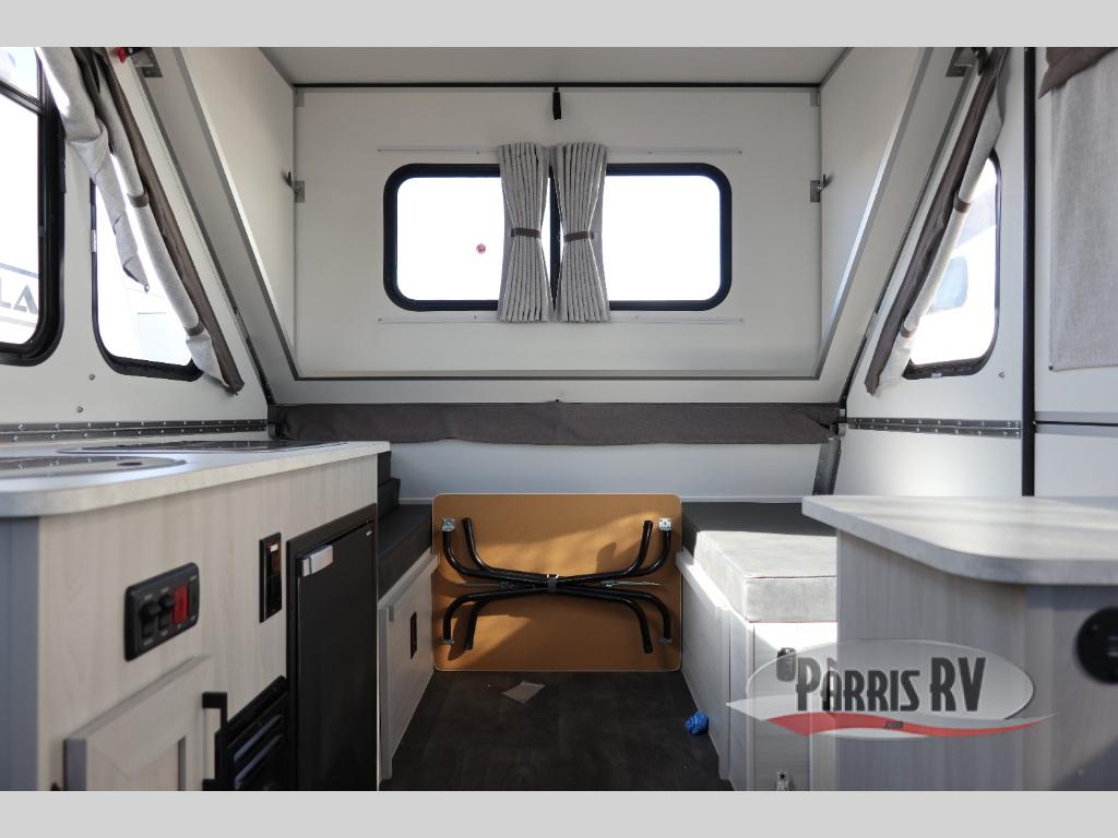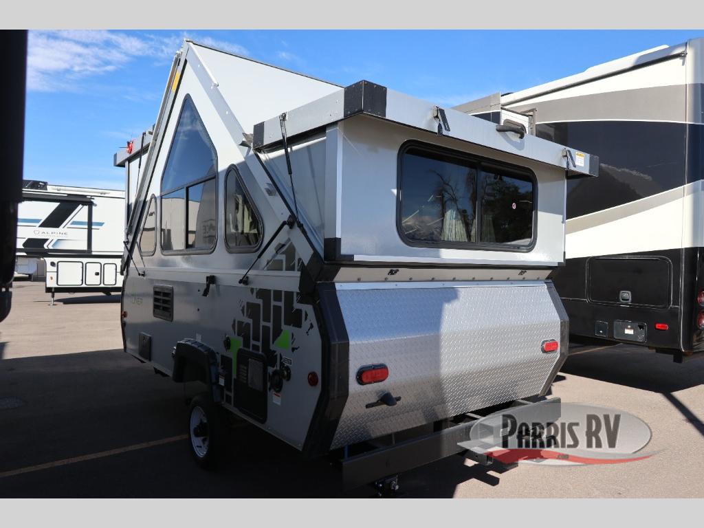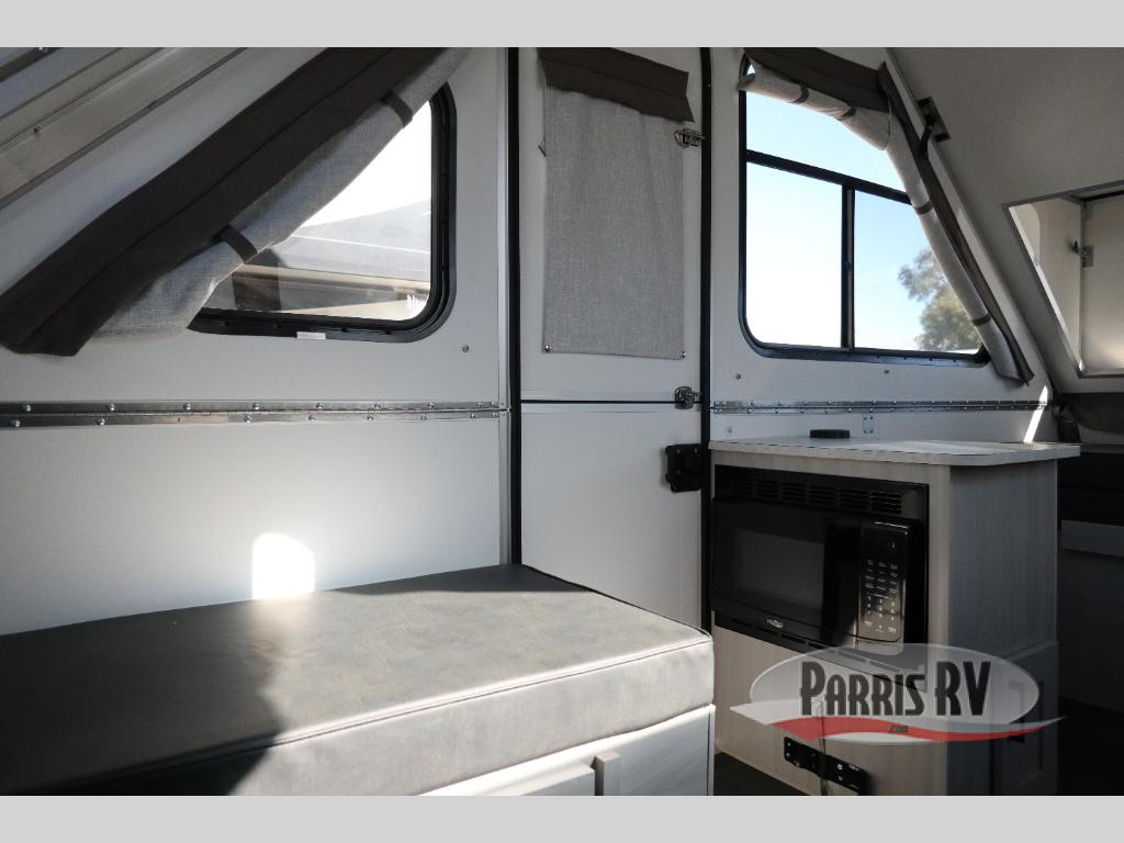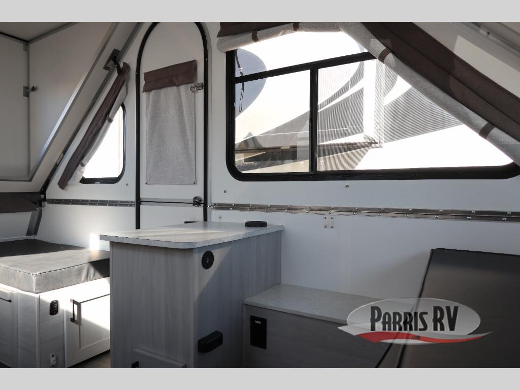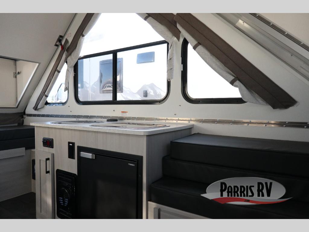 Camping has never been easier than in this A-frame camper. Once you arrive at your destination, grab your gear from the two exterior baggage doors, then head inside to make lunch on the two-burner stove top. The sofa bed can convert to a 60" x 76" bed, and the dinette converts to a 46" x 76" bed for comfortable sleeping space at night. You will also enjoy LED interior lights and electrical outlets to keep you charged up, and there is plenty of storage for your camp gear. And an optional front and/or rear hard dormer can be added if you want additional standing space!