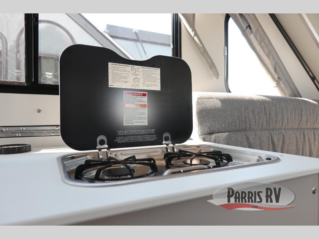Don't wait another minute; head to the campground in this camper today! There is a two burner cooktop to make lunch on and a 3.0 cu. ft. 3-way refrigerator with a freezer for your cold items, and you can add the optional outside grill if you like to cook outdoors! The sofa bed converts to a queen-size bed and the dinette also converts to a queen-size bed or dual bunks. You'll find storage space under the dinette and on the two shelves, and there is a 32" x 32" hidden shower under the dinette so you can clean up each day. This model also has a dry weight of 2,400 lbs. for easy towing!