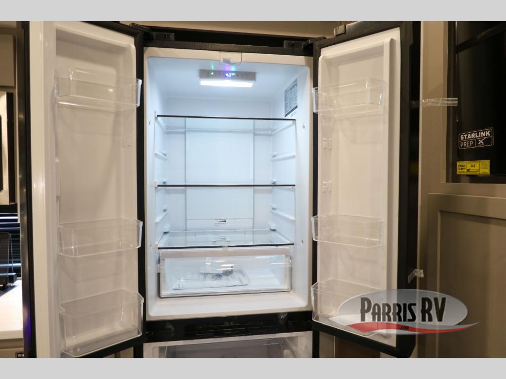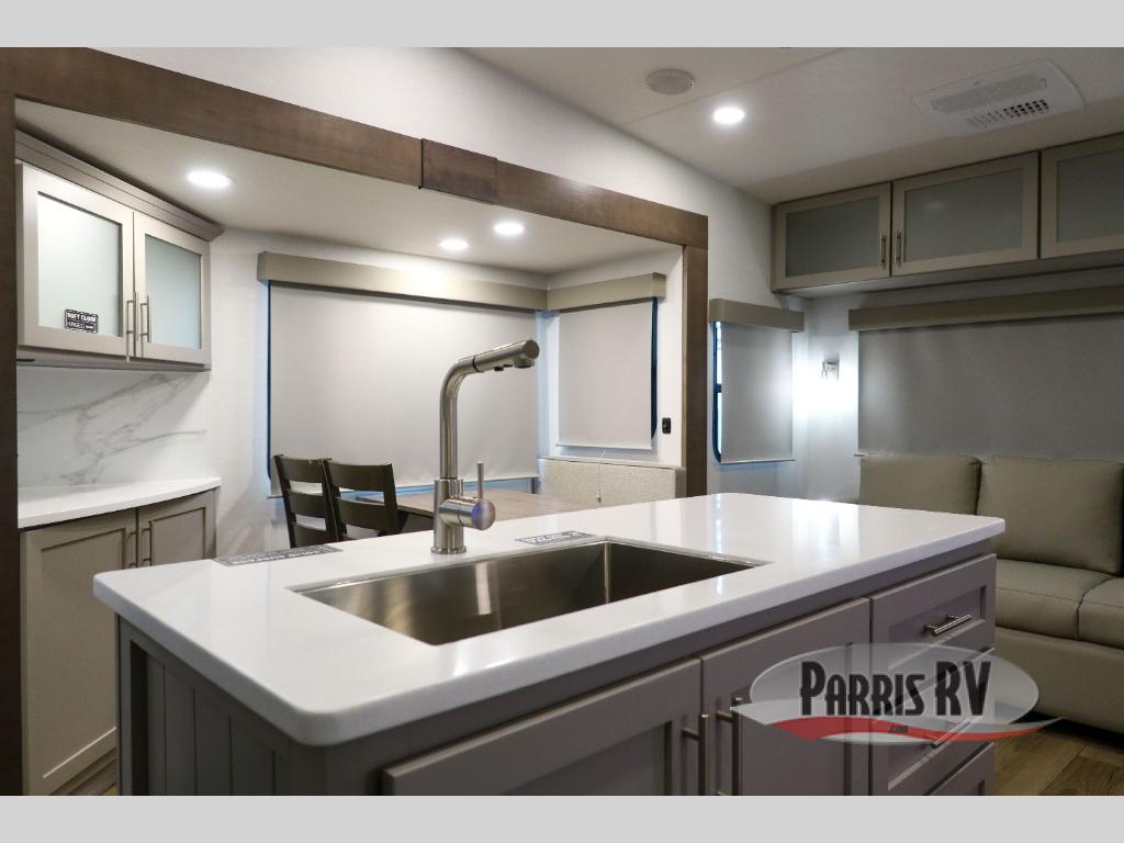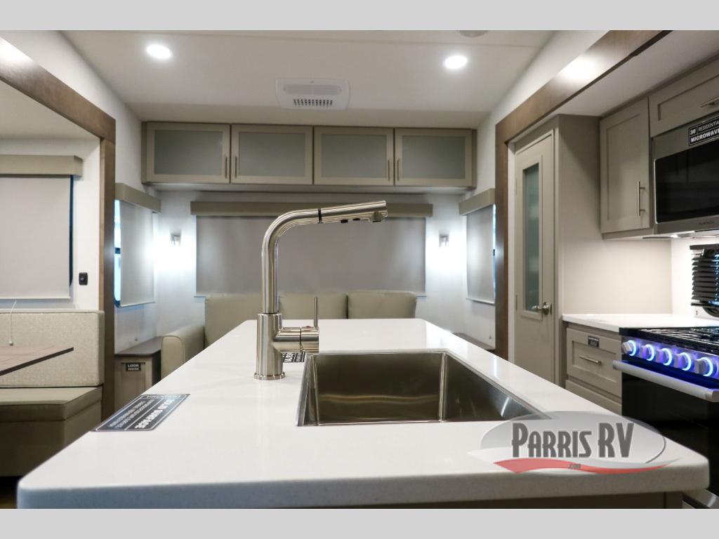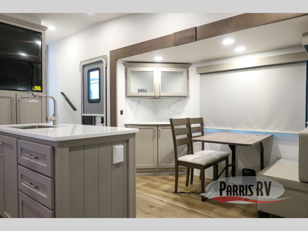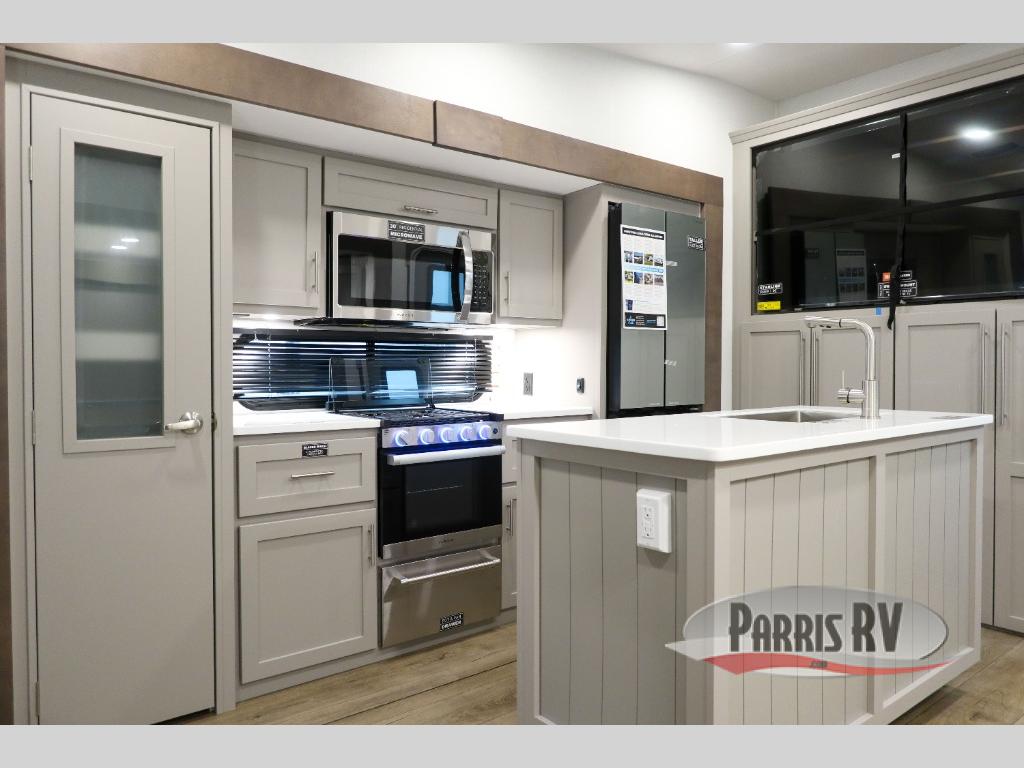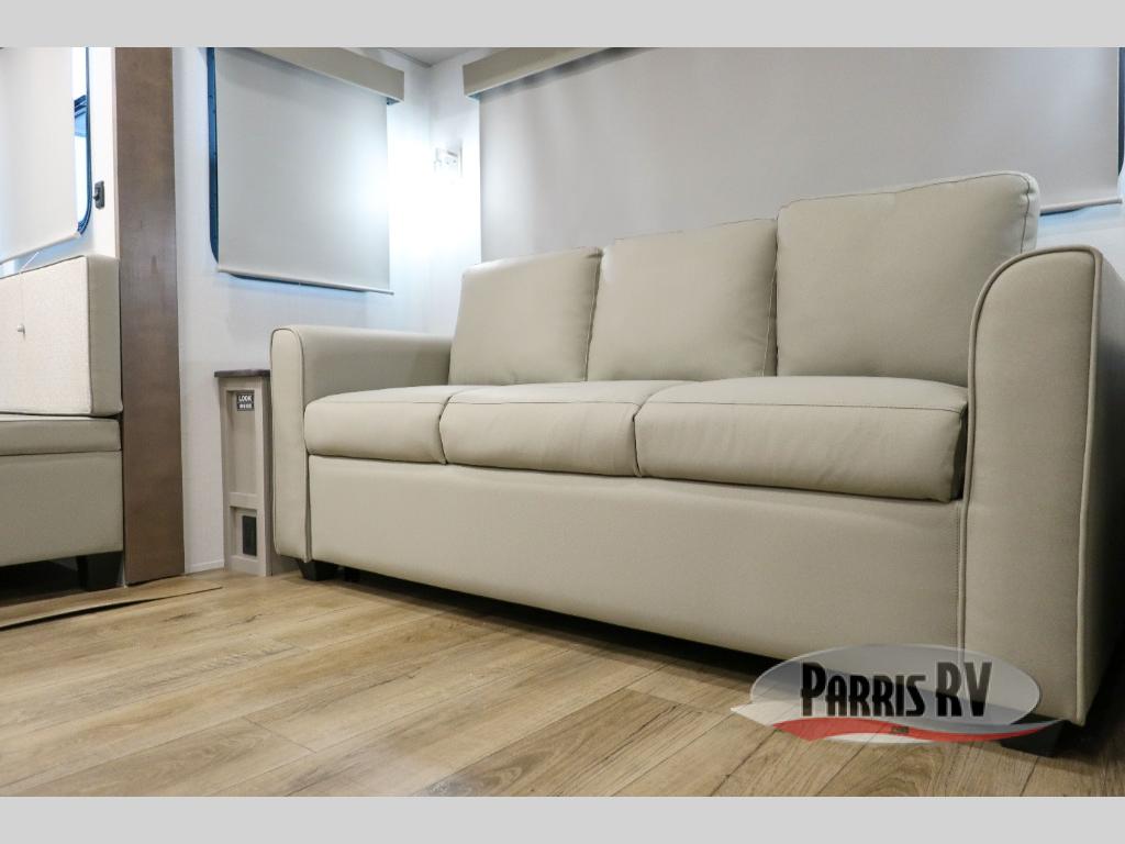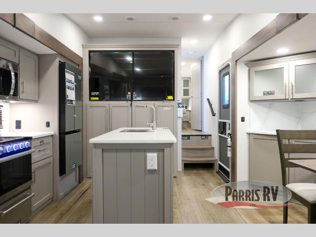 Perfect for families, couples, and travelers who crave space and style. The heart of this fifth wheel is the spacious living area, featuring a tri-fold sleeper sofa that's perfect for lounging and sleeping. Gather around the table with chairs and a bench for meals or socializing. The kitchen is fully equipped with a kitchen island, pantry, hutch, and overhead cabinets, providing ample storage and counter space. The microwave and 10 cu 12V refrigerator ensure that meal preparation and storage are convenient and easy. The full bathroom offers a private space for personal care, ensuring a comfortable and refreshing experience, and the front bedroom is a peaceful retreat, featuring a queen bed, nightstands, and overhead storage.