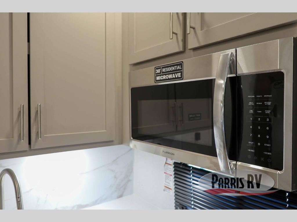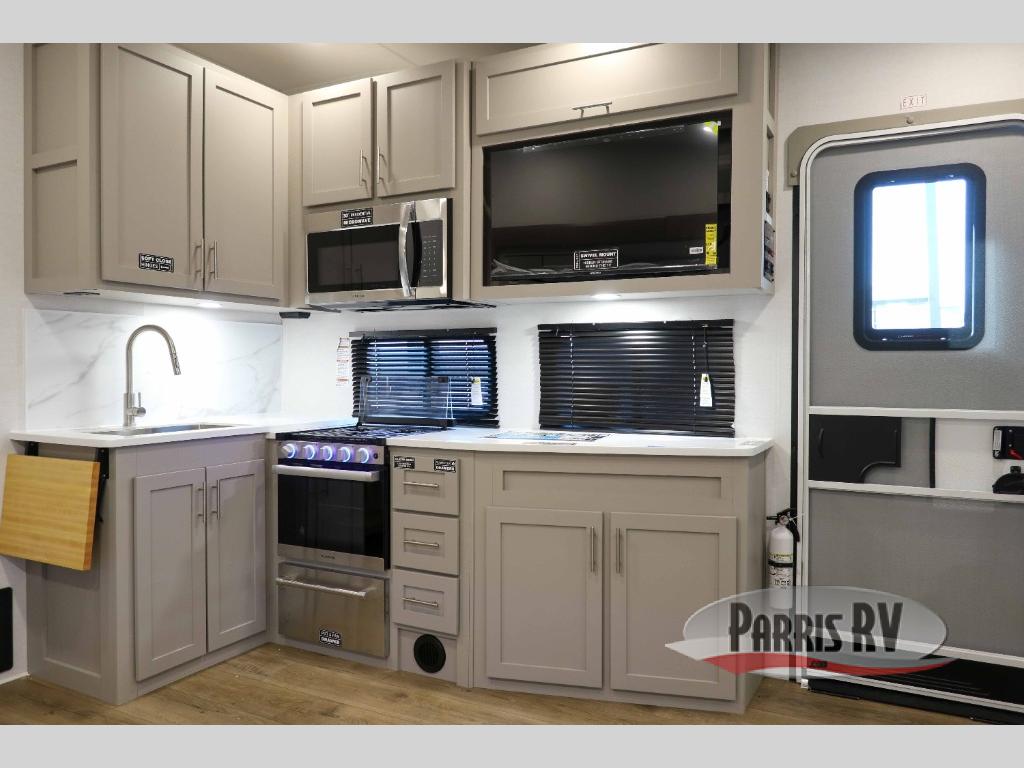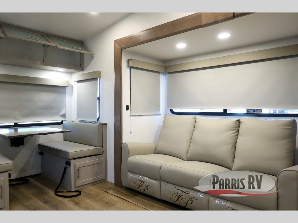 Escape to your favorite destinations with your favorite person in this fifth wheel! The front private bedroom has a queen bed with nightstands on either side to set a glass of water on, and a wardrobe to keep your clothes looking nice. Freshen up each morning in the full bathroom with a 30" x 36" shower, and grab a towel stored close by in the linen closet. Now that you're ready for the day, you can head to the kitchen and grab some eggs from the 10 cu. ft. 12V refrigerator to fry up using the three burner cooktop, plus there is a flip-up butcher block to make dinner prep easier. Spend your evenings in true relaxation seated on the sofa slide out across from the swing mount 40" HDTV. You also have a rear booth dinette with overhead storage!