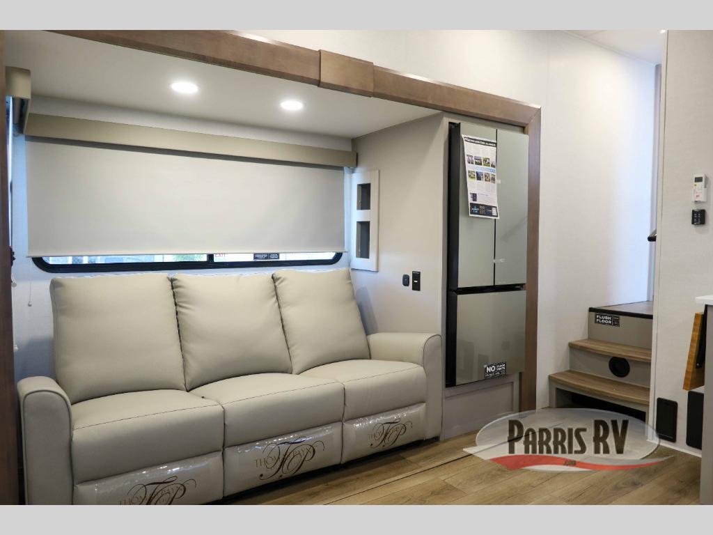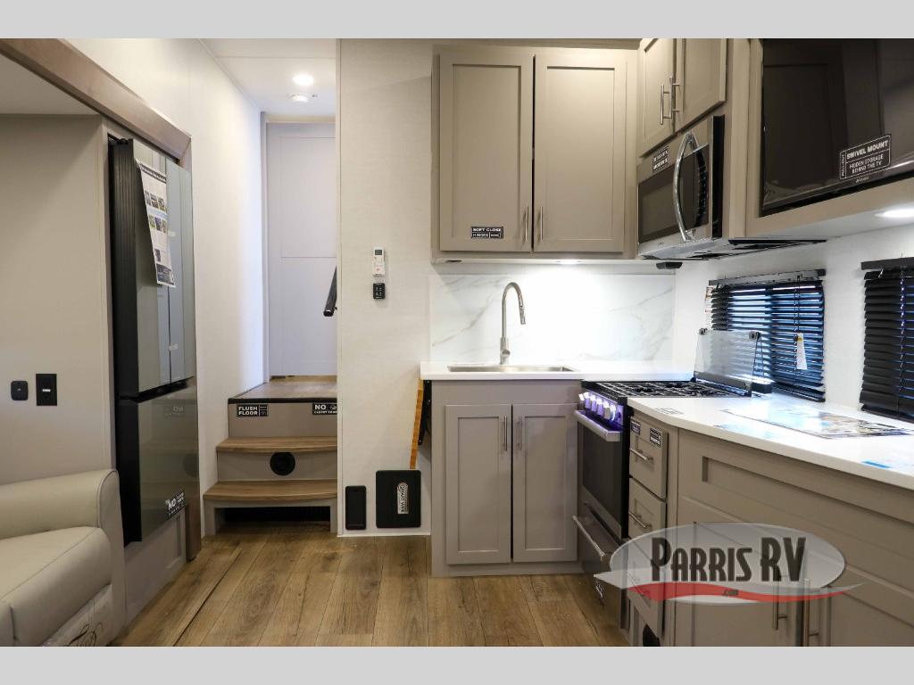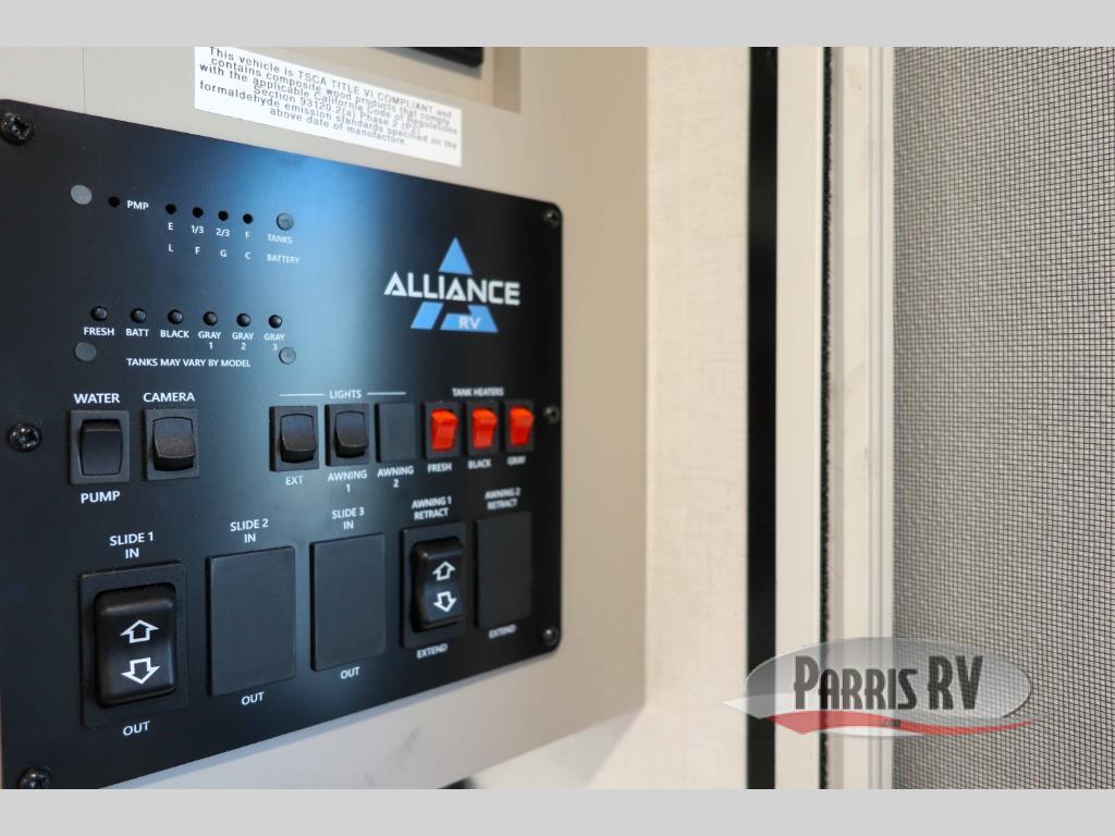 A benchmark chassis creates a space saver upper deck with each one of these Avenue All-Access fifth wheels by Alliance RV! The 101 in. wide-body construction gives you more room to walk around and the flush slide out floors throughout prevent any tripping. There are Azdel composite sidewalls inside and out, and a seamless fully walkable PVC roof for extreme durability and zero maintenance. You are sure to love no carpet throughout making each Avenue All-Access easy to clean and allergen free, not to mention pet friendly. You can maximize your space throughout with innovative storage solutions like the hidden storage behind the TV, inside the end tables, ottoman, and dinette chairs. These units also include the OTG Solar Package with a 200 watt solar panel, 15 amp MPPT charger, multiple outlets, and more to keep you powered up!