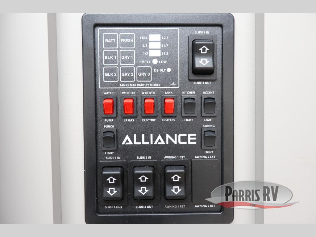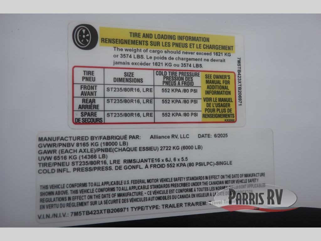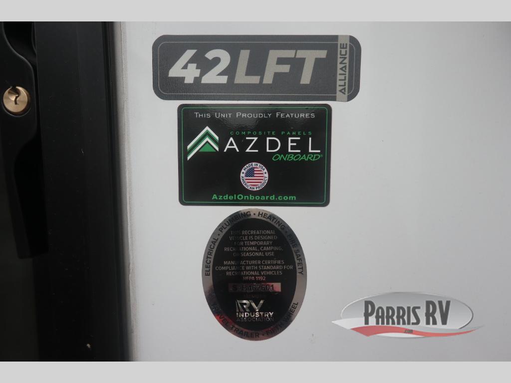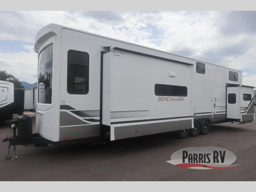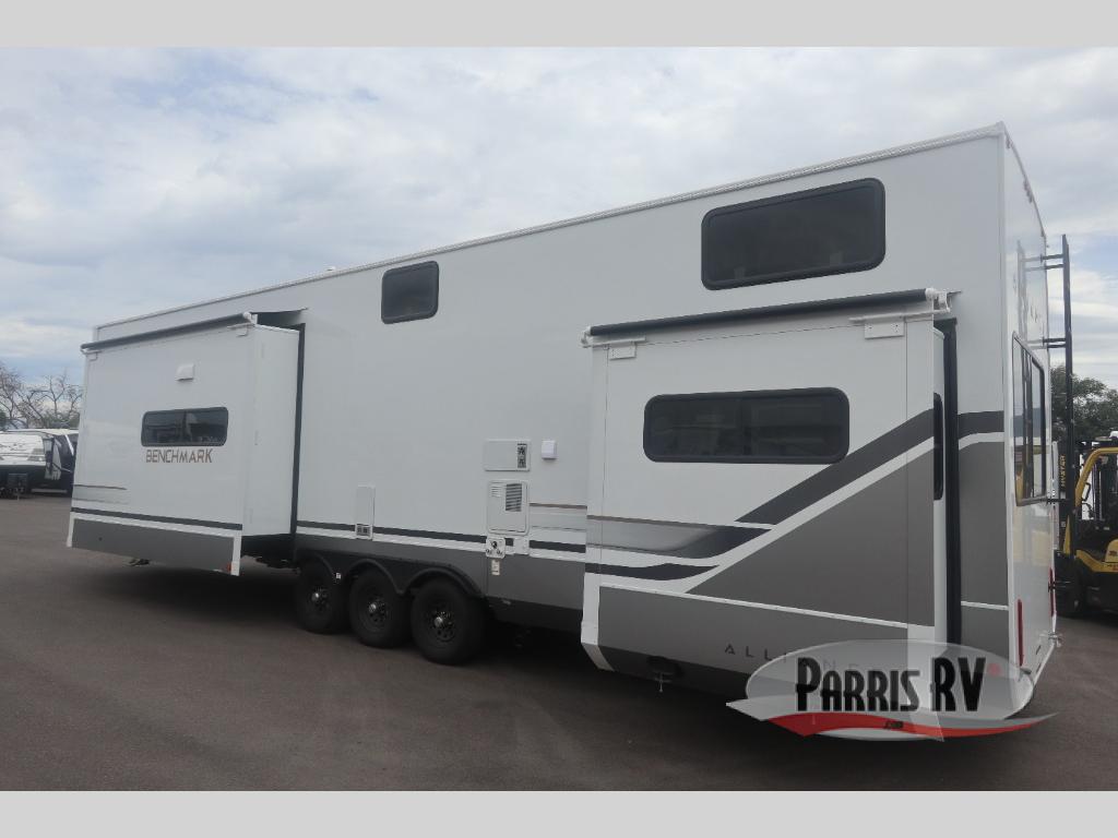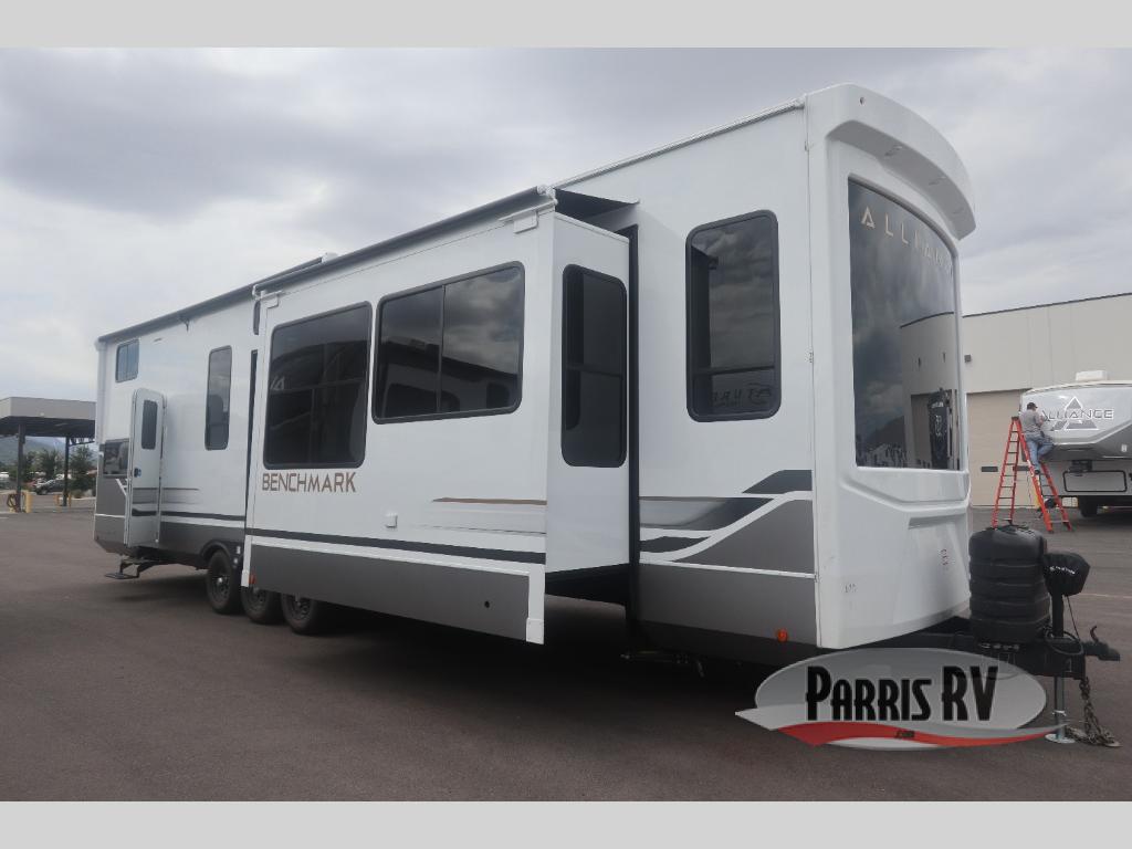 With any Benchmark destination trailer by Alliance RV, you will enjoy luxury features at every turn! The high gloss fiberglass exterior is ultra sleek, and the Azdel composite fiberglass sidewalls add durability so you can camp for years to come. You'll also find a residential exterior garden hose connection outside, along with a powder coated aluminum rear ladder, and an auxiliary LP tank hook up if you want to bring your grill along. Head inside to find hardwood cabinetry, solid surface countertops throughout, oversized windows in all rooms, and MCD roller shades throughout. The 45,000 BTU A/C and 60,000 BTU furnace will keep you comfortable year around, and there is a stackable washer and dryer to make full-time RV living easier than ever!