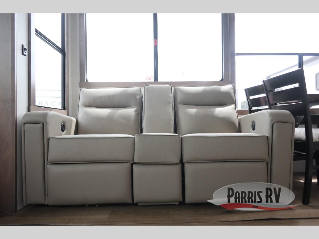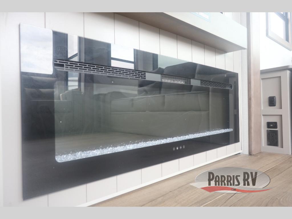 This destination trailer with a loft will be a favorite with the little ones! They will have three bunk mats to choose from plus wardrobes to keep their things picked up. You can take the rear private bedroom that includes a power tilting king bed that will allow you to sit up in bed at night to read. There is also a wardrobe, a dresser with a 32" TV, and a stackable washer and dryer to make laundry day easier than ever. A full bath with a 48" x 30" shower will let you freshen up each day, and there is a linen closet to keep clean towels close by. Everyone will enjoy spending time together in the front living area that includes a two dual recliner theater seats, a 50" TV and fireplace, and hidden storage for games or books. The chef of your group can make meals each day on the residential range and microwave, and there is a 110V Samsung refrigerator to keep your food fresh.
