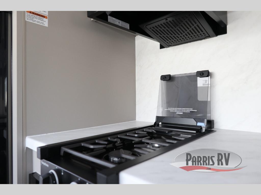 This compact, yet feature-packed travel trailer offers smart design and comfort throughout. Step inside through the 28" entry to find a front queen bed that easily converts into a 60" jackknife sofa, flanked by wardrobe nightstands for your clothes and essentials. The central kitchen is equipped with a 10-cu. ft. refrigerator, two-burner cooktop, sink, and overhead storage, while a booth dinette across from it offers dining space and a clear view of the 32-inch TV. At the rear, enjoy the convenience of a full bathroom with a spacious 30" x 36" shower, a sink with linen shelves, and additional overhead compartments for organized storage.