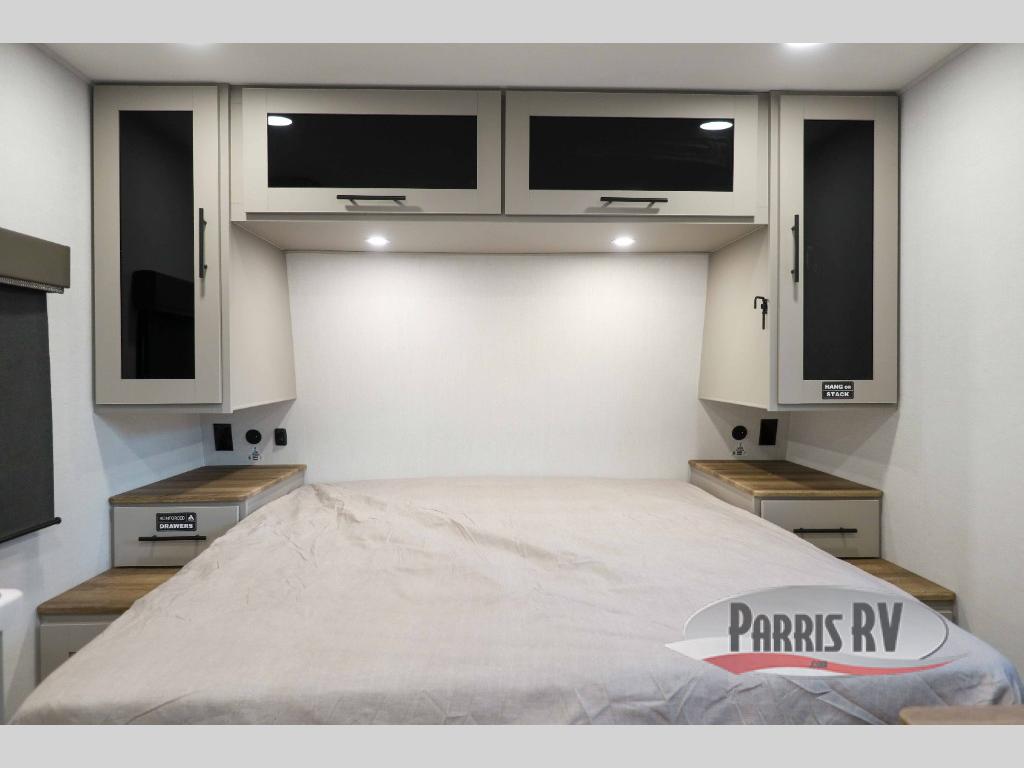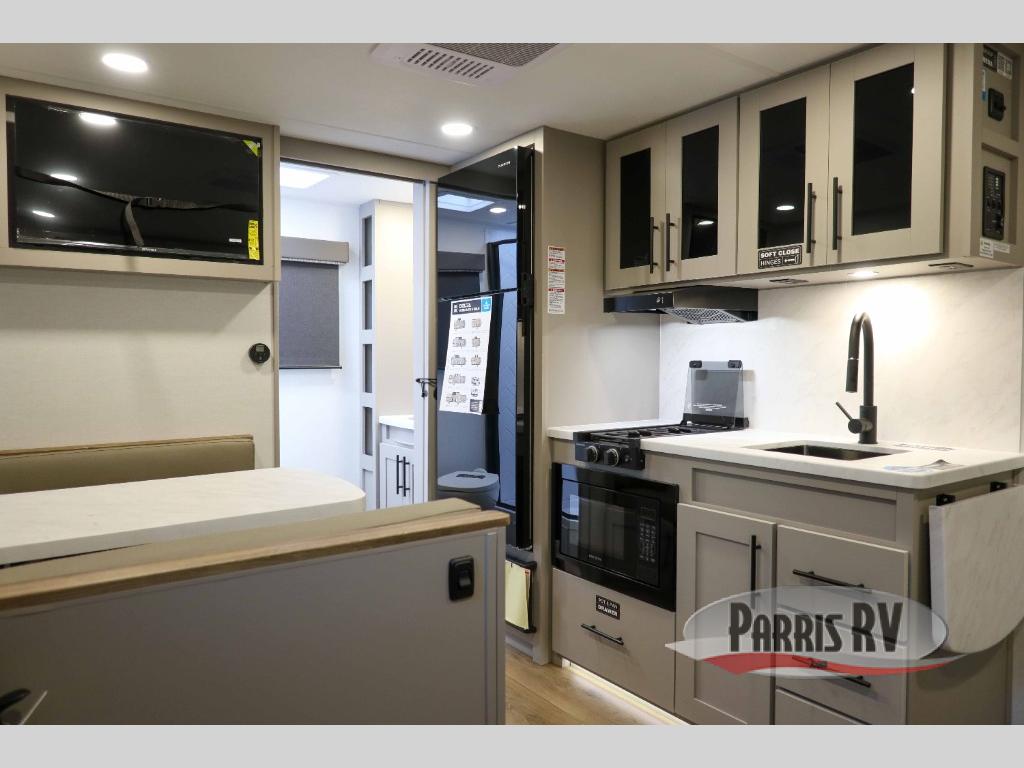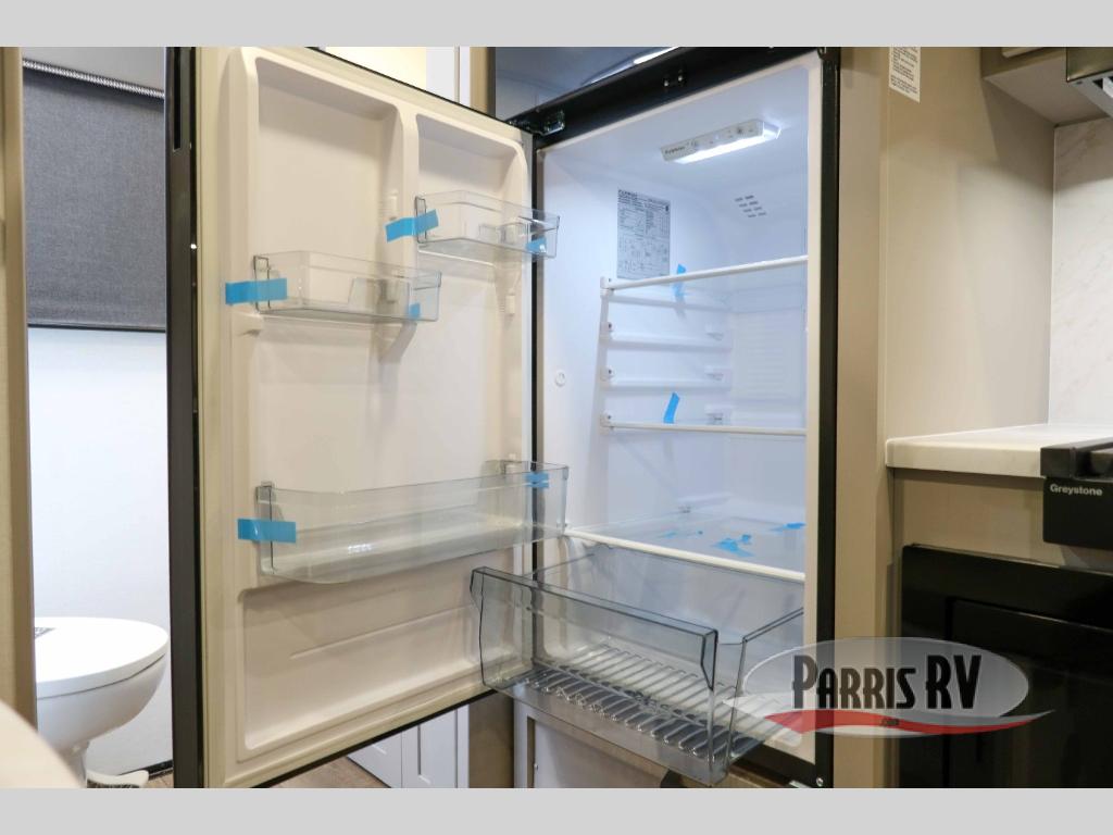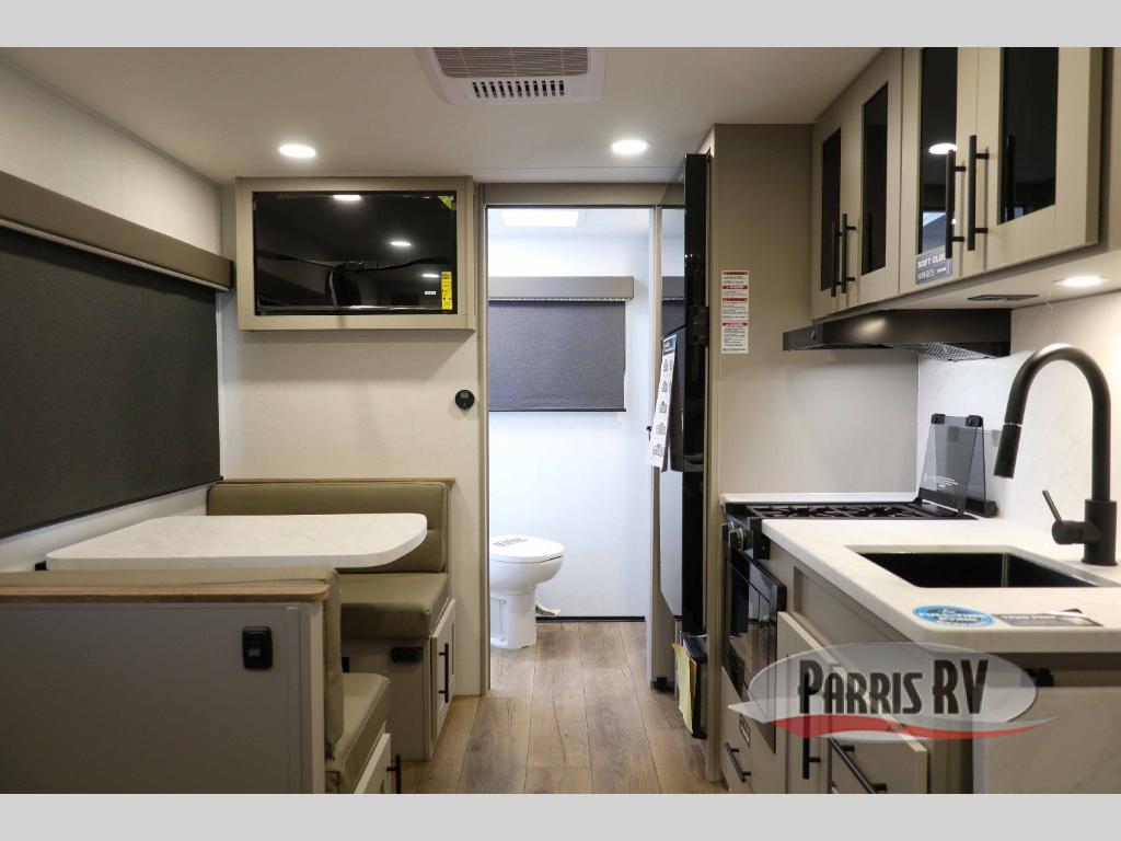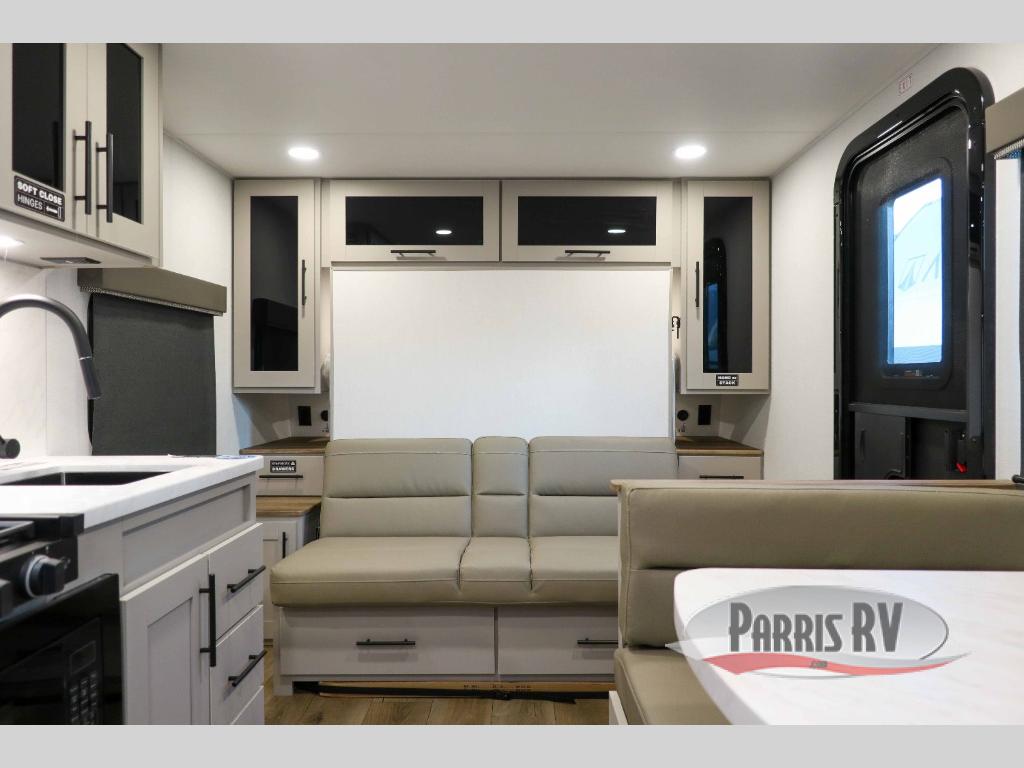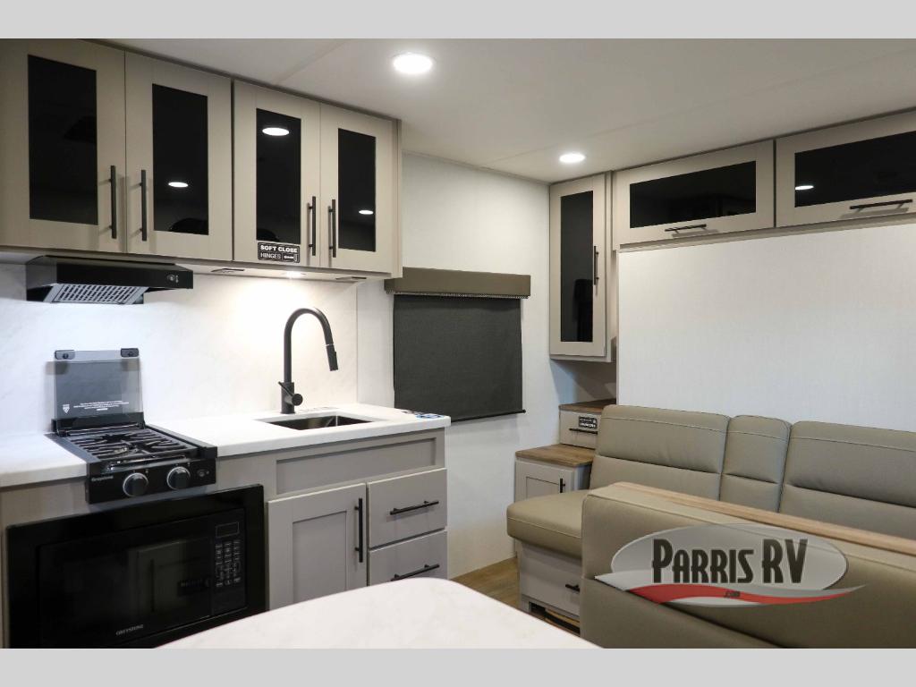 This compact, yet feature-packed travel trailer offers smart design and comfort throughout. Step inside through the 28" entry to find a front queen bed that easily converts into a 60" jackknife sofa, flanked by wardrobe nightstands for your clothes and essentials. The central kitchen is equipped with a 10-cu. ft. refrigerator, two-burner cooktop, sink, and overhead storage, while a booth dinette across from it offers dining space and a clear view of the 32-inch TV. At the rear, enjoy the convenience of a full bathroom with a spacious 30" x 36" shower, a sink with linen shelves, and additional overhead compartments for organized storage.
