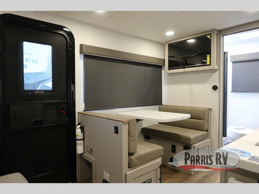 This compact, yet feature-packed travel trailer offers smart design and comfort throughout. Step inside through the 28" entry to find a front queen bed that easily converts into a 60" jackknife sofa, flanked by wardrobe nightstands for your clothes and essentials. The central kitchen is equipped with a 10-cu. ft. refrigerator, two-burner cooktop, sink, and overhead storage, while a booth dinette across from it offers dining space and a clear view of the 32-inch TV. At the rear, enjoy the convenience of a full bathroom with a spacious 30" x 36" shower, a sink with linen shelves, and additional overhead compartments for organized storage.